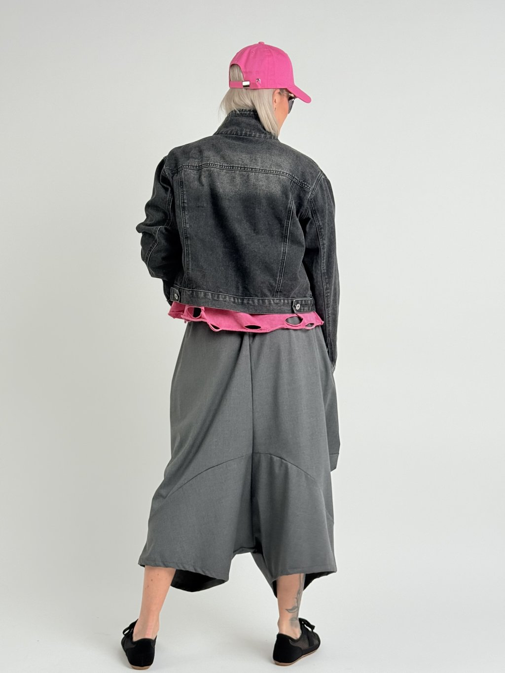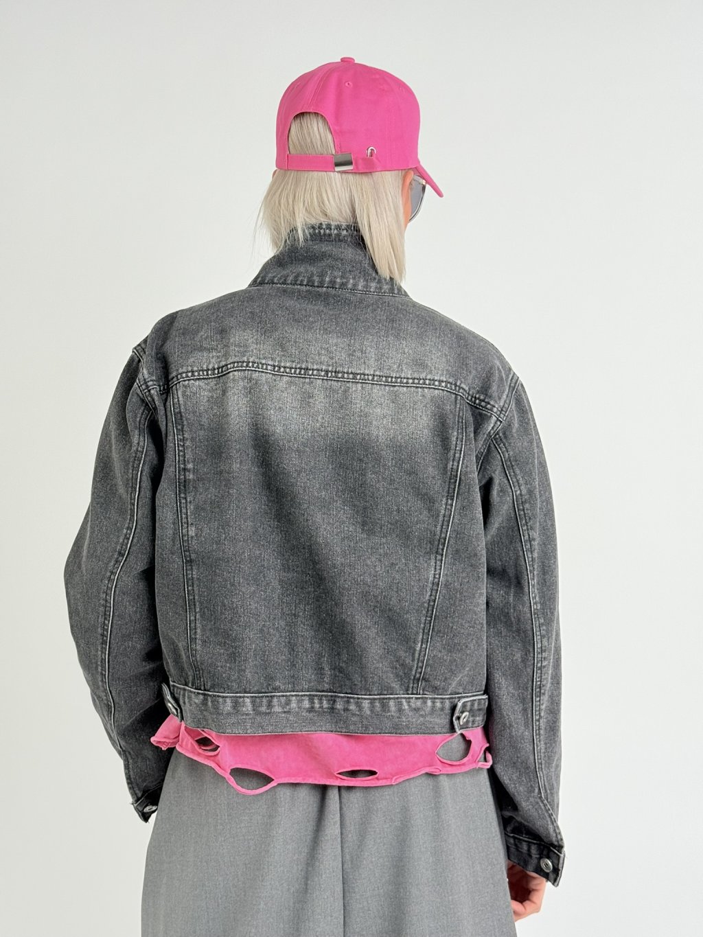 Klasická, džínová, nepružná bunda s mírně prodlouženým předním dílem, kapsami na prsou, límečkem, kovovými knoflíky na zapínání a postranními kapsami.