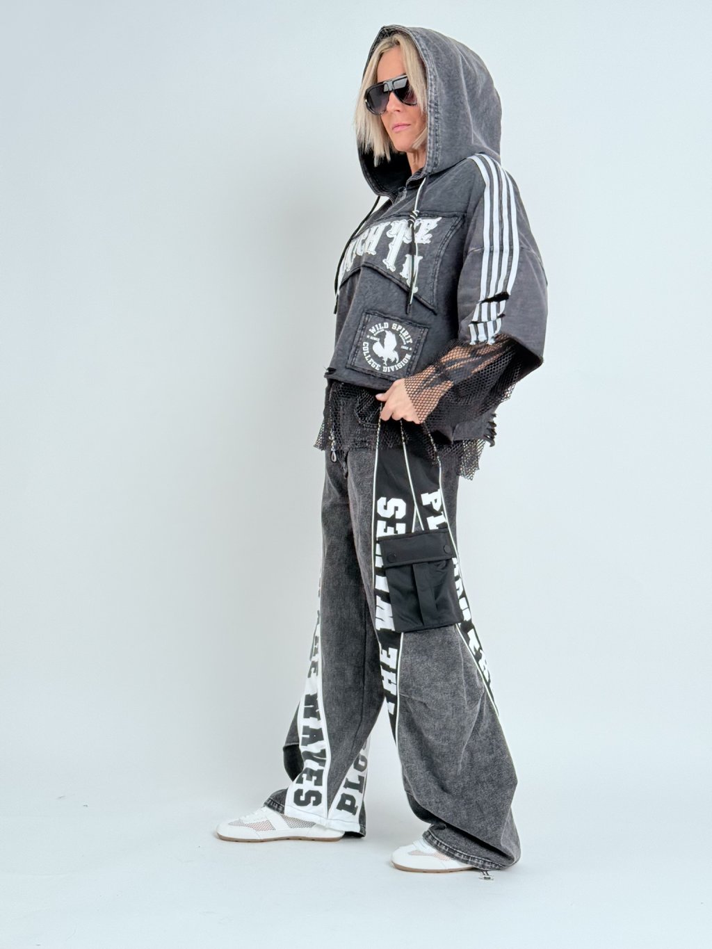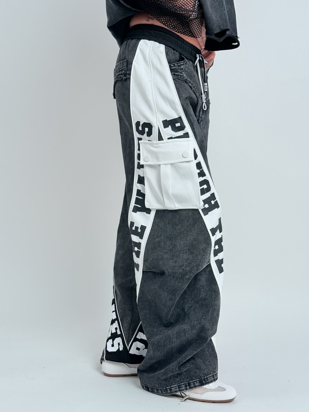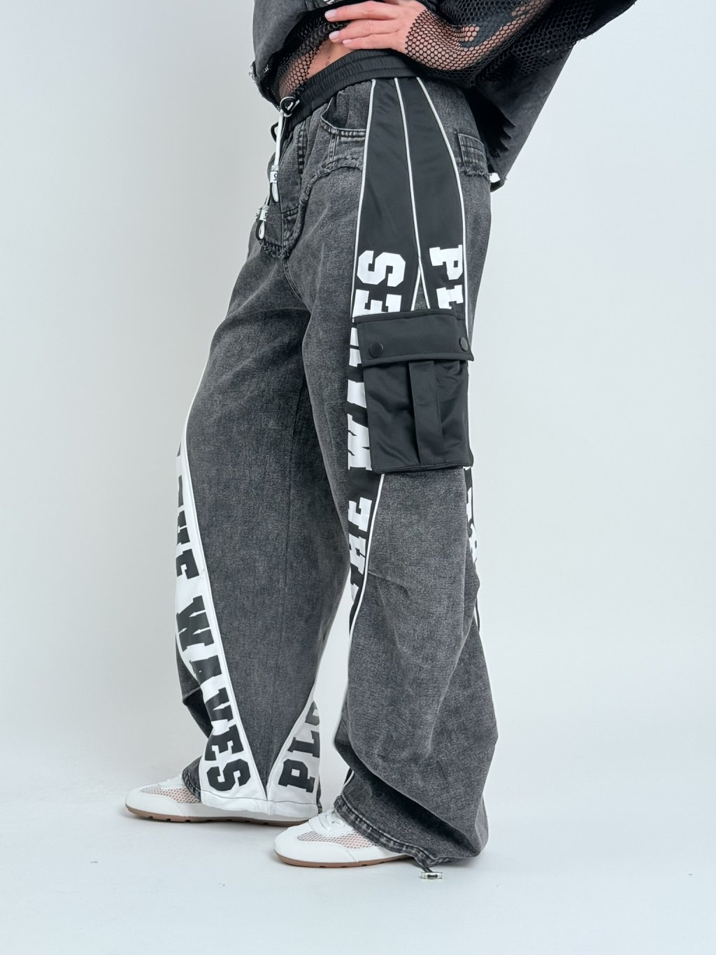 Zajímavě řešené džíny v balonovém střihu, s lampasy i nápisy, na konci nohavic i v pase na stažení.