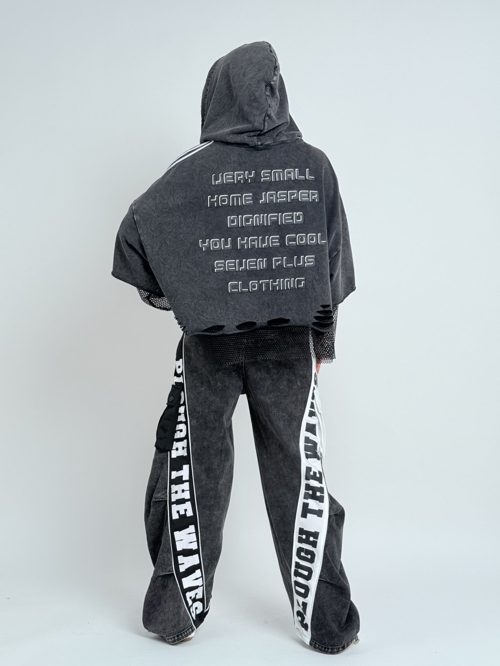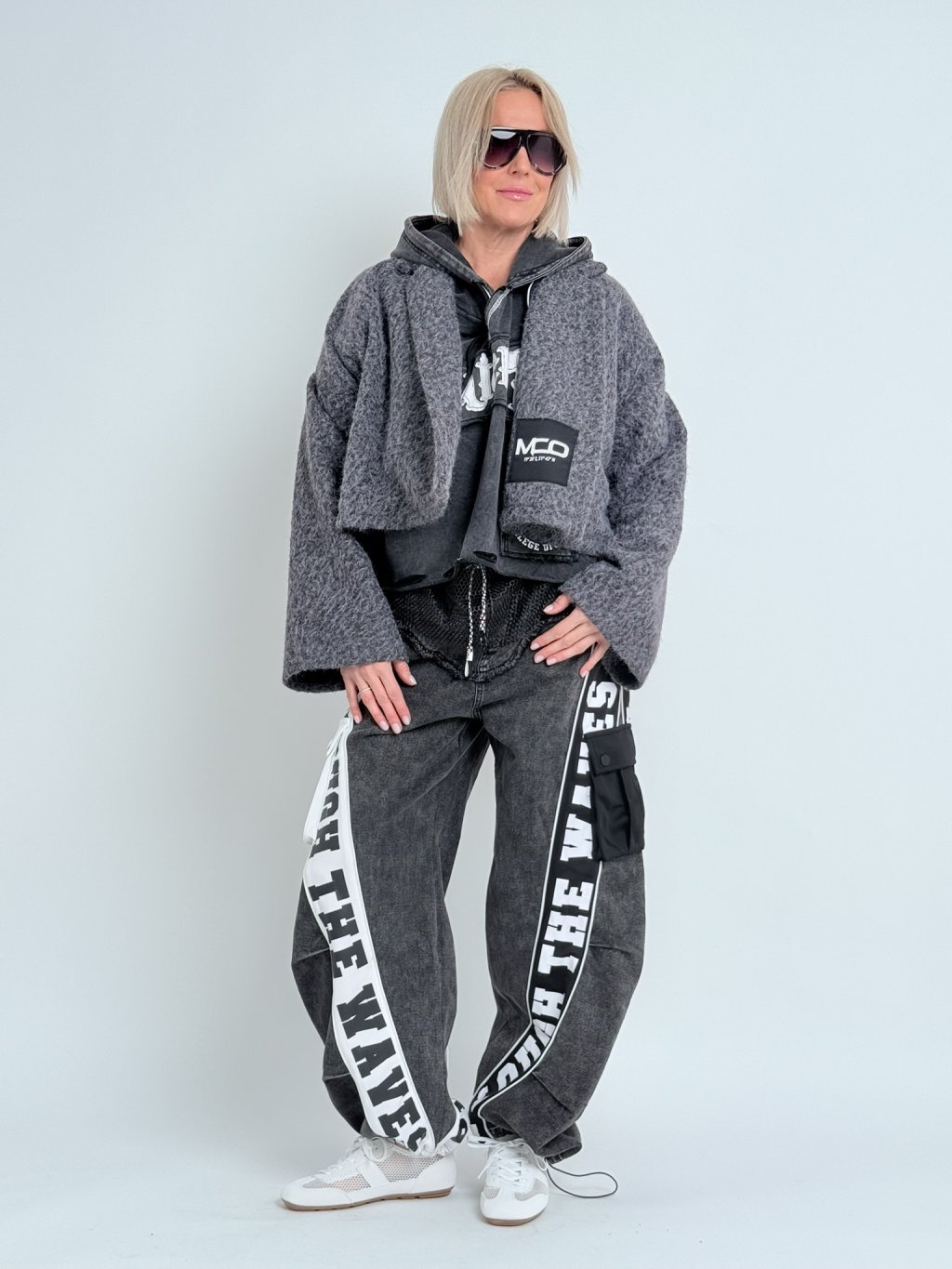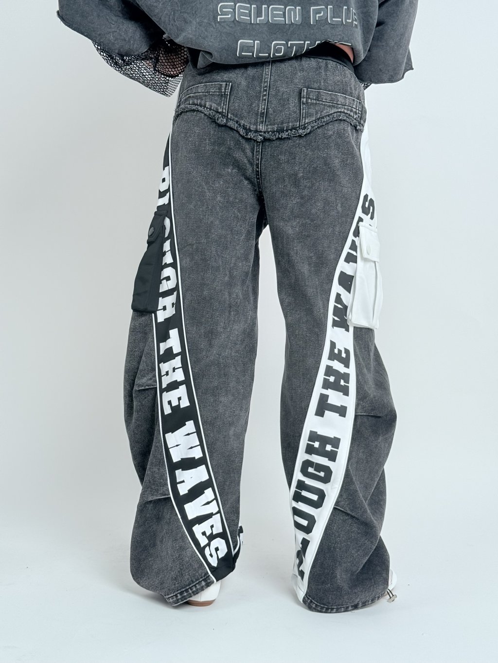 Zajímavě řešené džíny v balonovém střihu, s lampasy i nápisy, na konci nohavic i v pase na stažení.