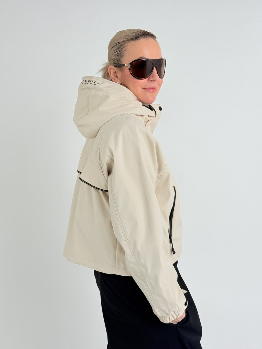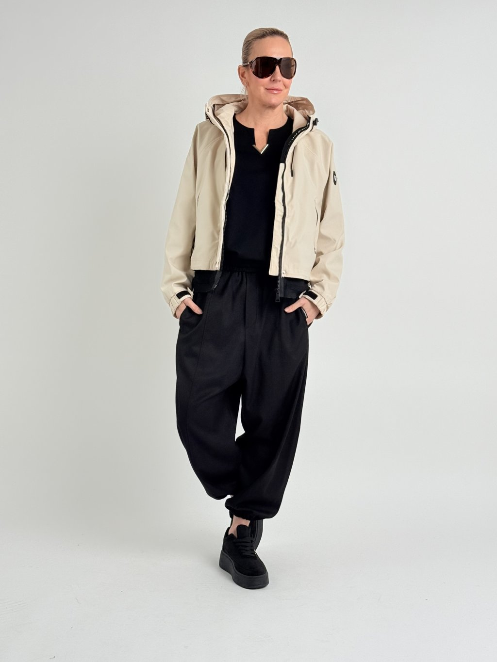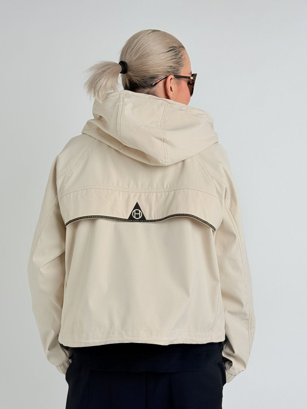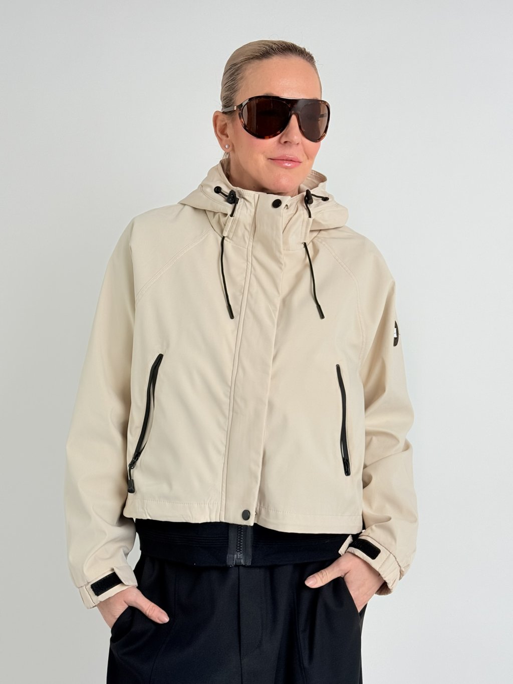 Šusťáková, nepromokavá bunda s raglánovým rukávem v dolní části se stažením na suchý zip. Bunda se zapíná na zip, který je krytý, na předním dílu jsou kapsy se zipy a stoják přechází do kapuci. V dolní části bundy je široký, volný náplet.