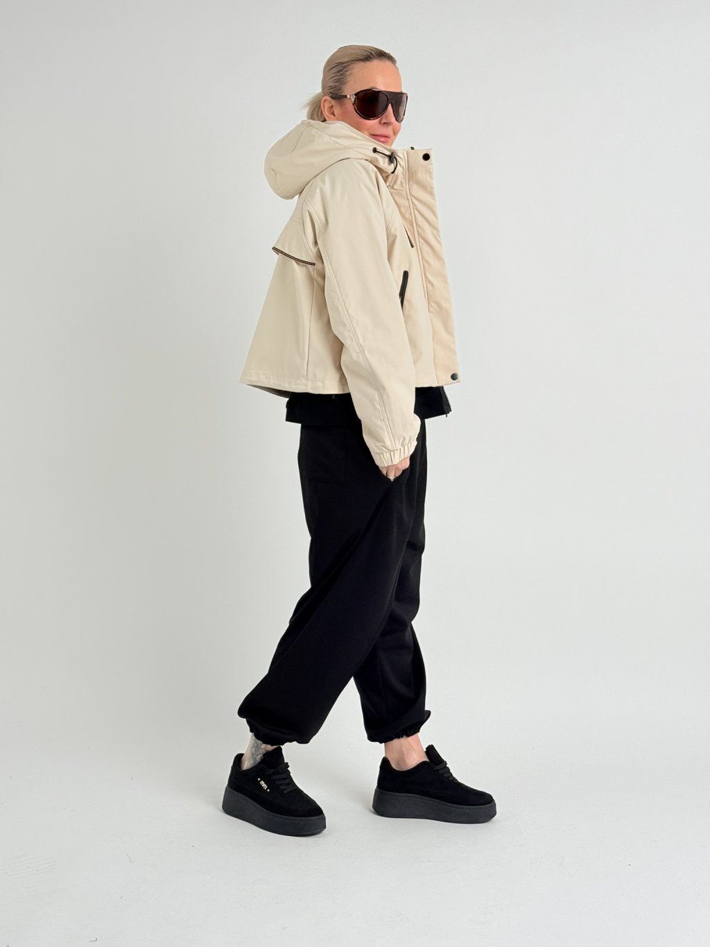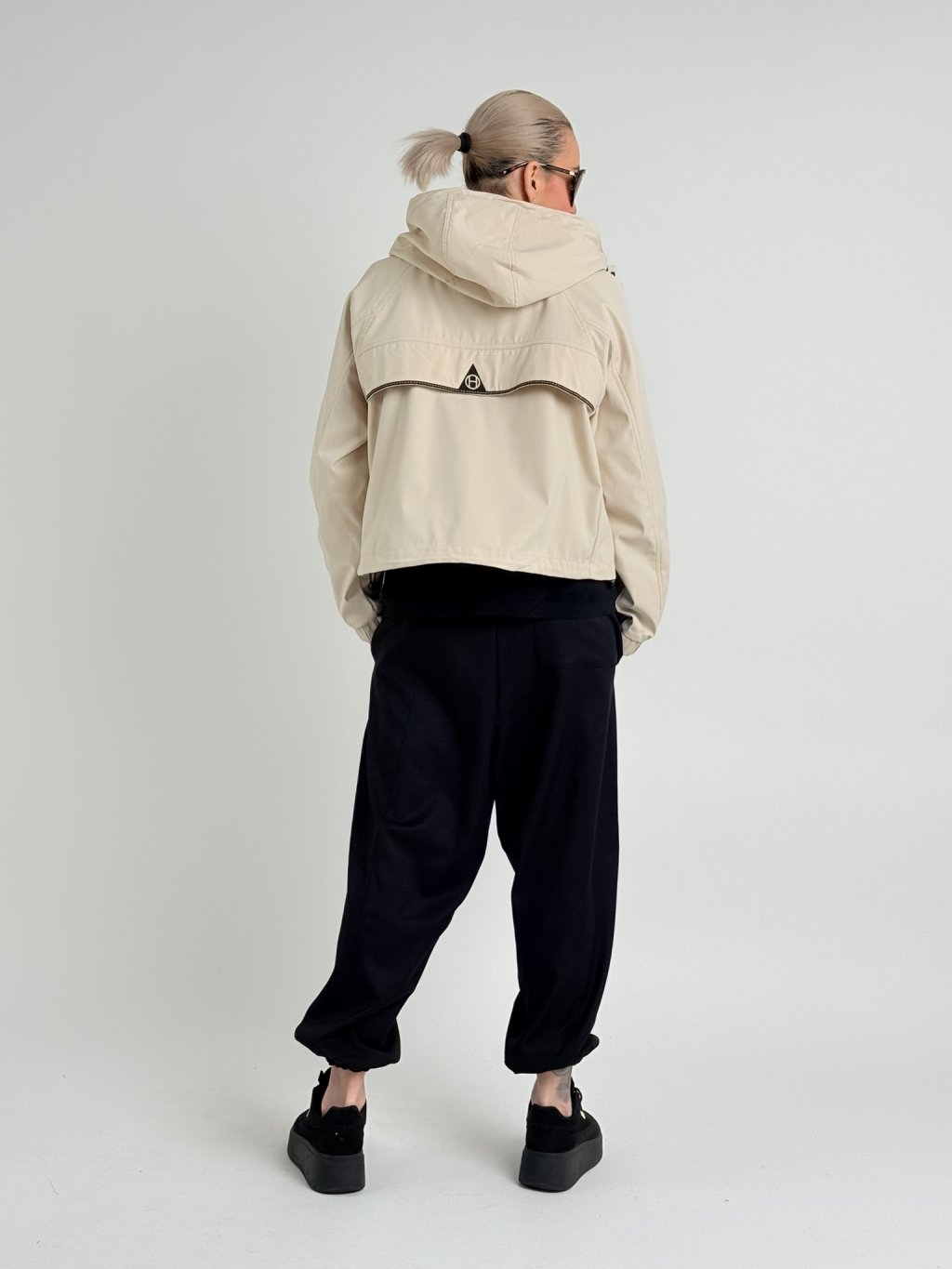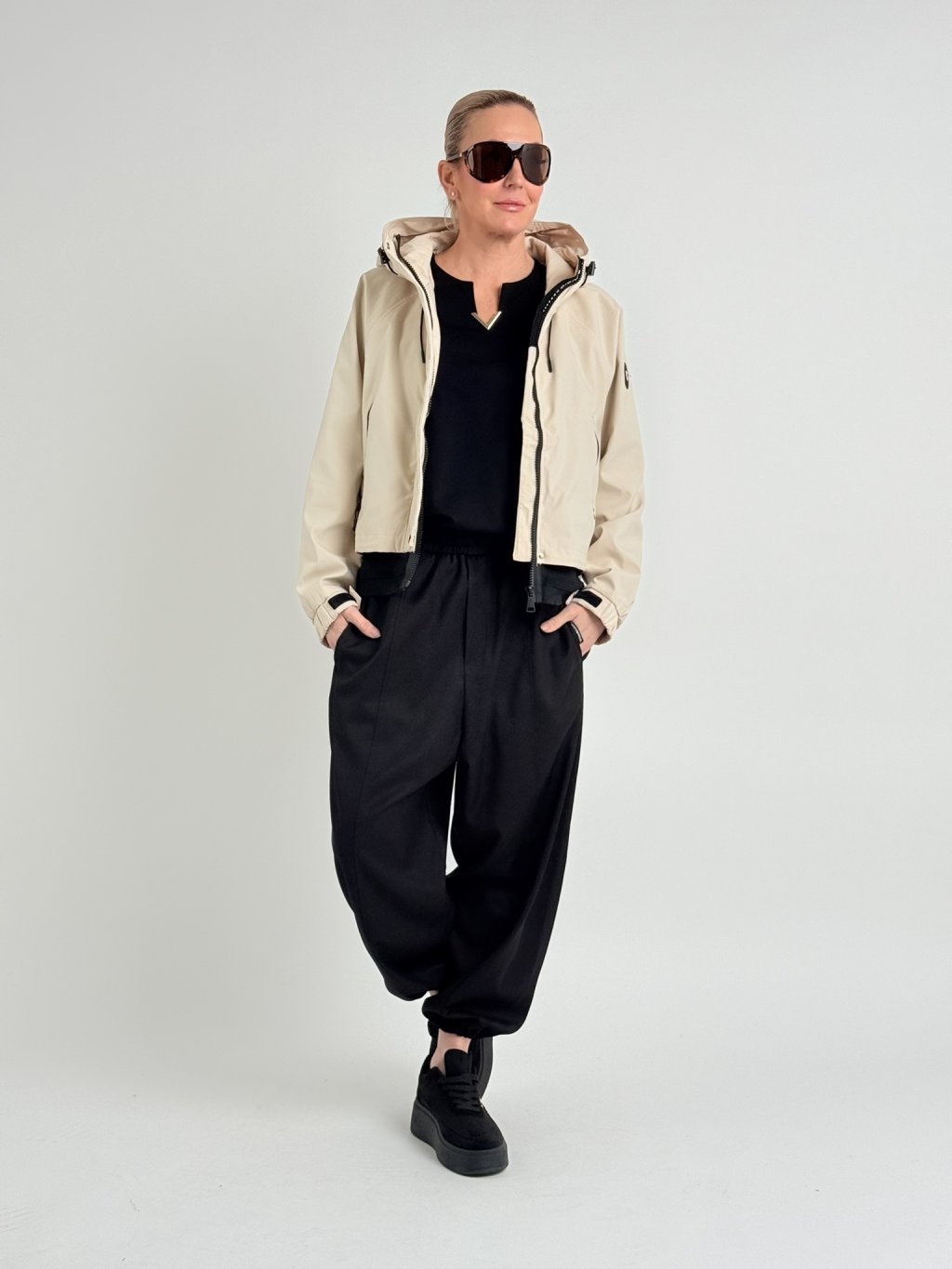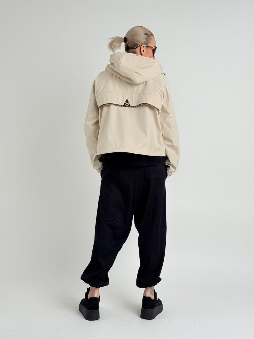 Šusťáková, nepromokavá bunda s raglánovým rukávem v dolní části se stažením na suchý zip. Bunda se zapíná na zip, který je krytý, na předním dílu jsou kapsy se zipy a stoják přechází do kapuci. V dolní části bundy je široký, volný náplet.