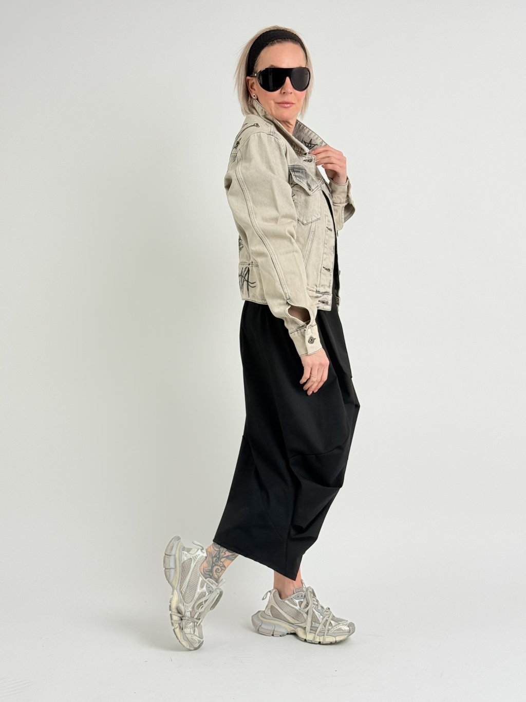 Luxusní džínová bunda v béžové barvě s šedým potiskem, vzadu s nášivkou, s vyšším pasem a hodně dlouhými rukávy.