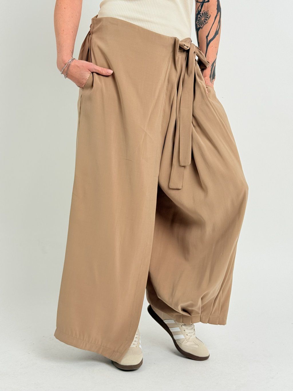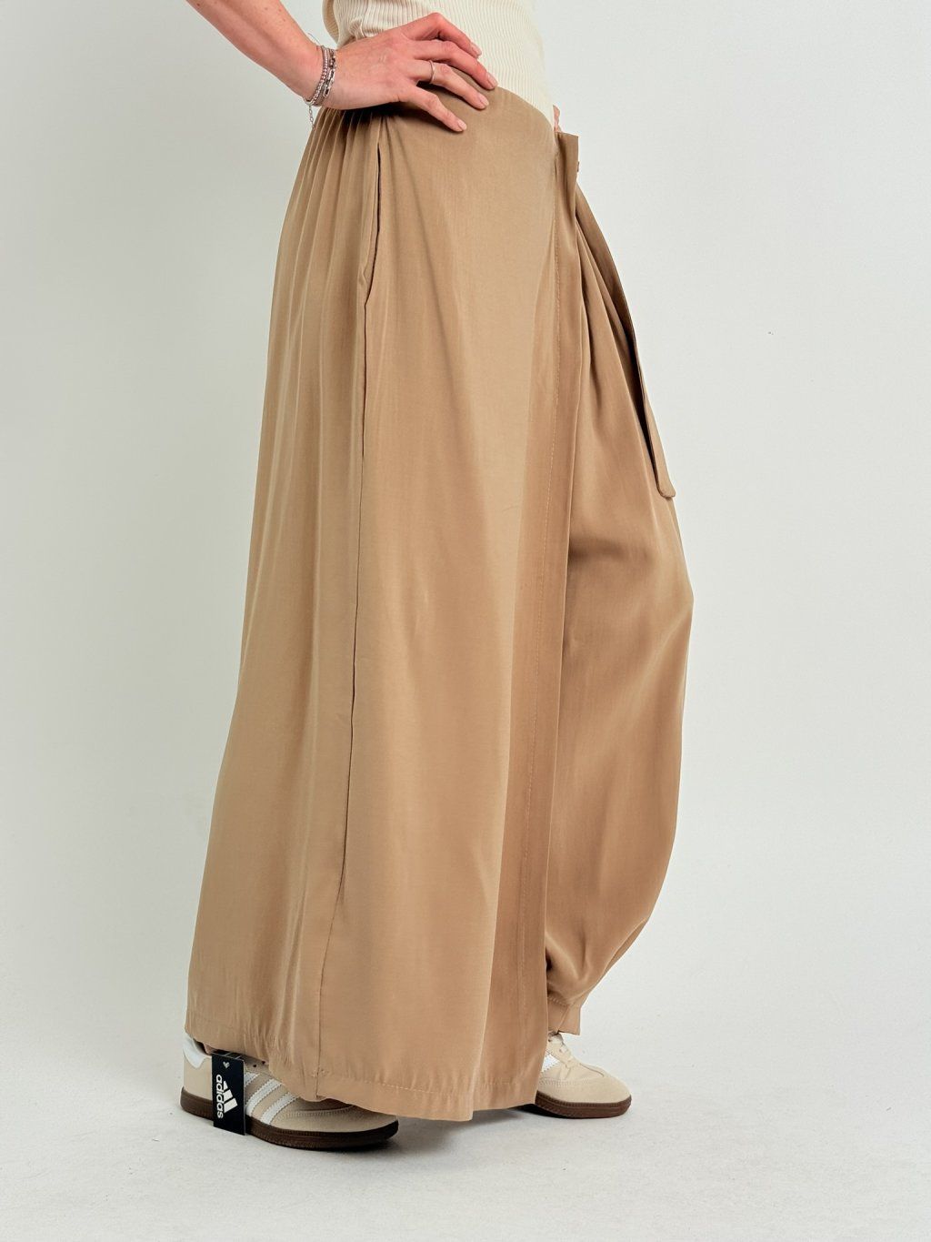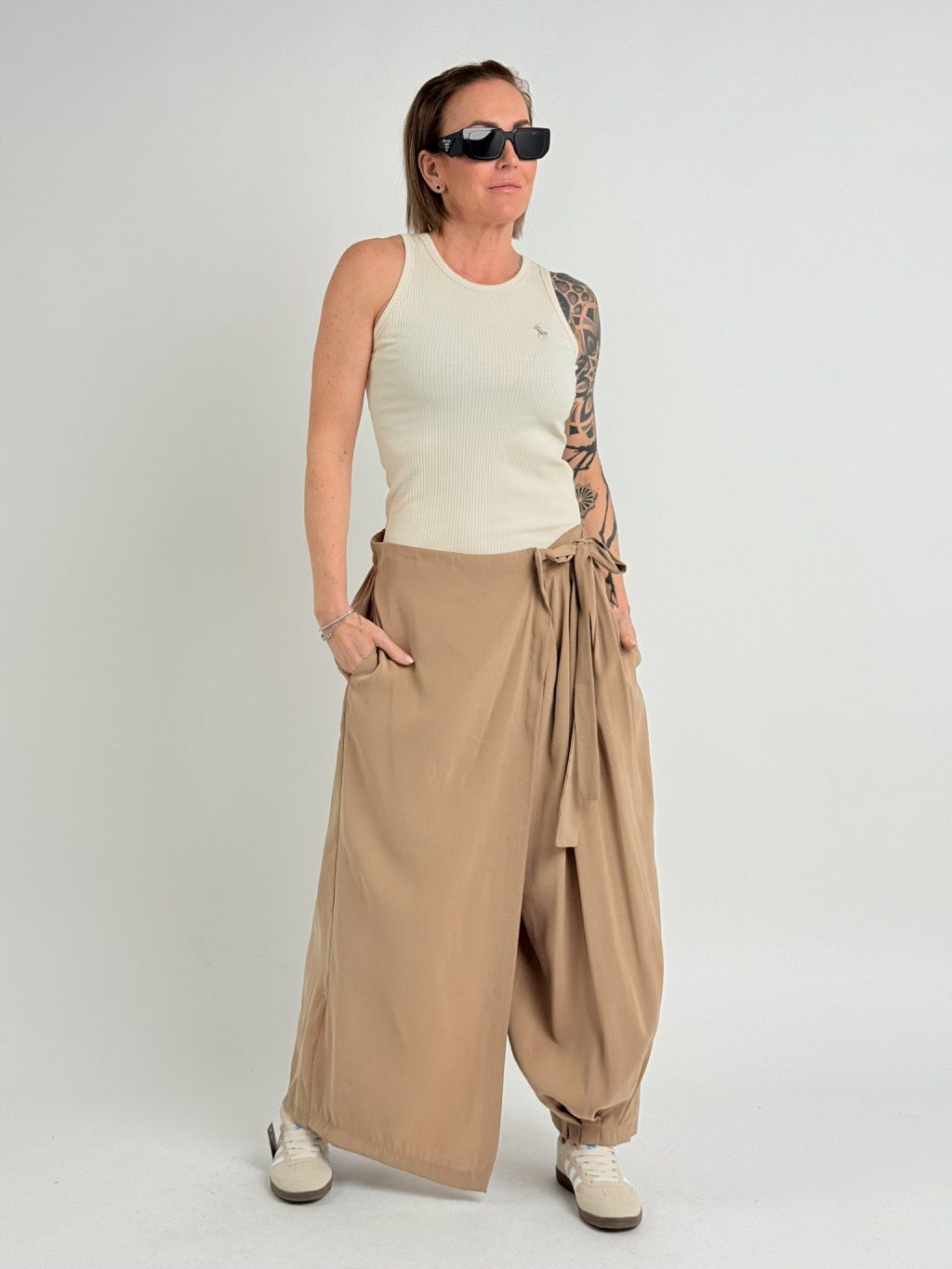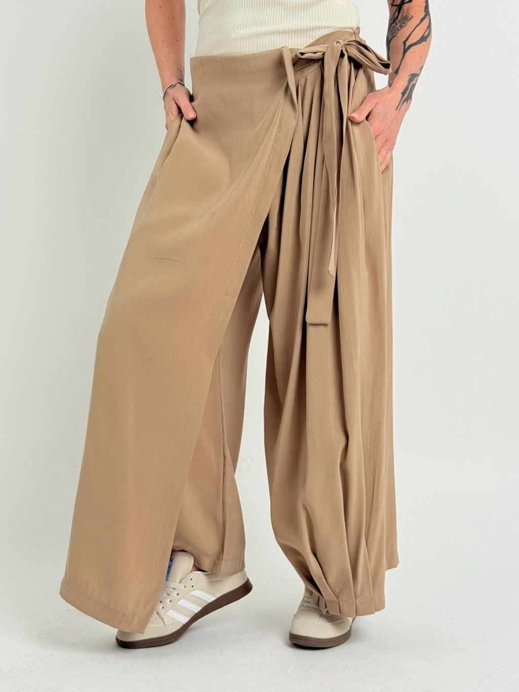 Zajímavé kalhoty se širšími nohavicemi, jedna zakončena sámky, přes druhou je překlad, který se v pase zavazuje na mašli. V zadní části pasu je guma.