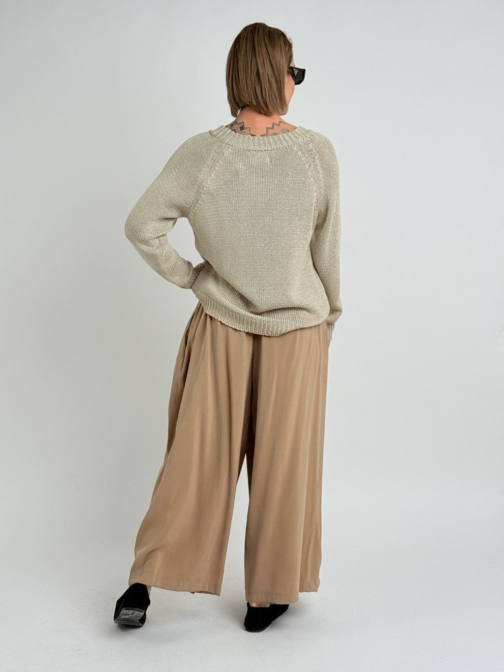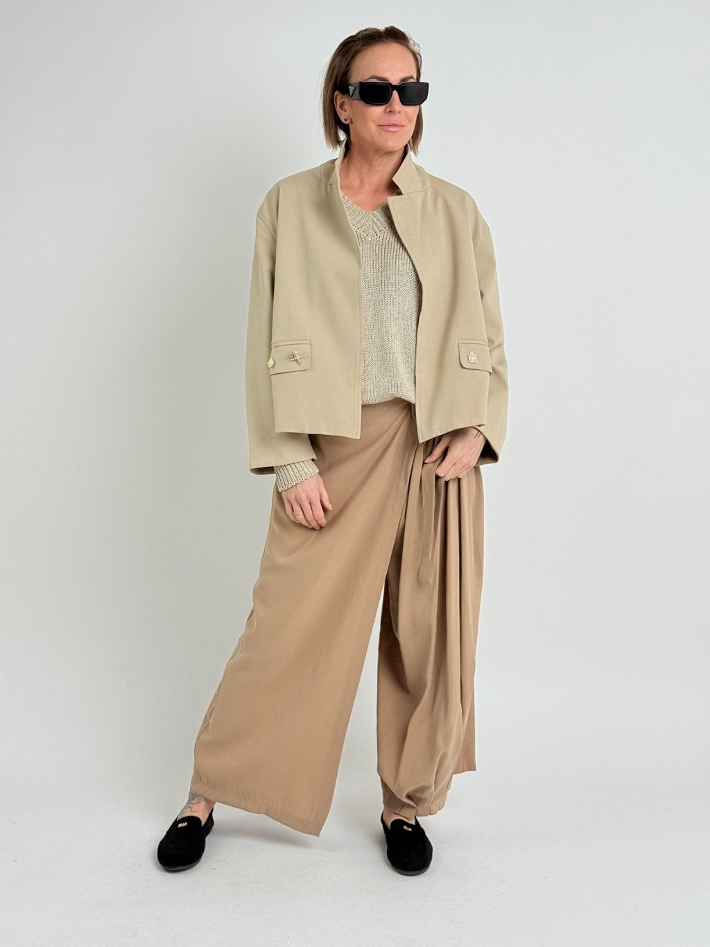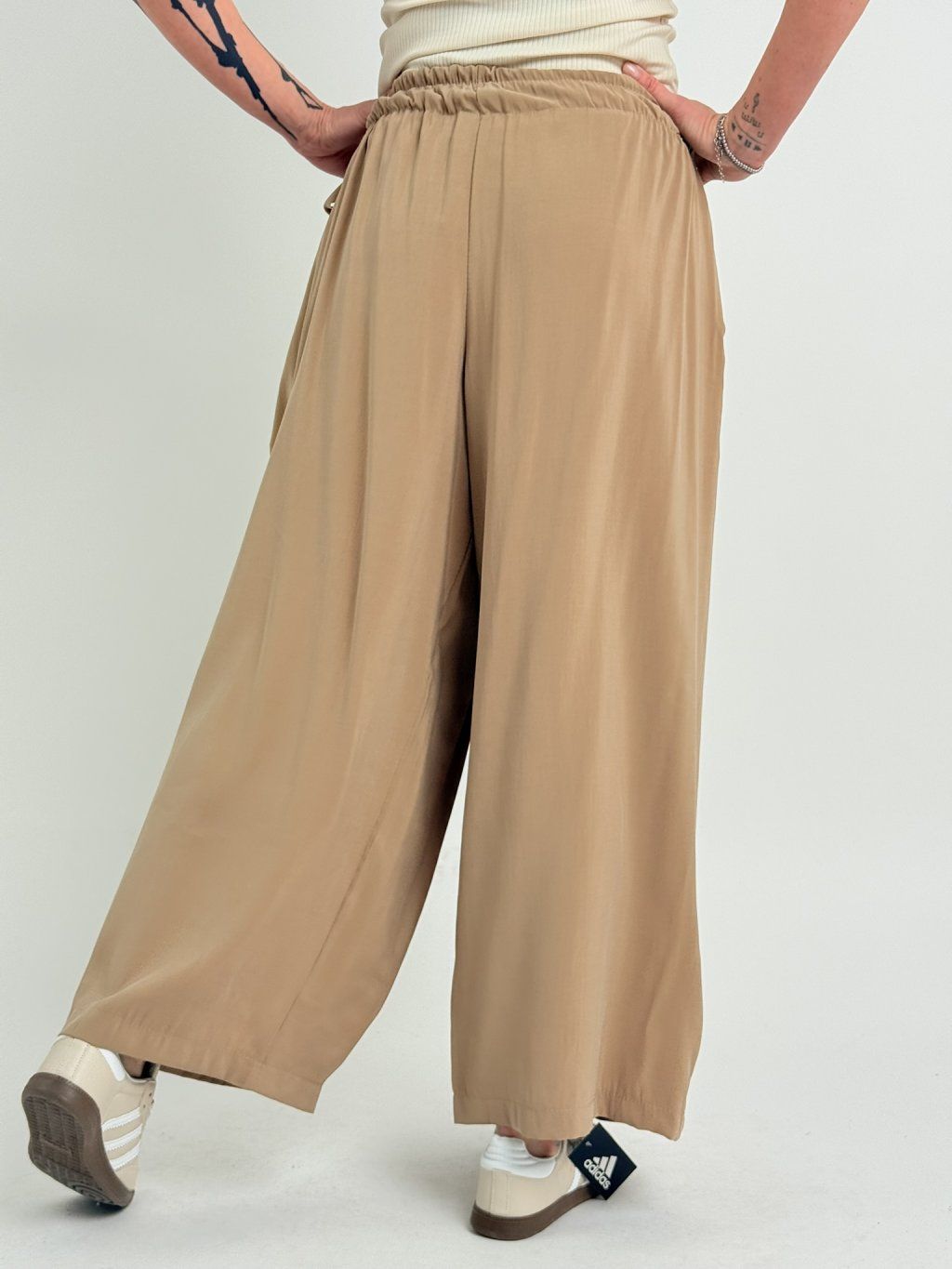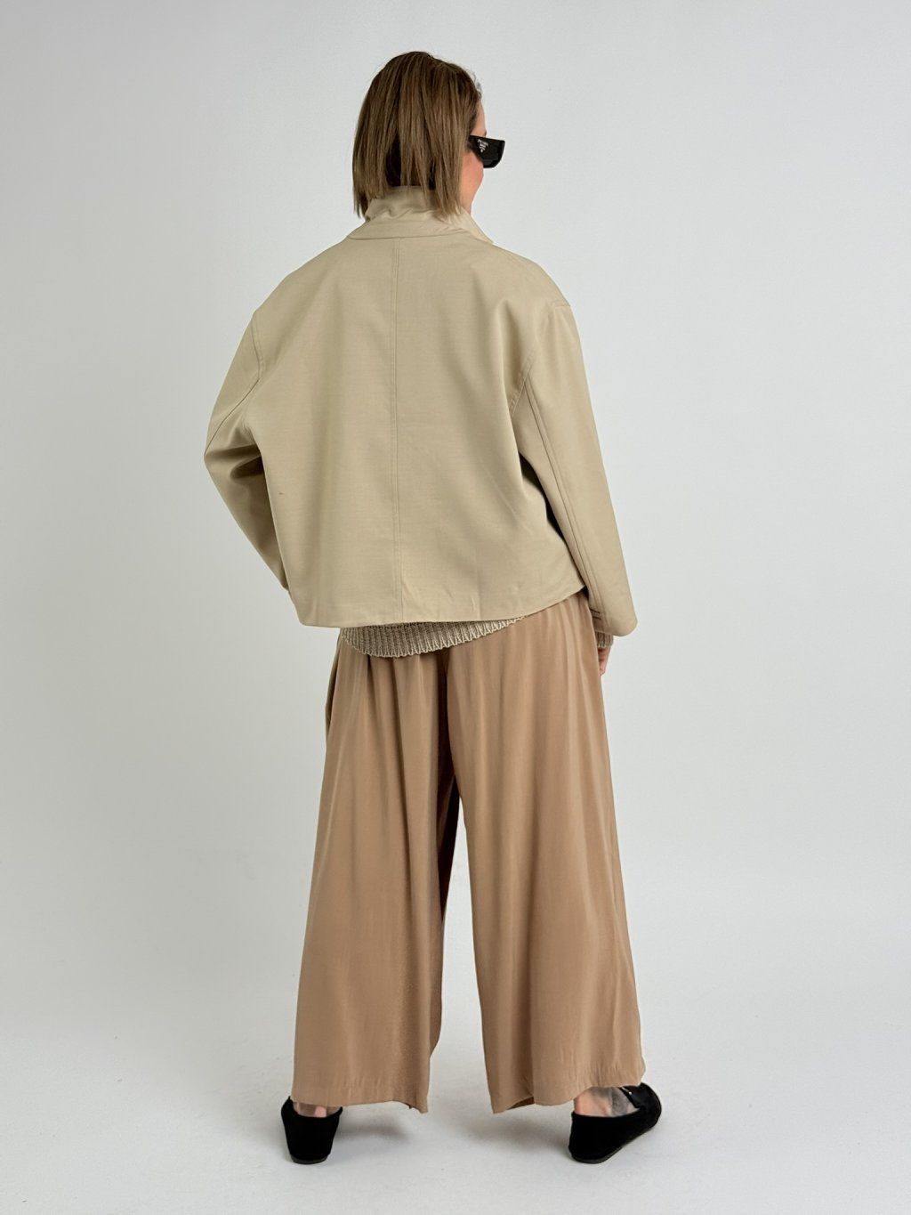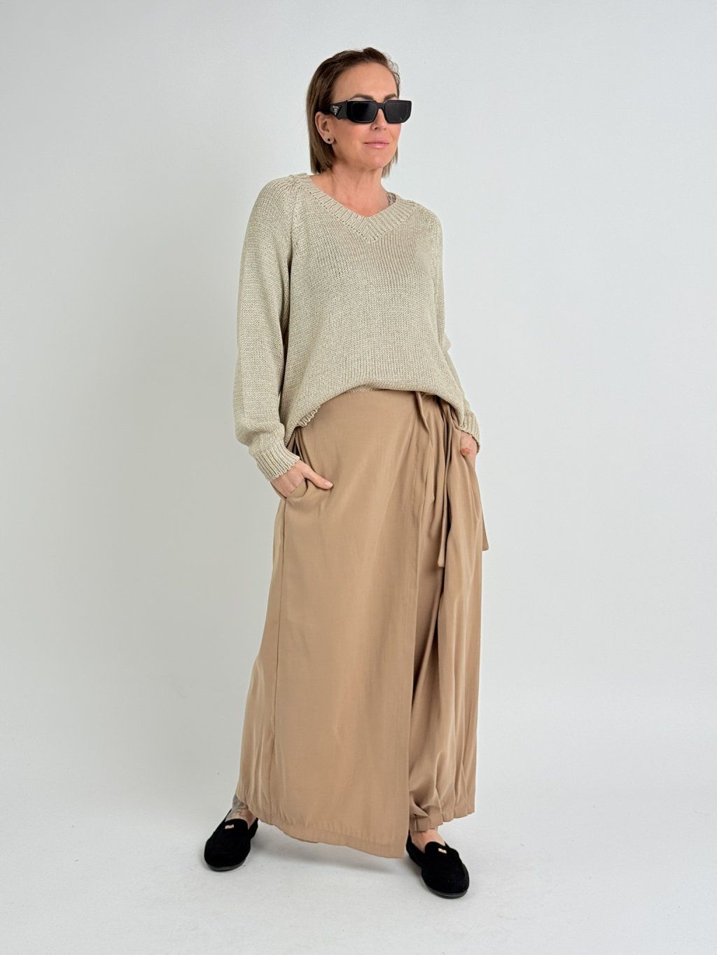 Zajímavé kalhoty se širšími nohavicemi, jedna zakončena sámky, přes druhou je překlad, který se v pase zavazuje na mašli. V zadní části pasu je guma.