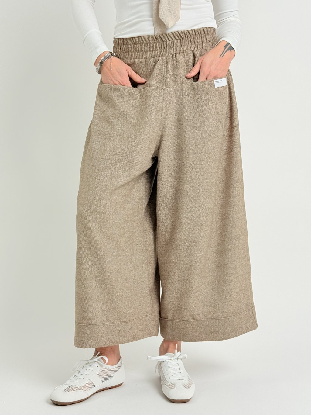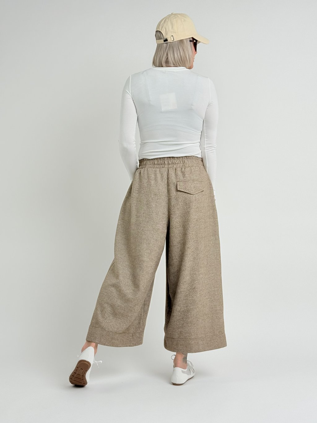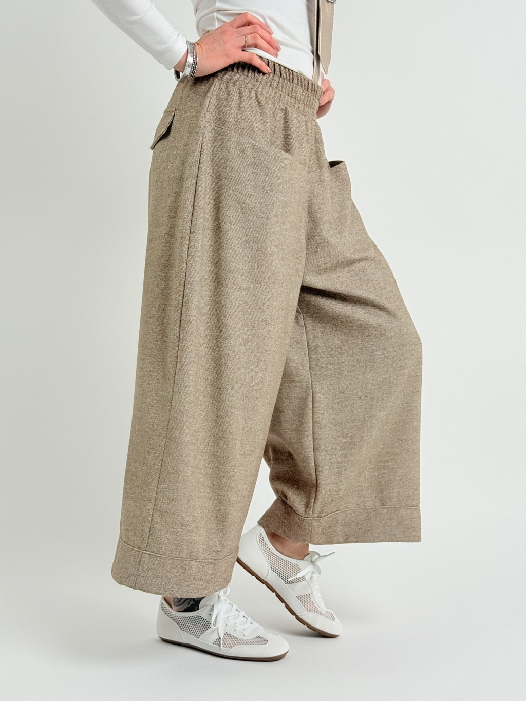 Silnější, široké kalhoty, v pase do gumy, v délce nad kotníky.