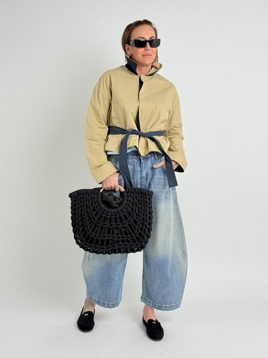 Krátký béžový kabátek s tmavomodrým podložením légy, límce a pásku v pase , s klopami, zapínáním na knoflíky.