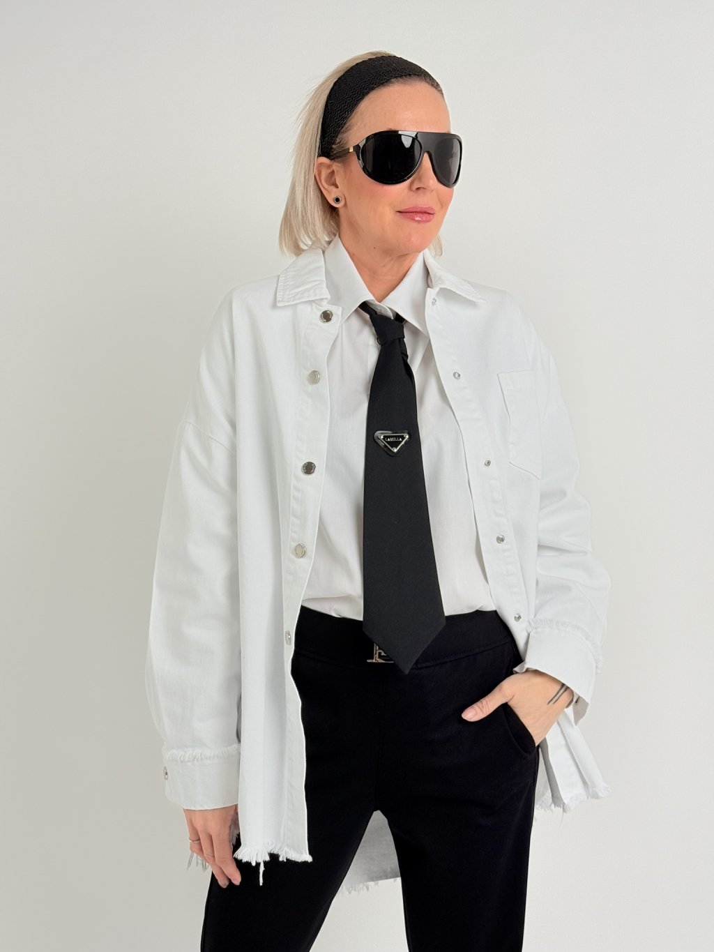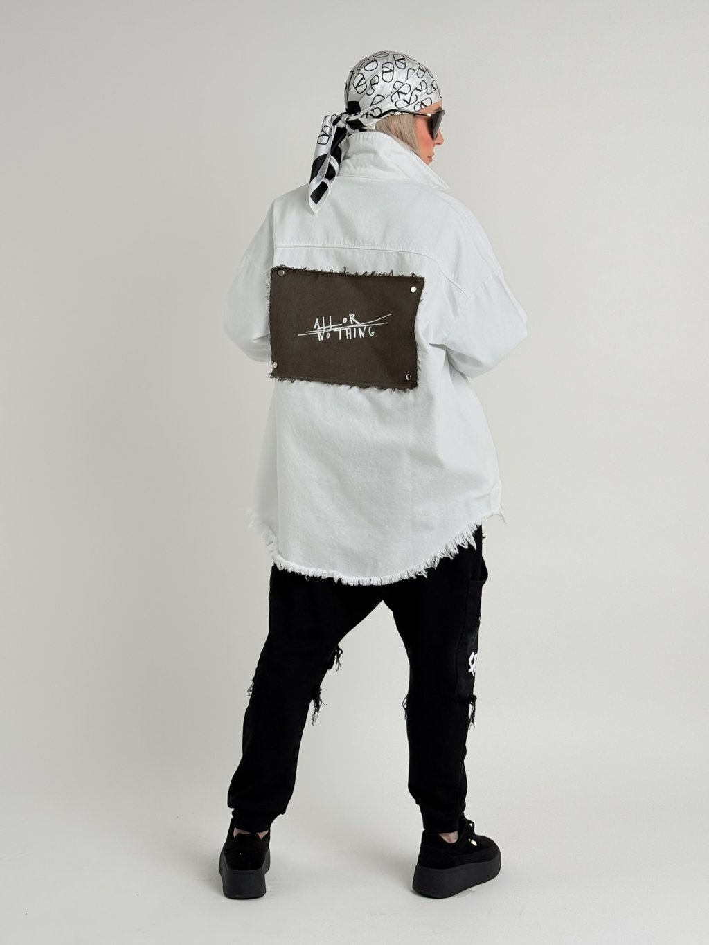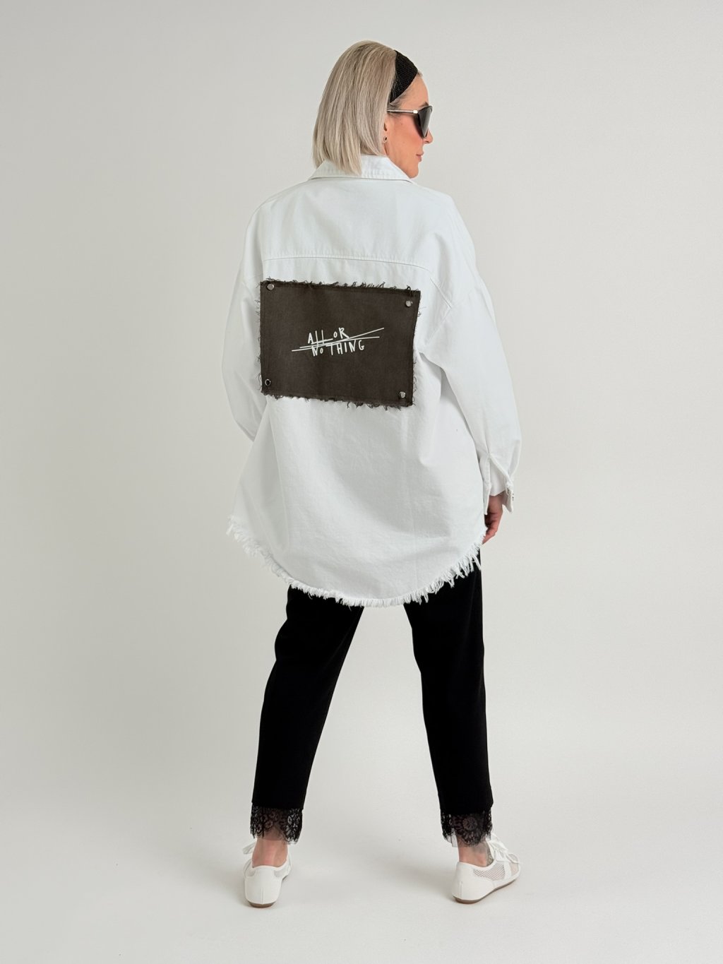 Volná, džínová košile s kapsou na předním dílu, se zapínáním na patenty a vzadu s větší , hnědou nášivkou.