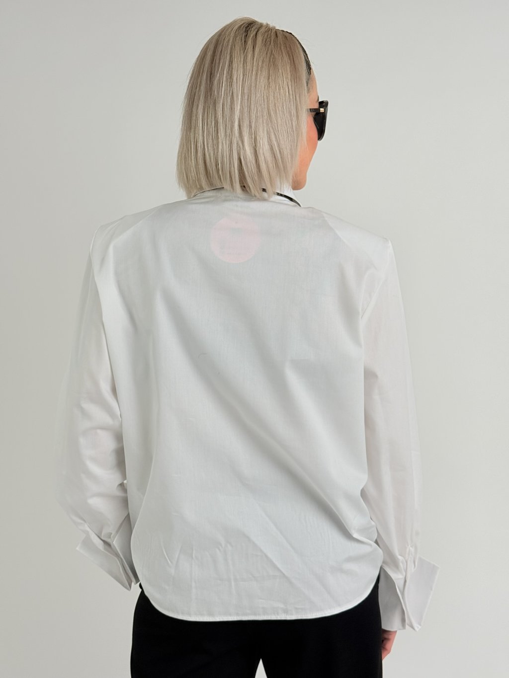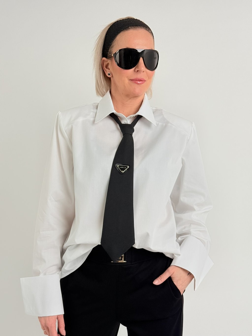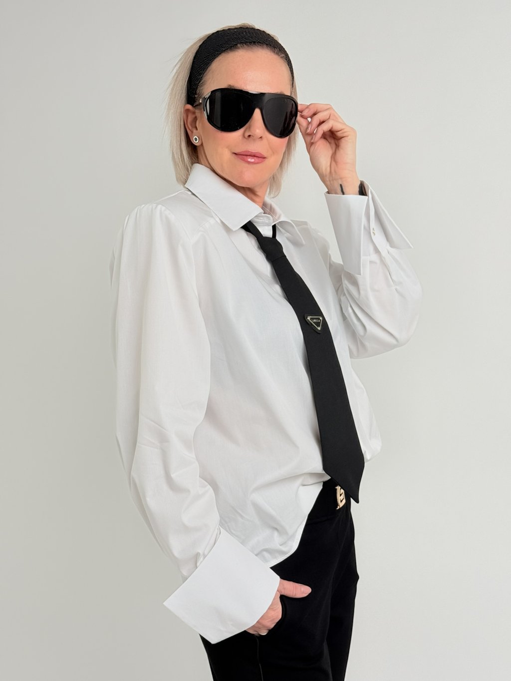 Luxusní, klasická, bílá košile s malými, ramenními vycpávkami, širokými, ohrnutými manžetami a černou kravatou.