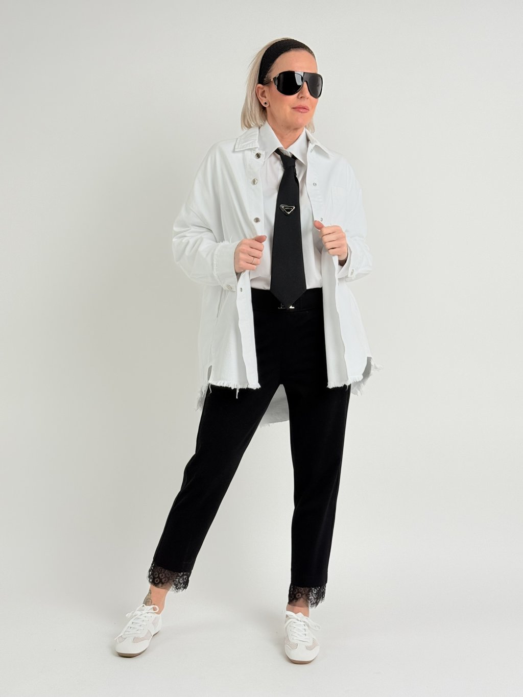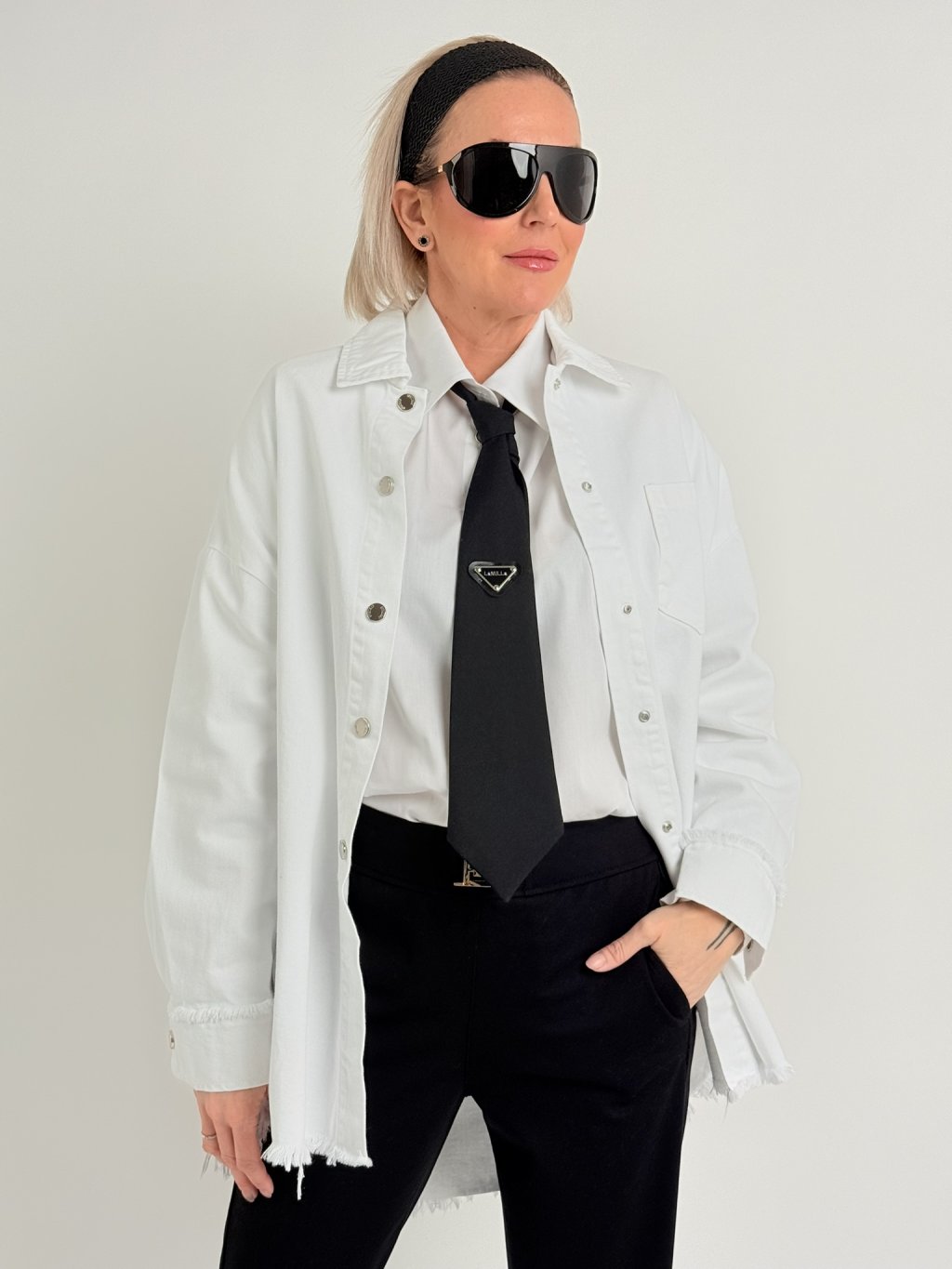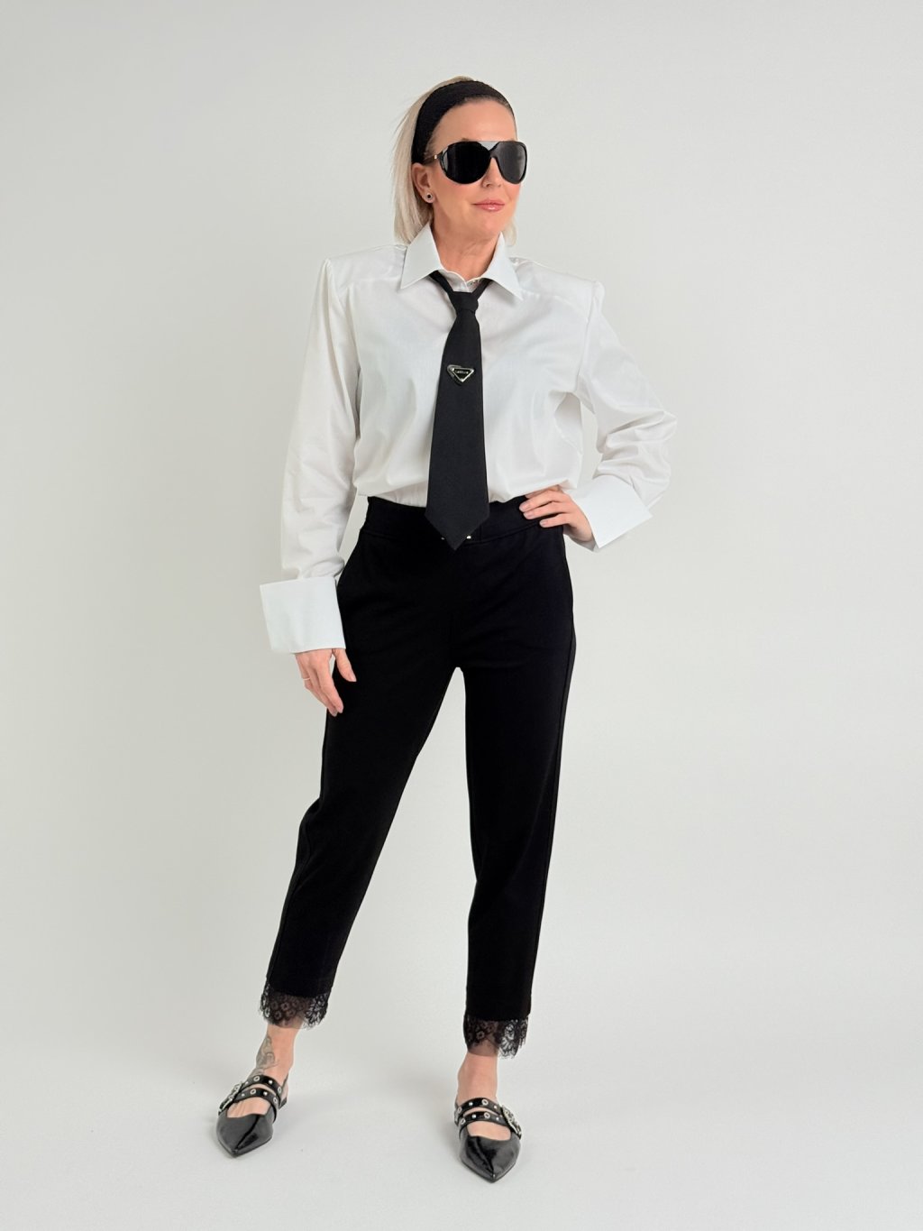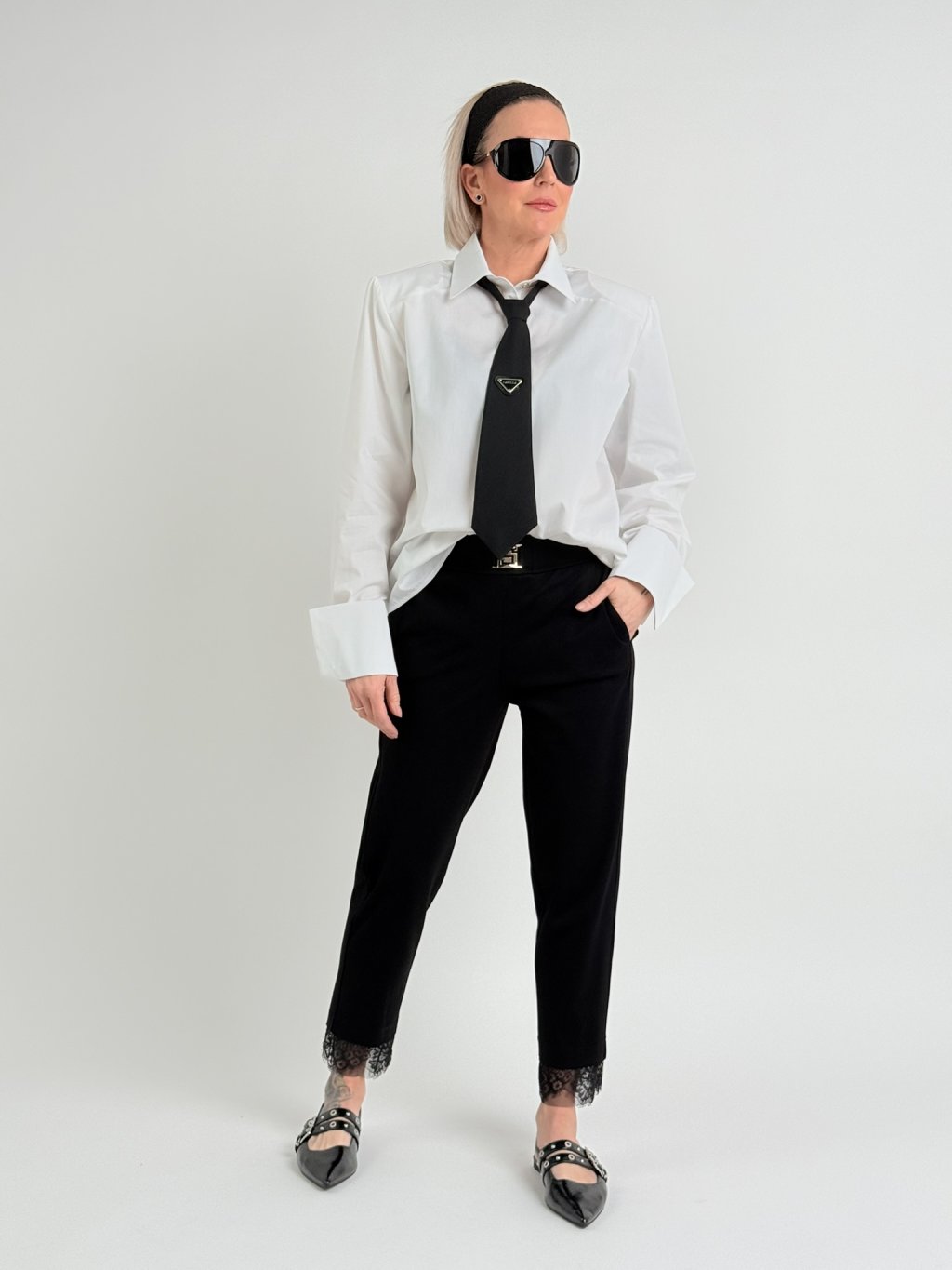 Luxusní, klasická, bílá košile s malými, ramenními vycpávkami, širokými, ohrnutými manžetami a černou kravatou.