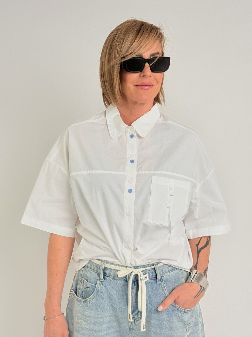 Krásná, lehká košile s krátkým rukávem, kapsičkou se dvěma knoflíčky a ozdobnou nití.