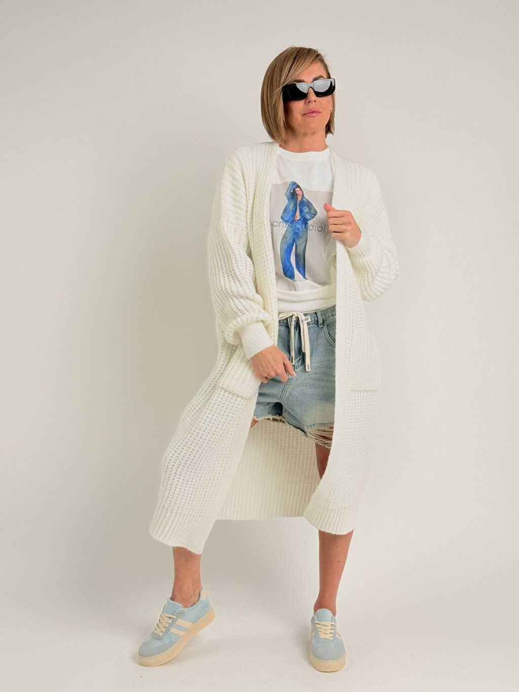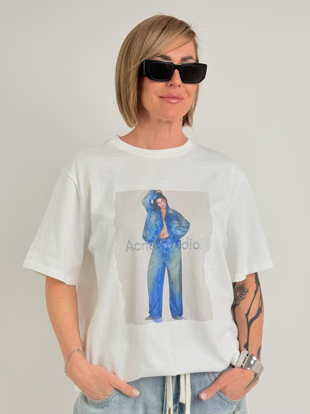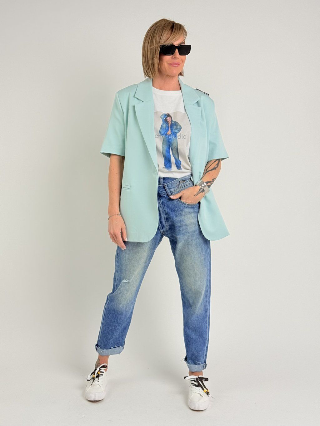 Volnější triko s kulatým výstřihem, rukávem k lokti a potiskem postavy v modrém na předním dílu.