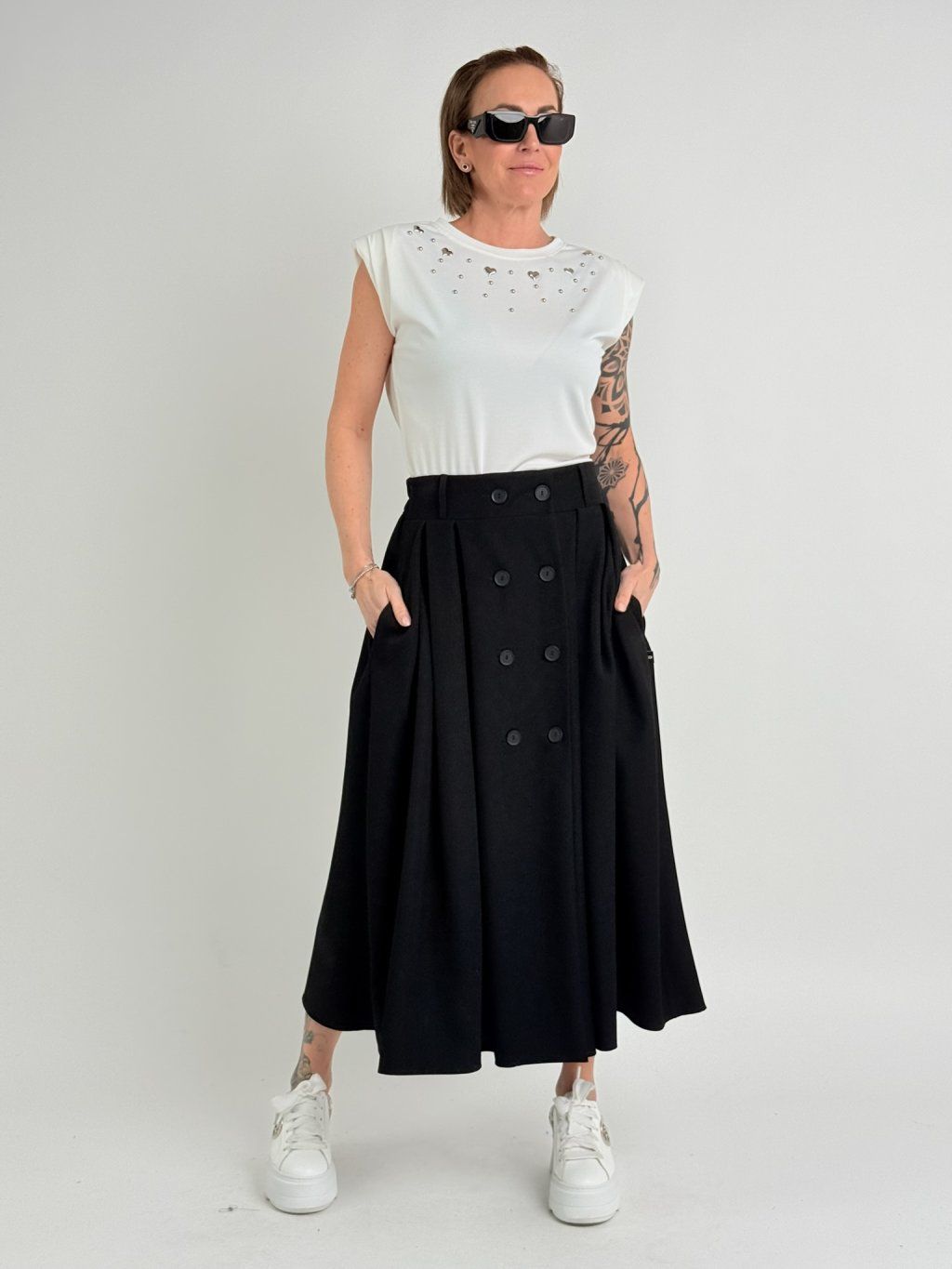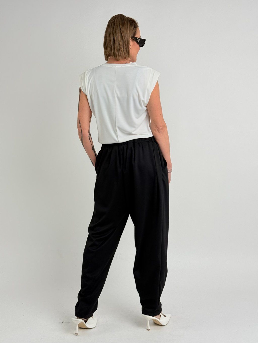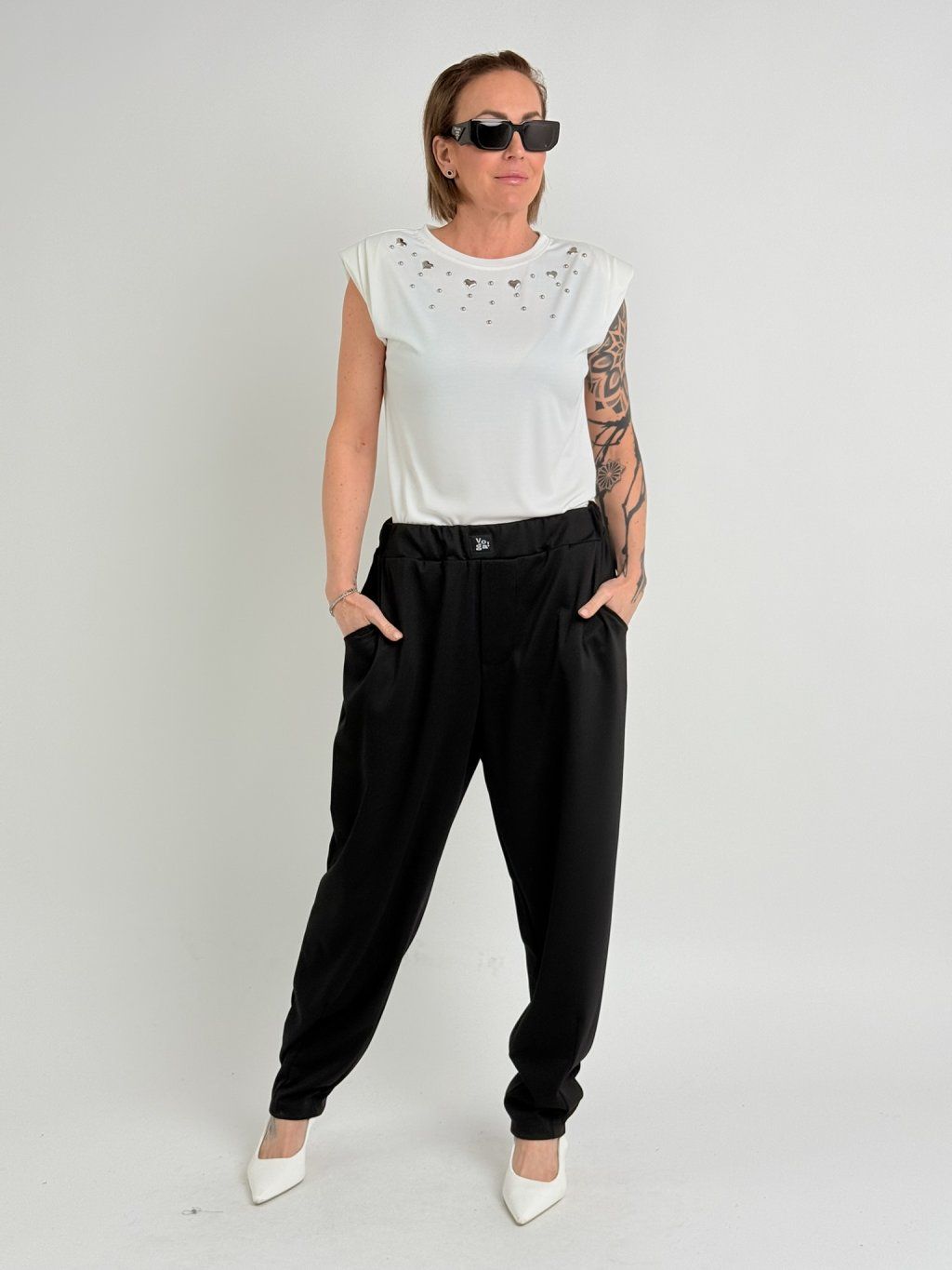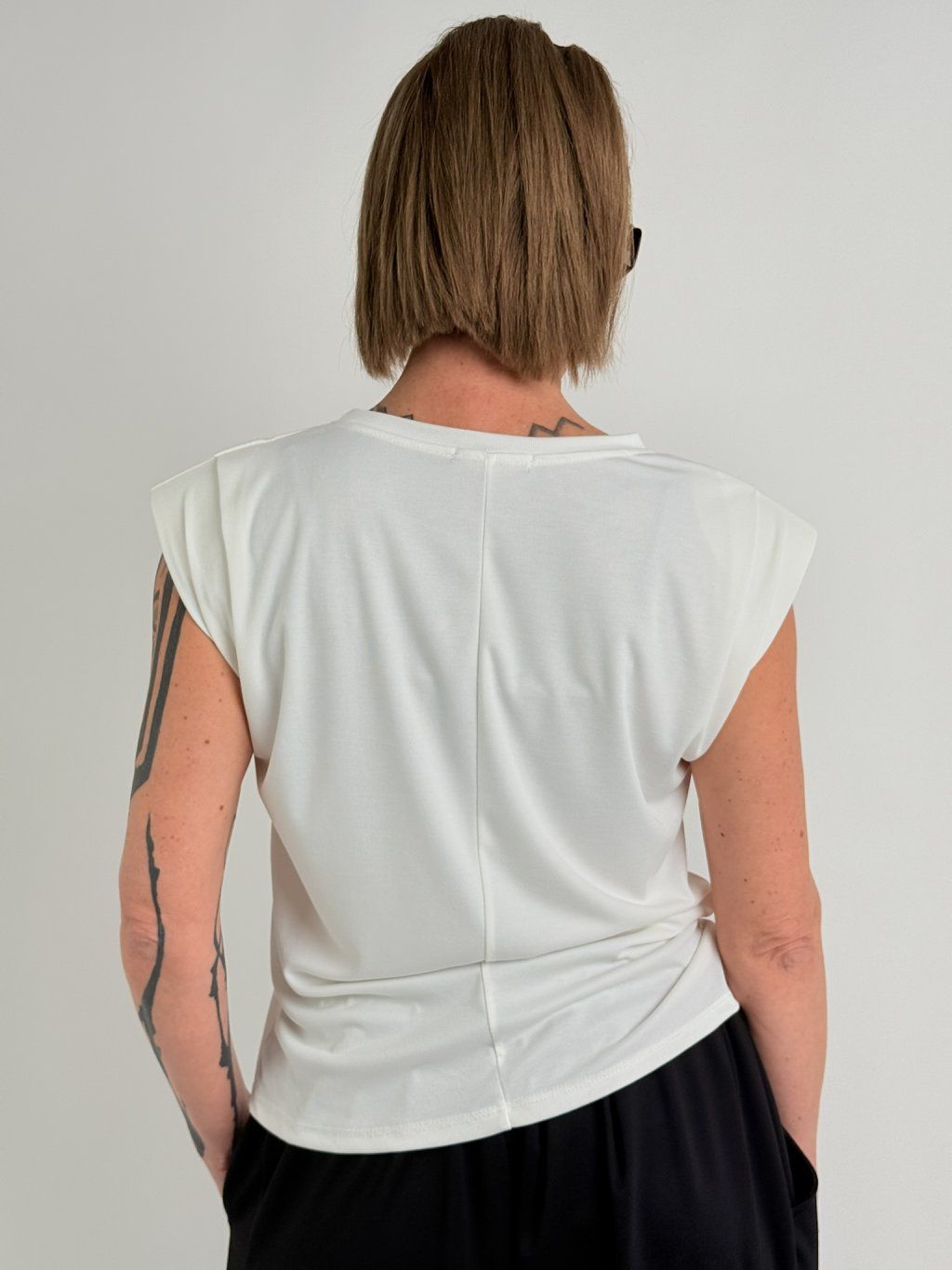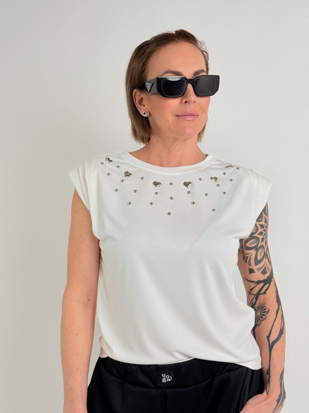 Hodně pružné tričko se spadlým rukávem s manžetou, vycpávkami a kovovými srdíčky na předním dílu.