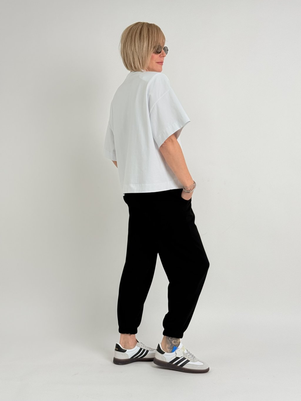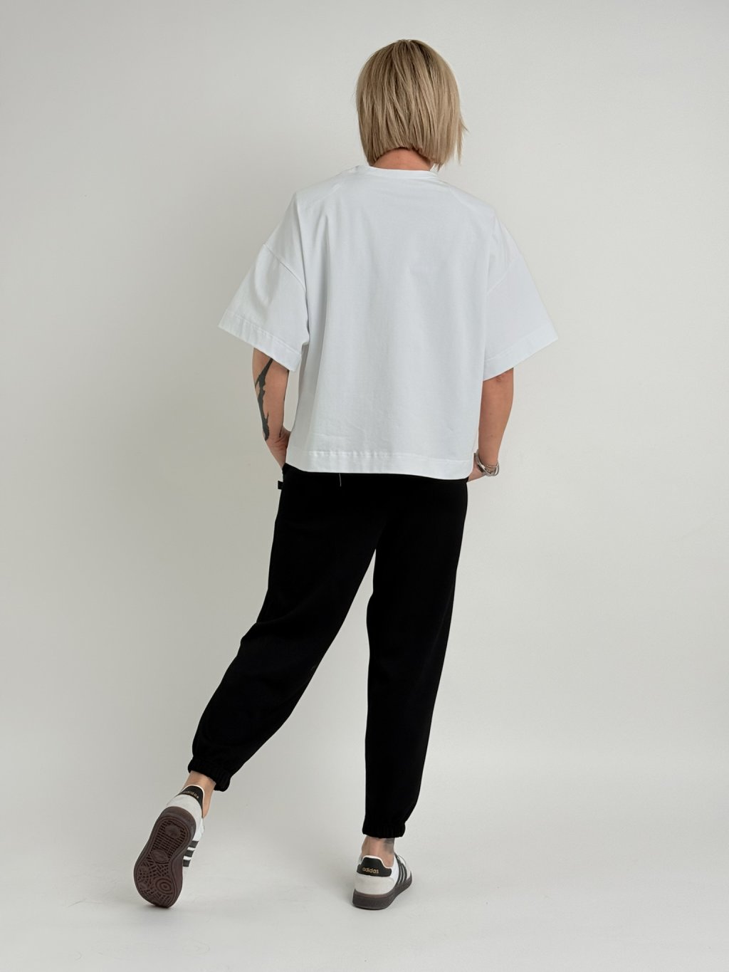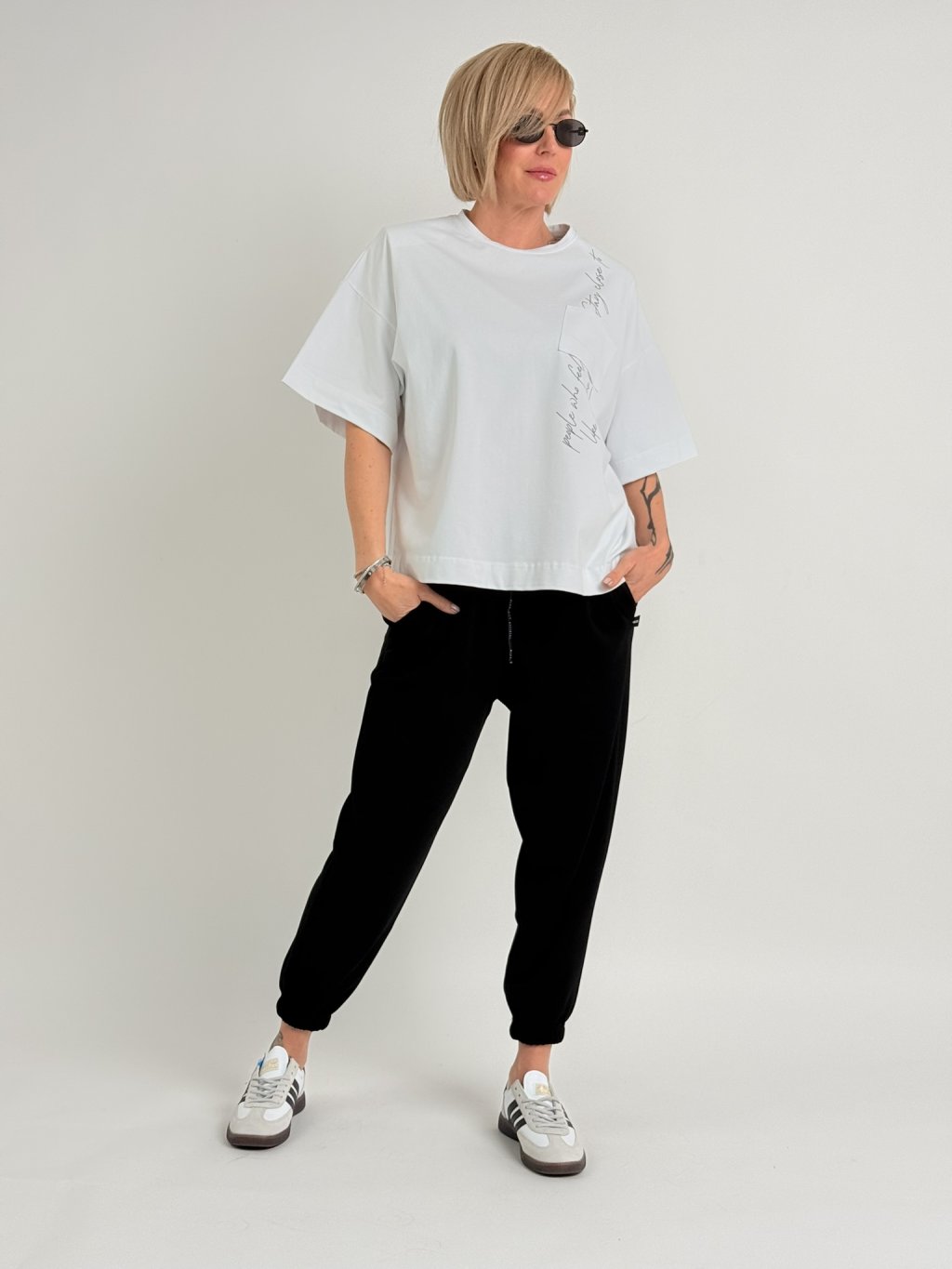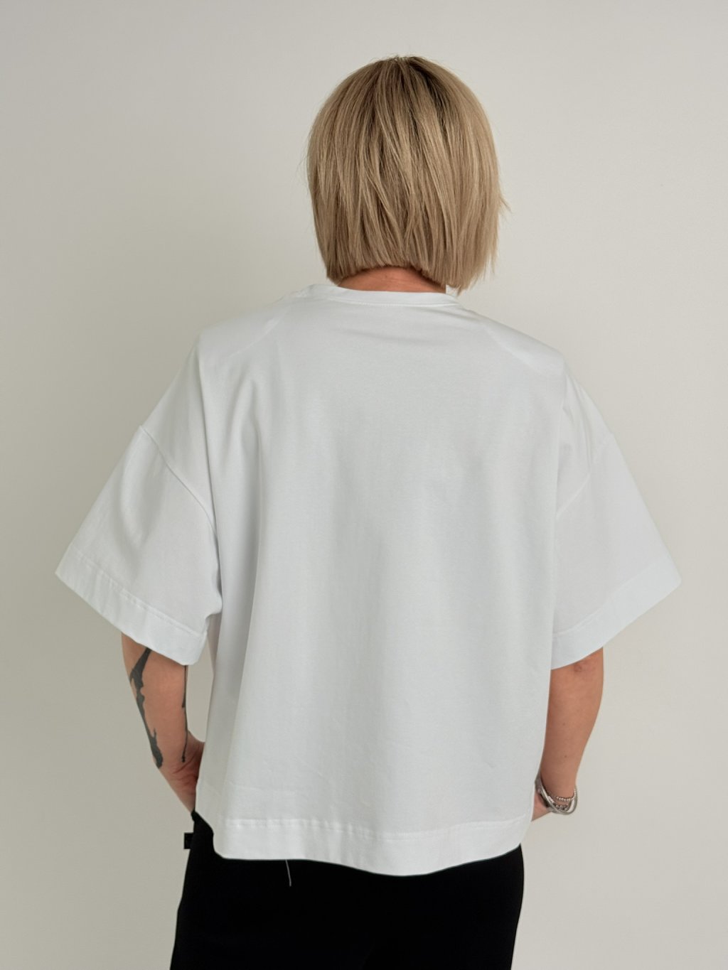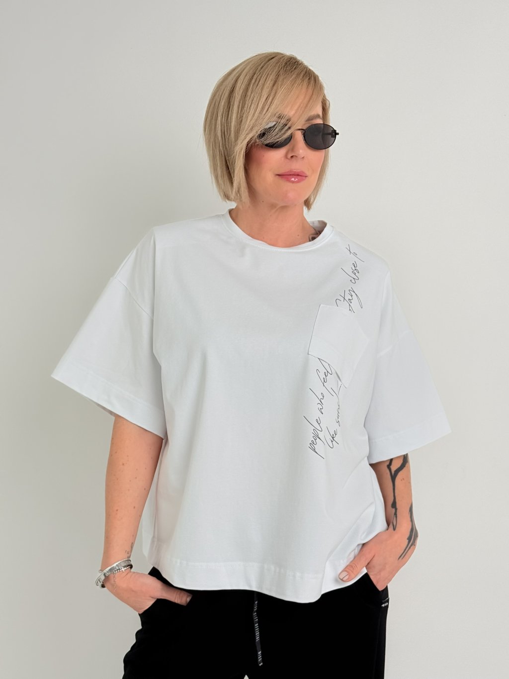 Volnější, delší triko s kulatým výstřihem, rukávem k lokti, nápisem překrytým obrácenou kapsou na předním dílu. a ramenními vycpávkami.