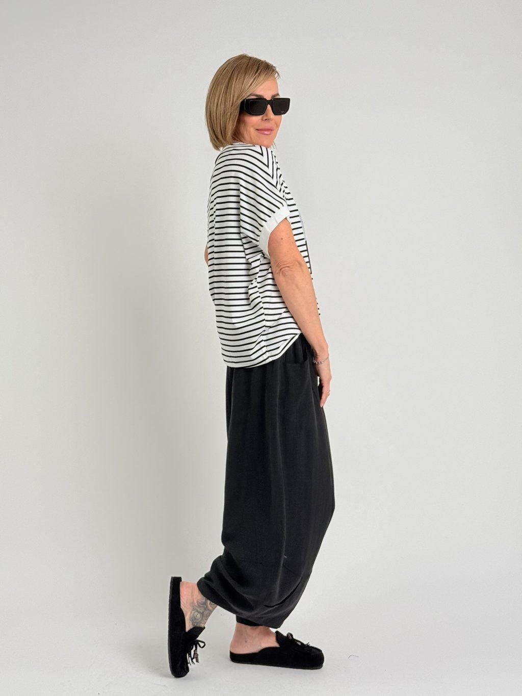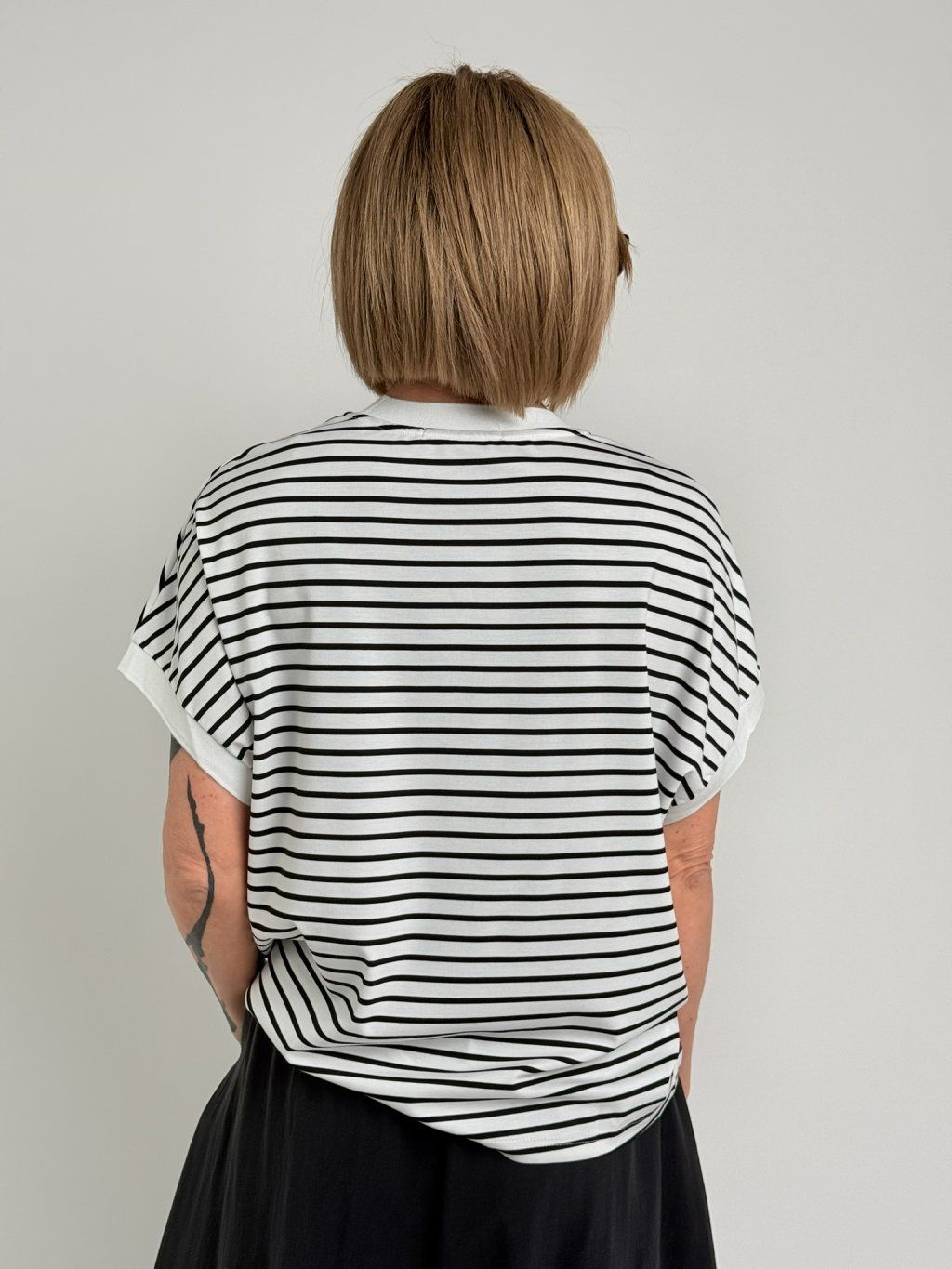 Proužkované triko se spadlým rukávem, s manžetou, na předním dílu s potiskem a našitými perličkami.