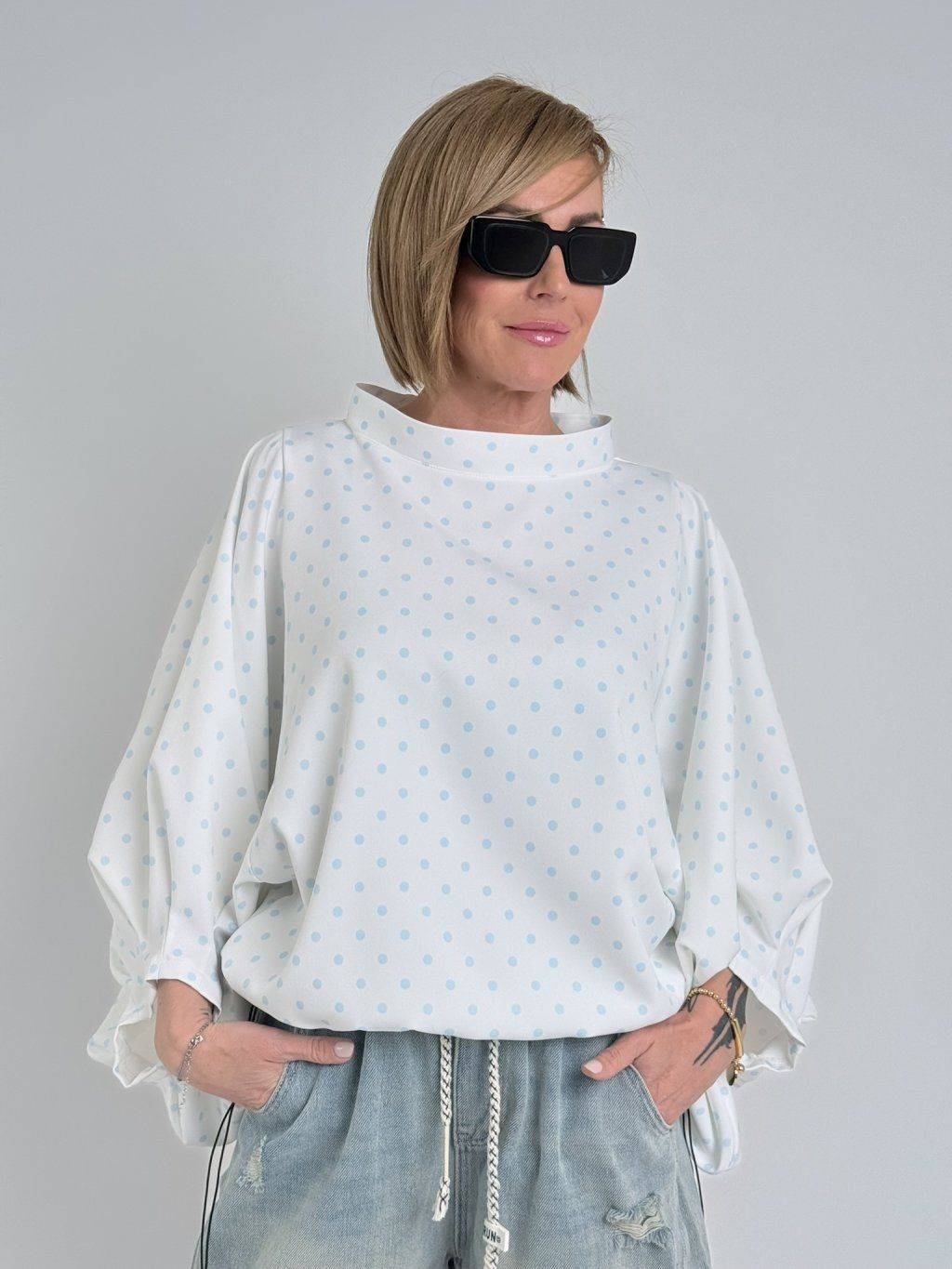 Nádherná, kratší, puntíkatá tunika, v pase na stažení, s hodně širokými rukávy, zakončenými sámky.