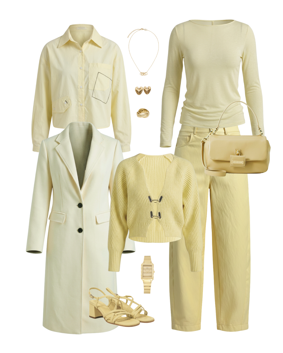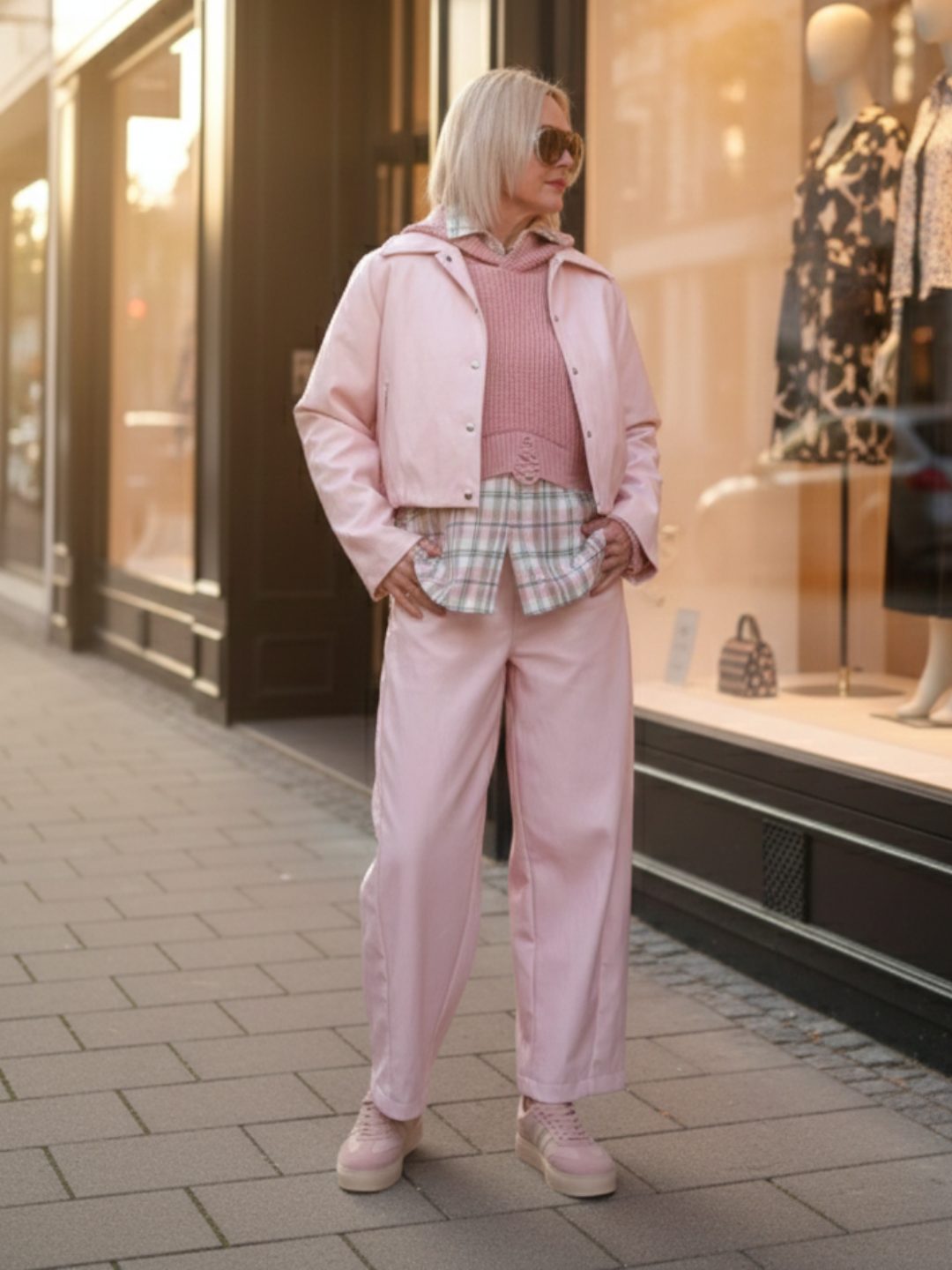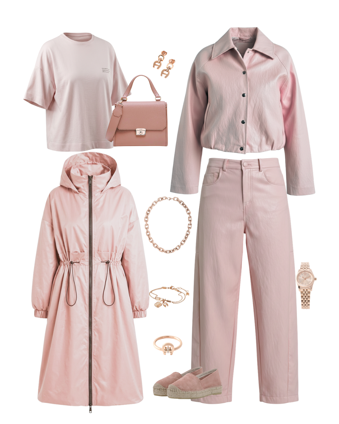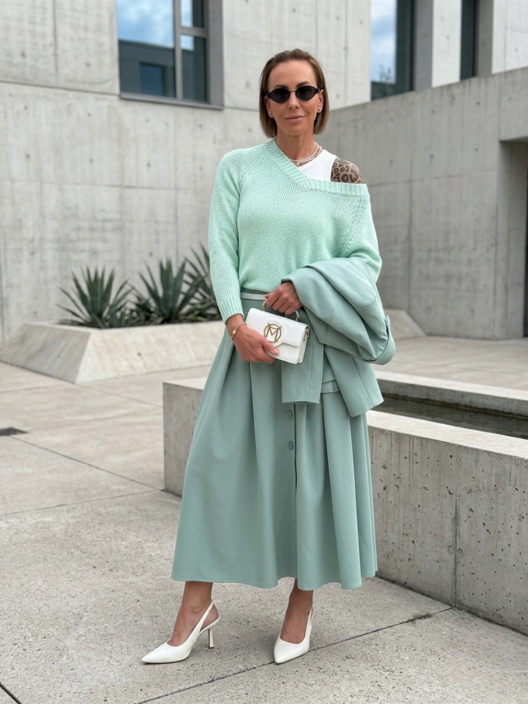 Tady je to přesně o té odvaze: Vyjít z domu v monochromatickém pastelovém outfitu. Pokud ale správně nakombinuješ textury, budeš se cítit naprosto luxusně. Tón v tónu postavu nerozbije, naopak ji krásně protáhne a zeštíhlí.
