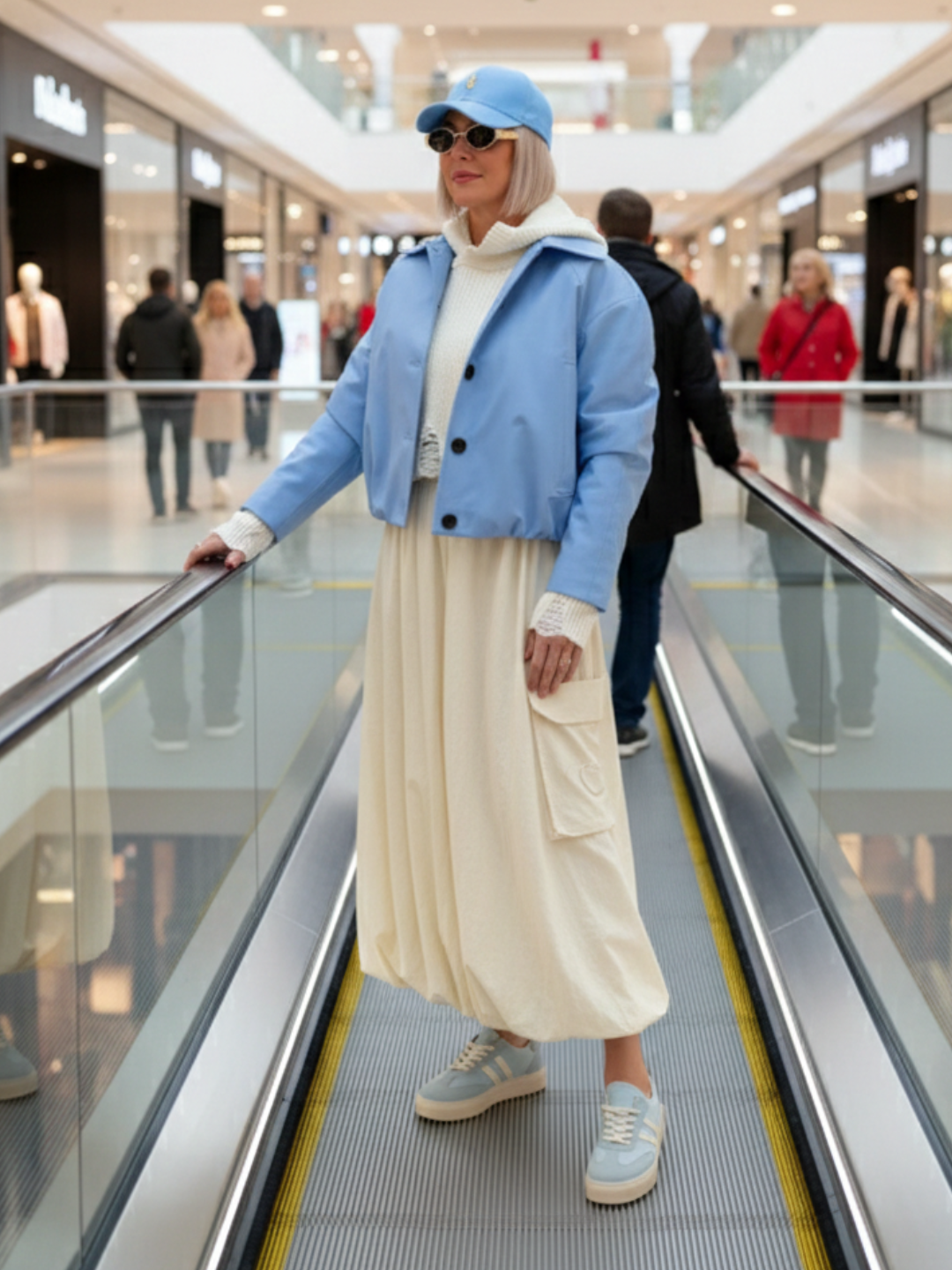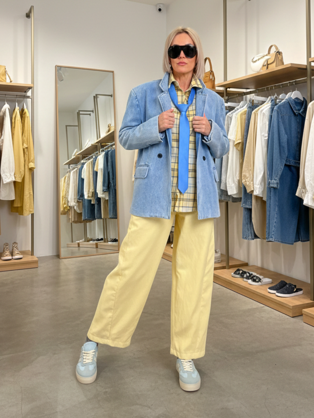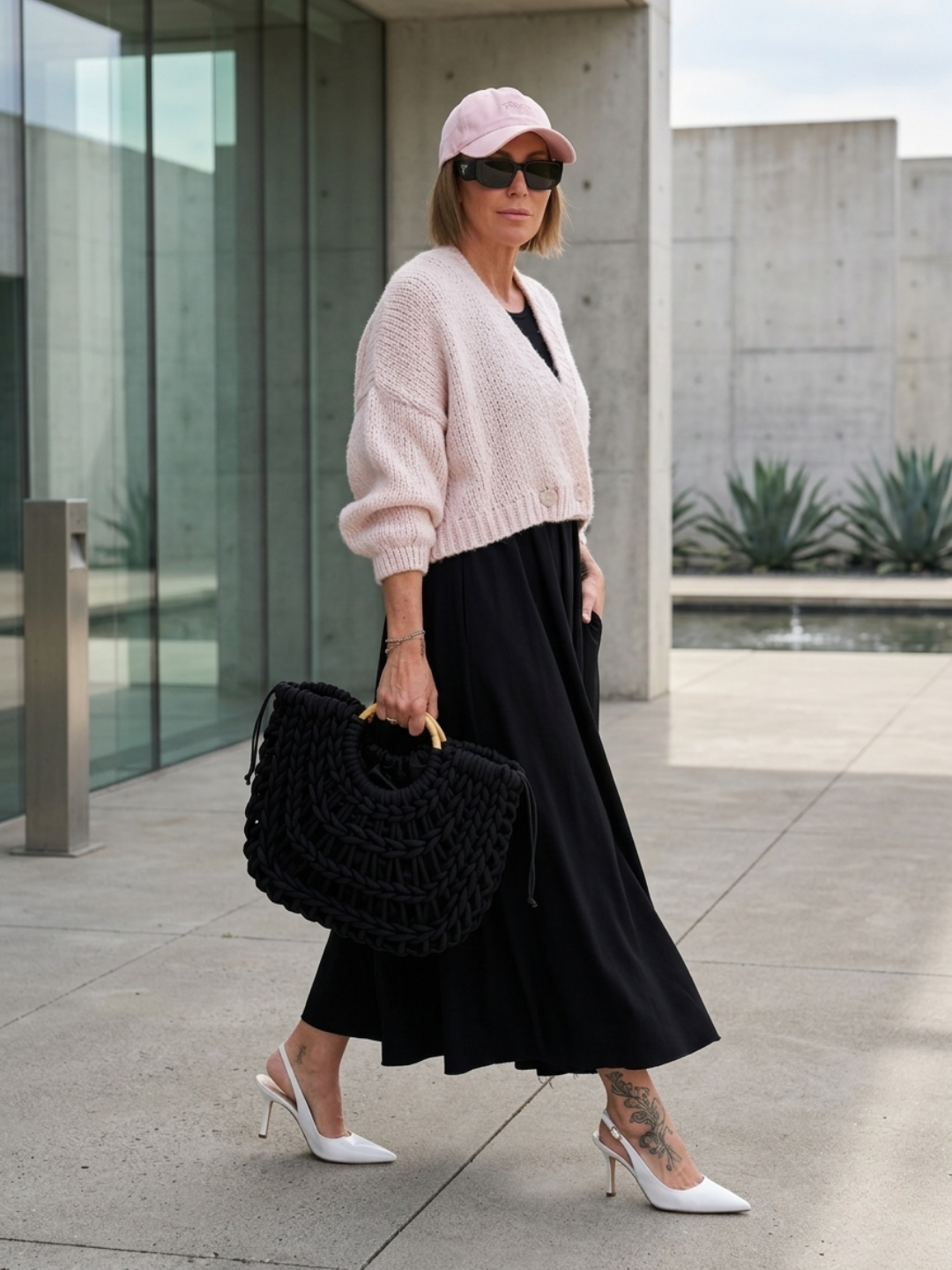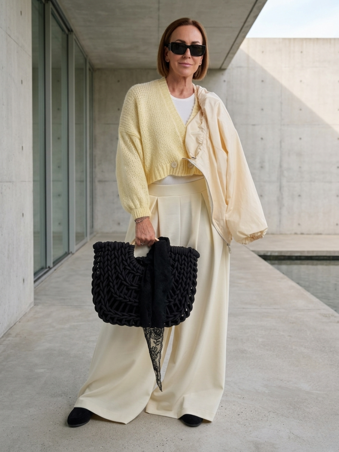 Tady je to přesně o té odvaze: Vyjít z domu v monochromatickém pastelovém outfitu. Pokud ale správně nakombinuješ textury, budeš se cítit naprosto luxusně. Tón v tónu postavu nerozbije, naopak ji krásně protáhne a zeštíhlí.