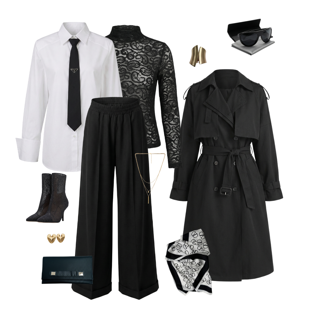 - Na večer: Černé palazzo kalhoty, krajkový top, výrazné náušnice. Hotovo.
