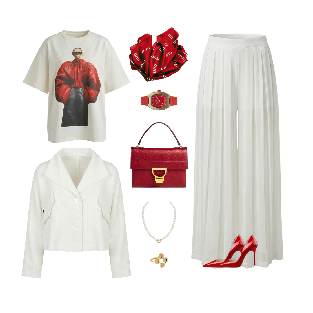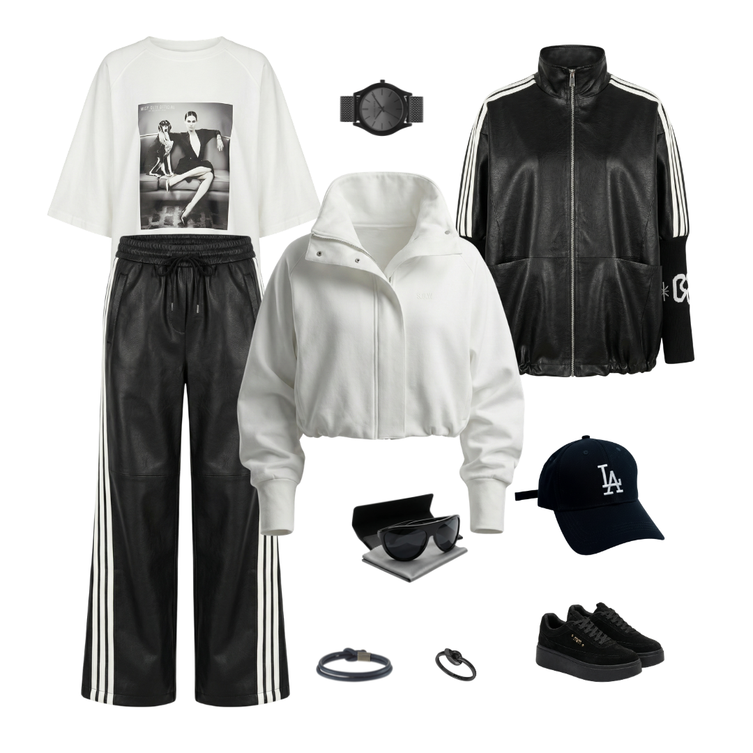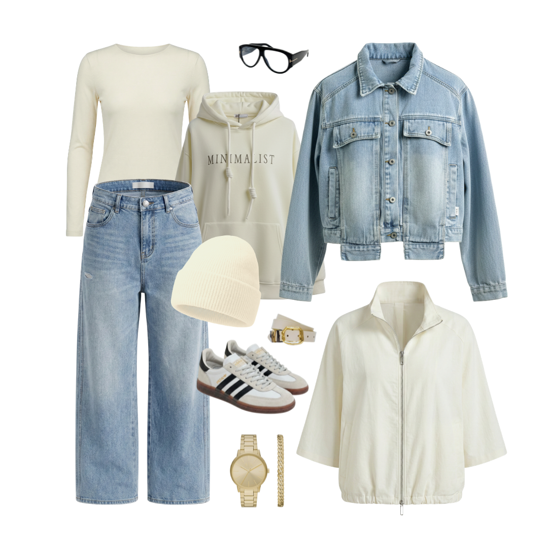 - Na volný den: Bílé tričko, tenisky a oversized svetr. Pohodlí s grácií.