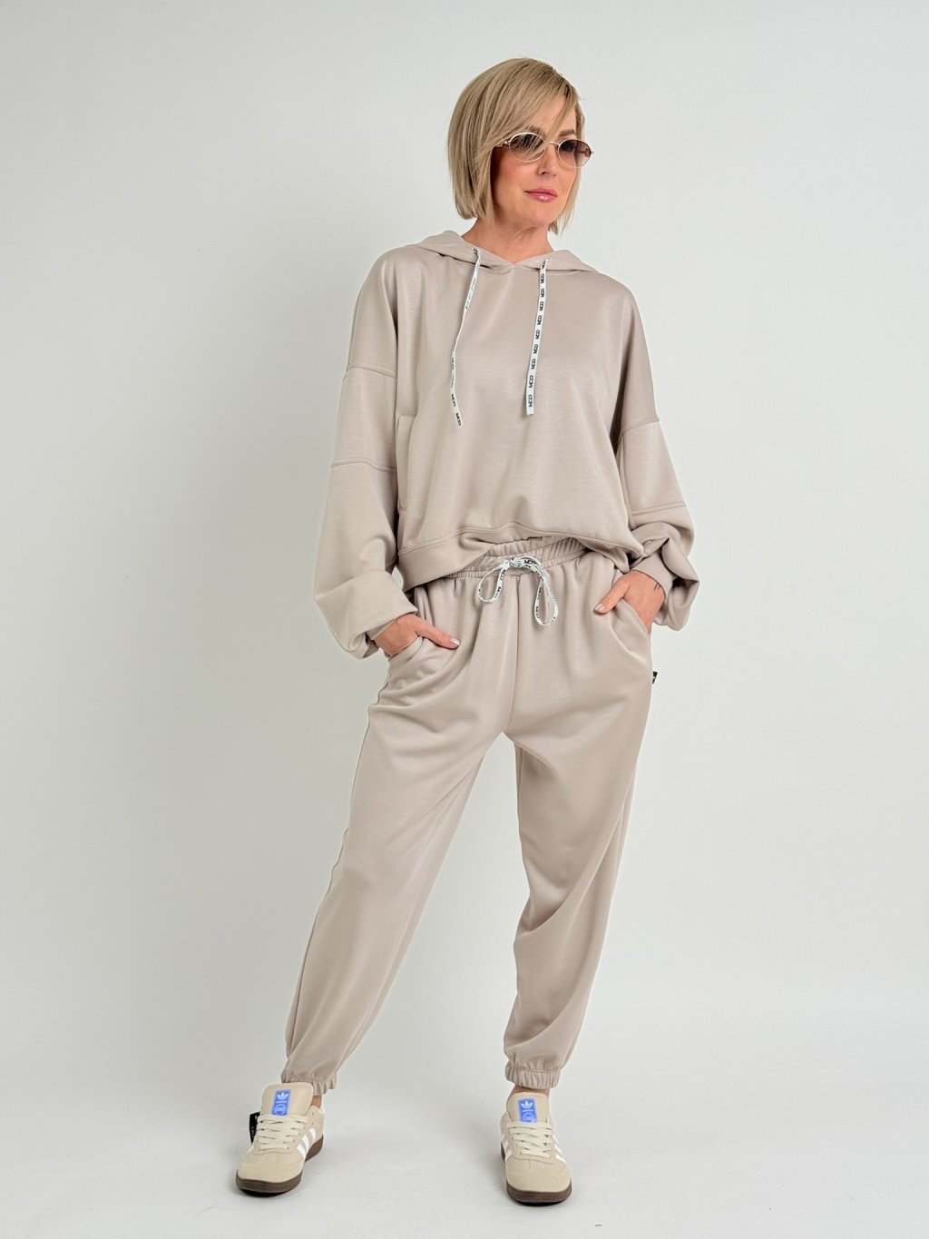 Jednoduché kalhoty v pase i na koncích nohavic do gumy, s postranními všitými kapsami.