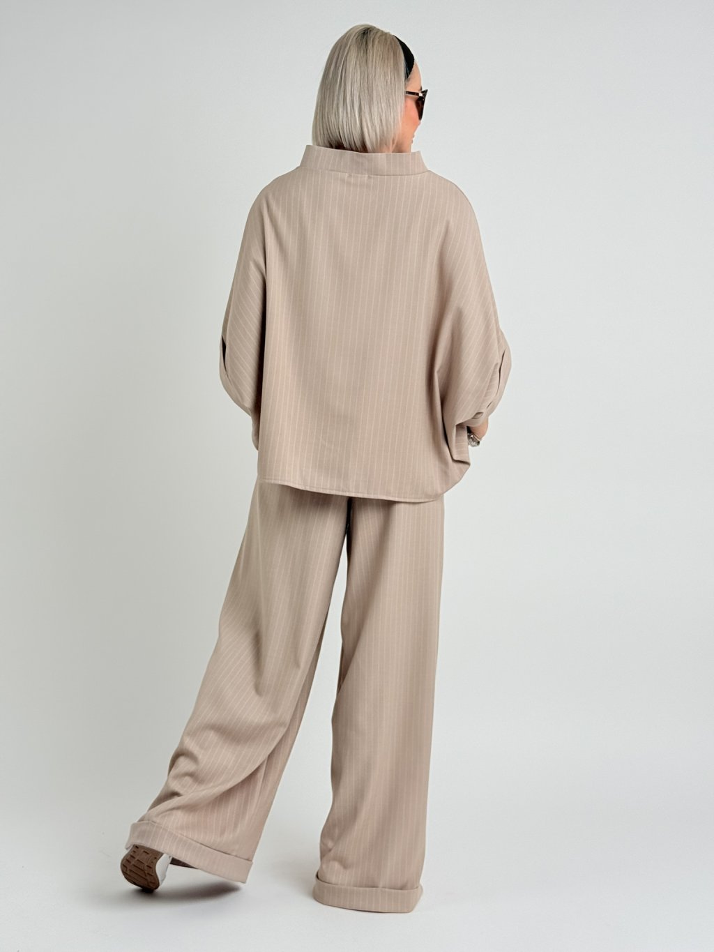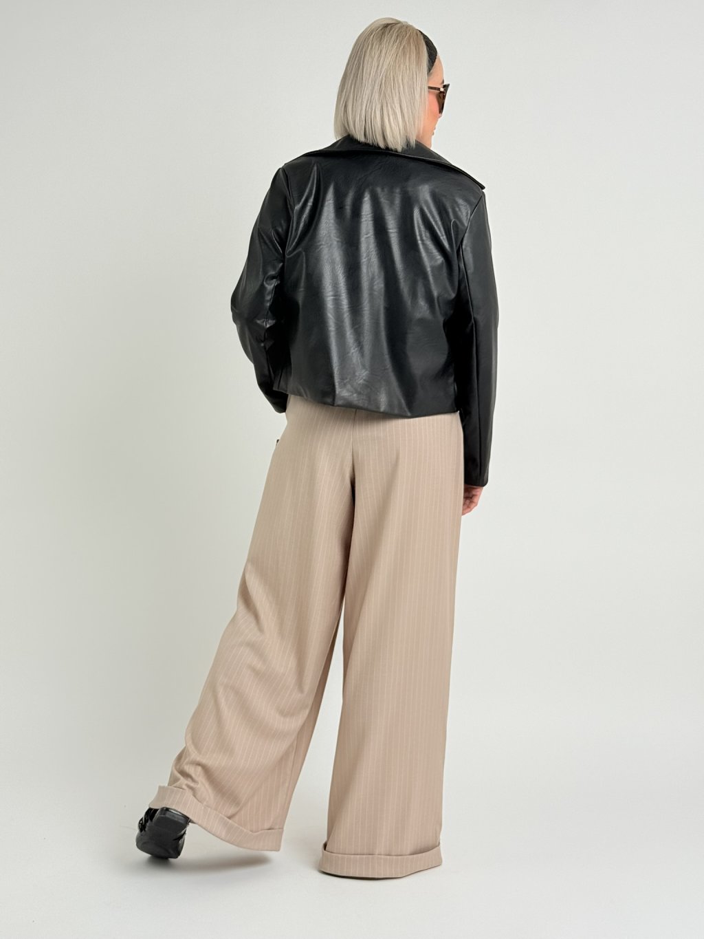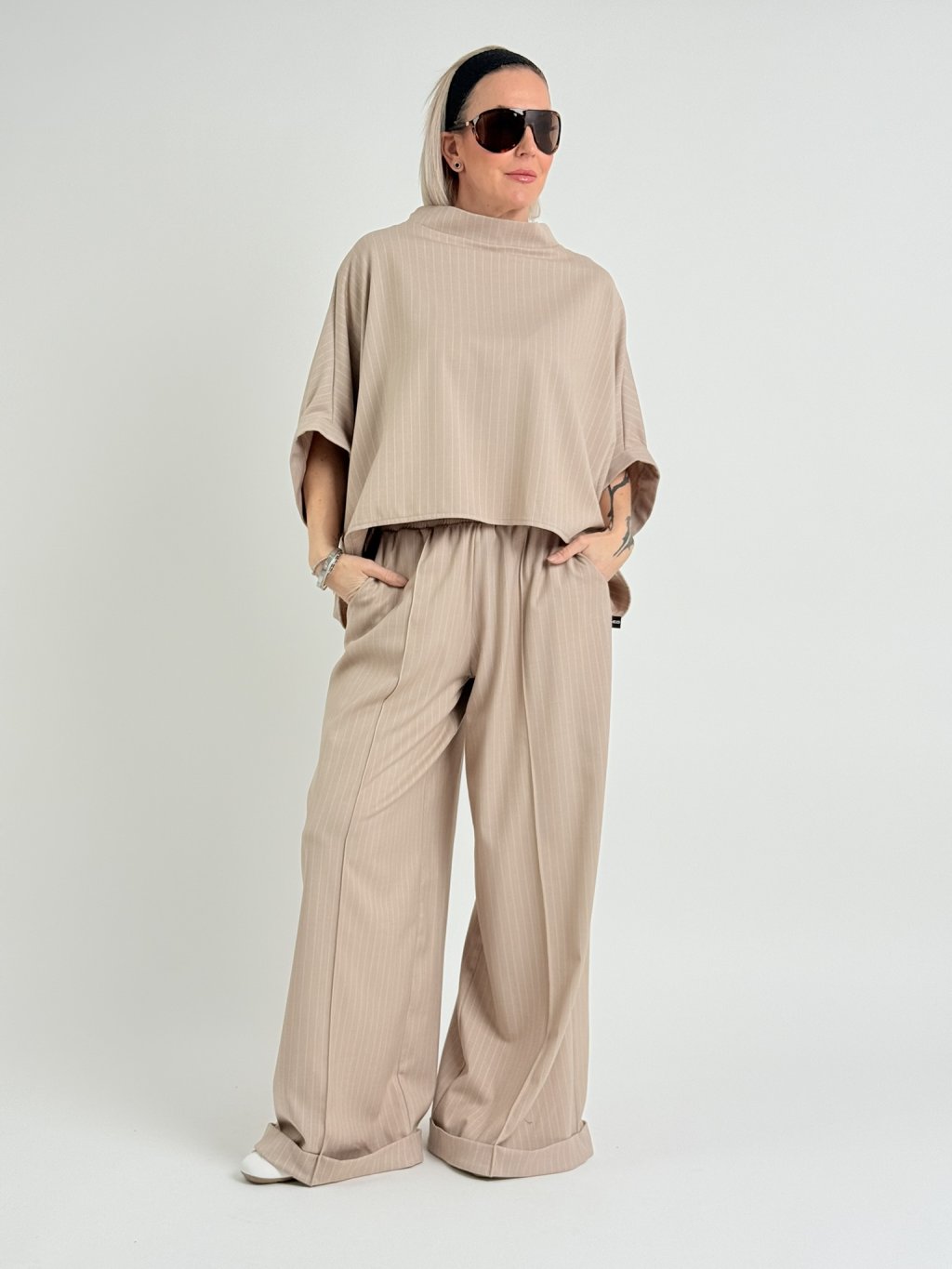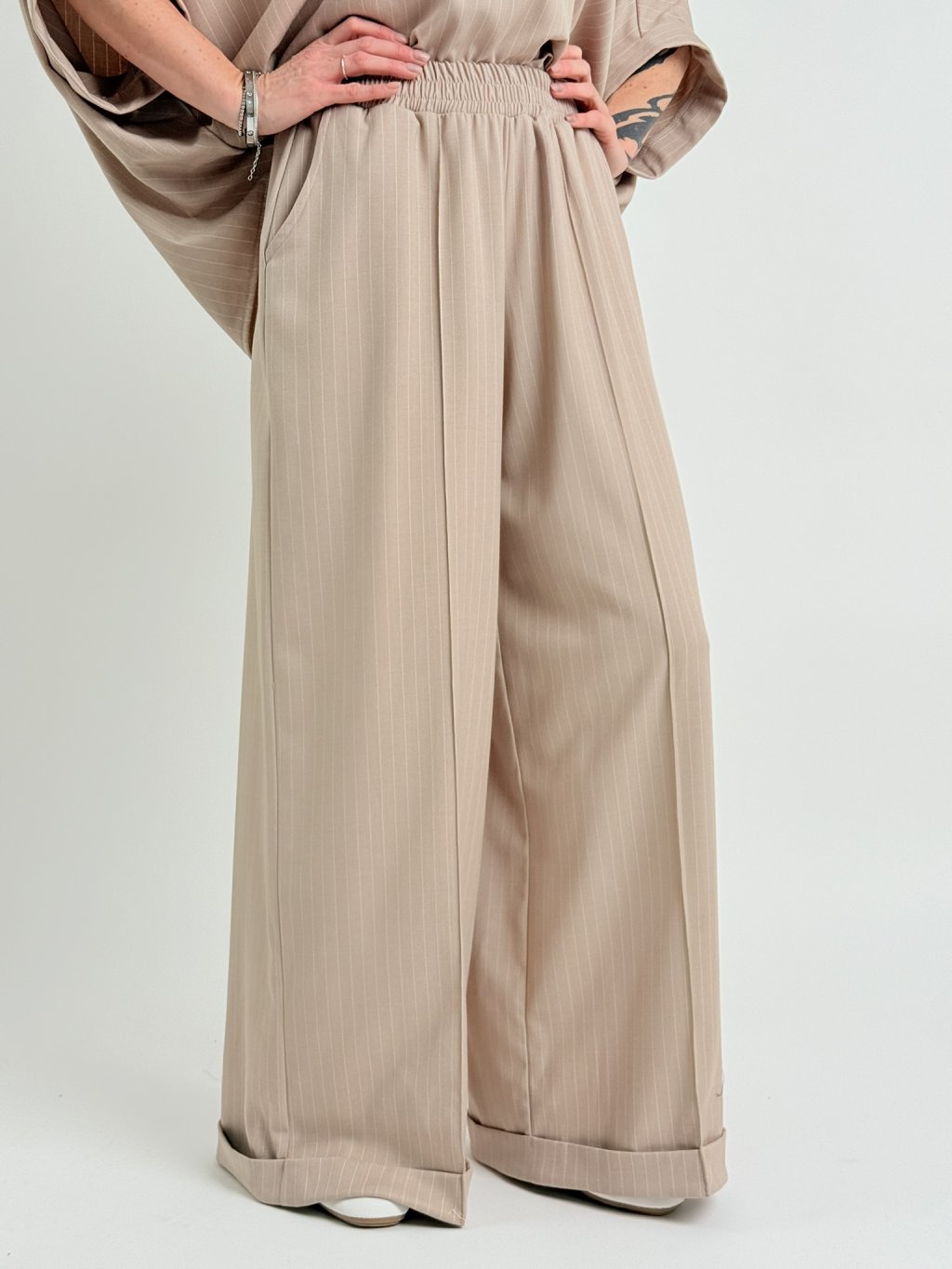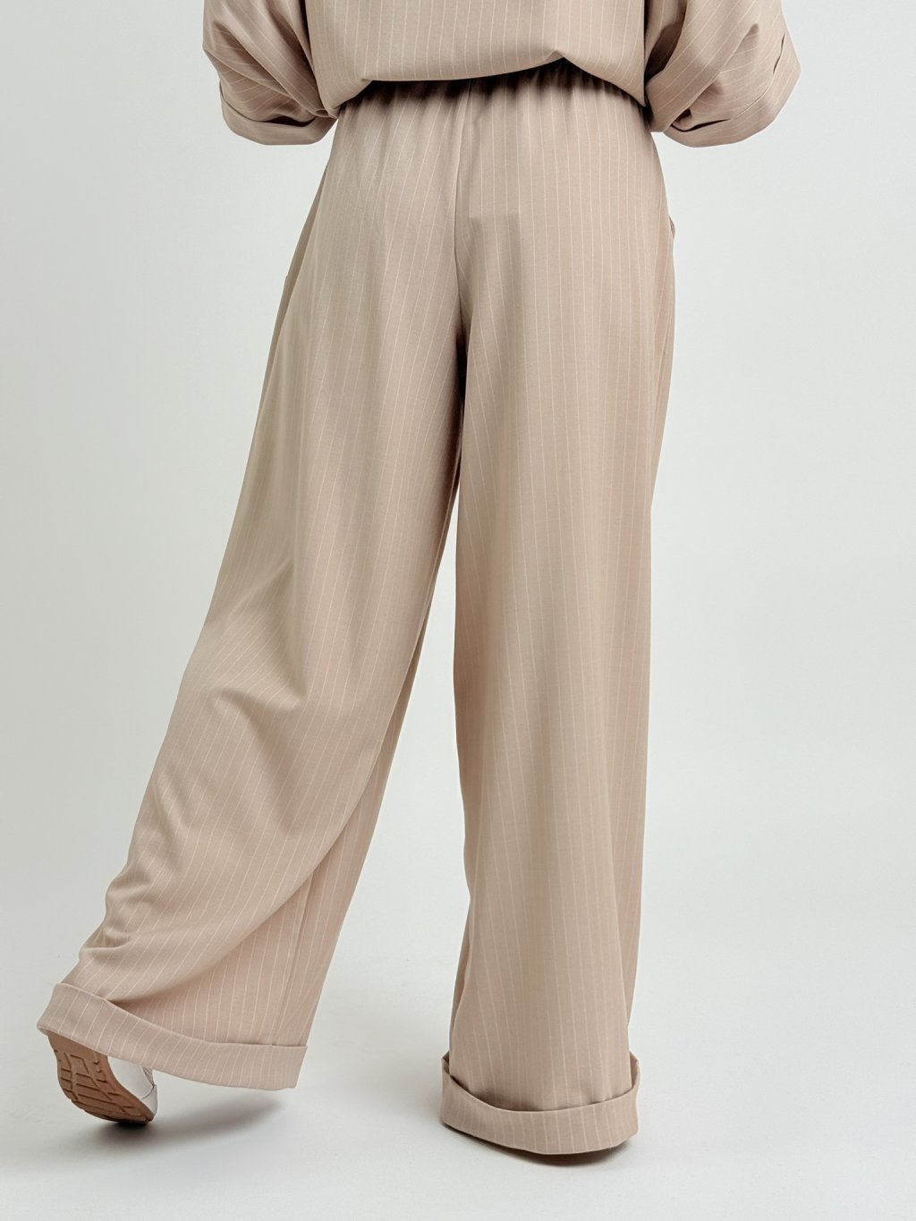 Široké kalhoty s proužkem, pukem a manžetou, v pase do gumy.
