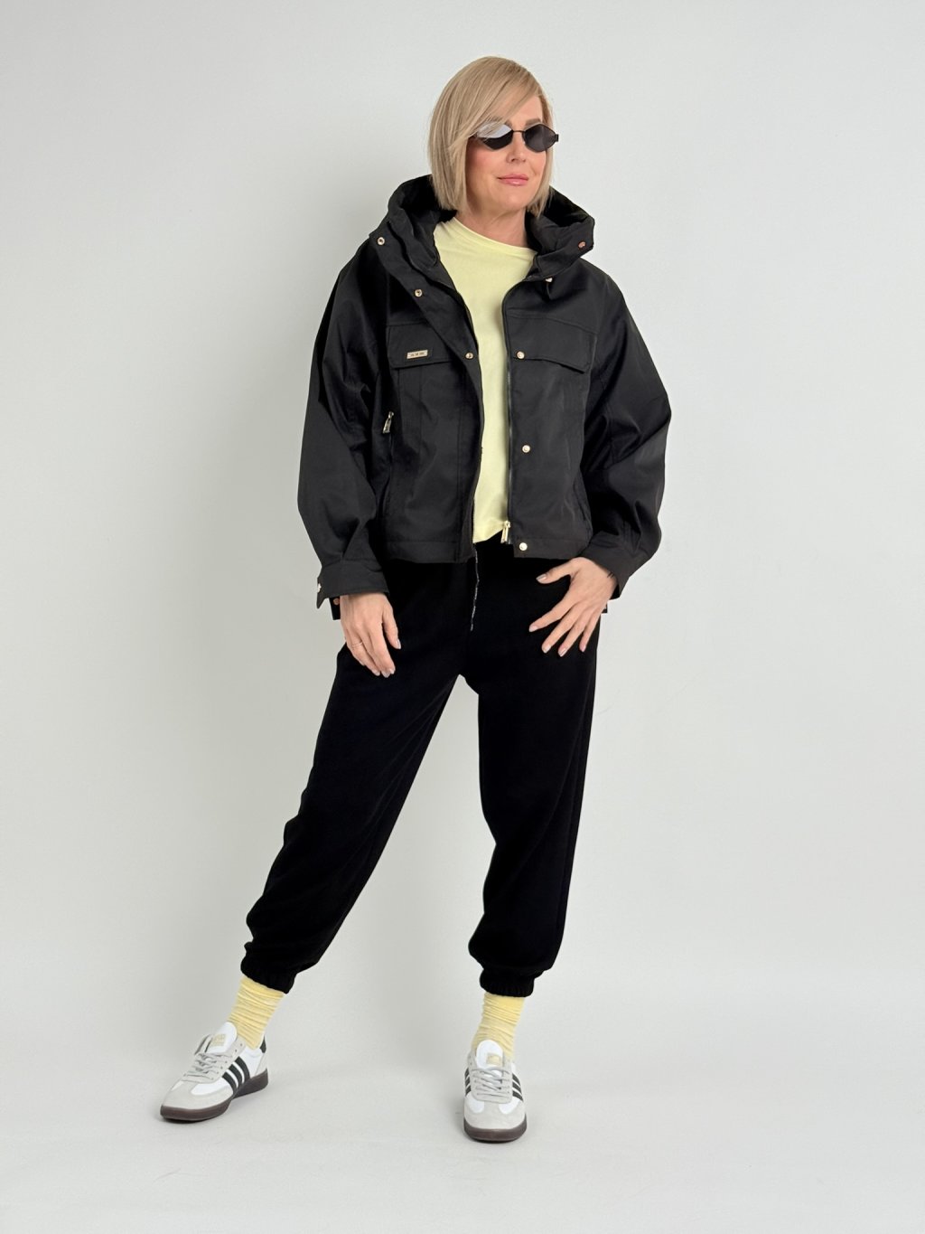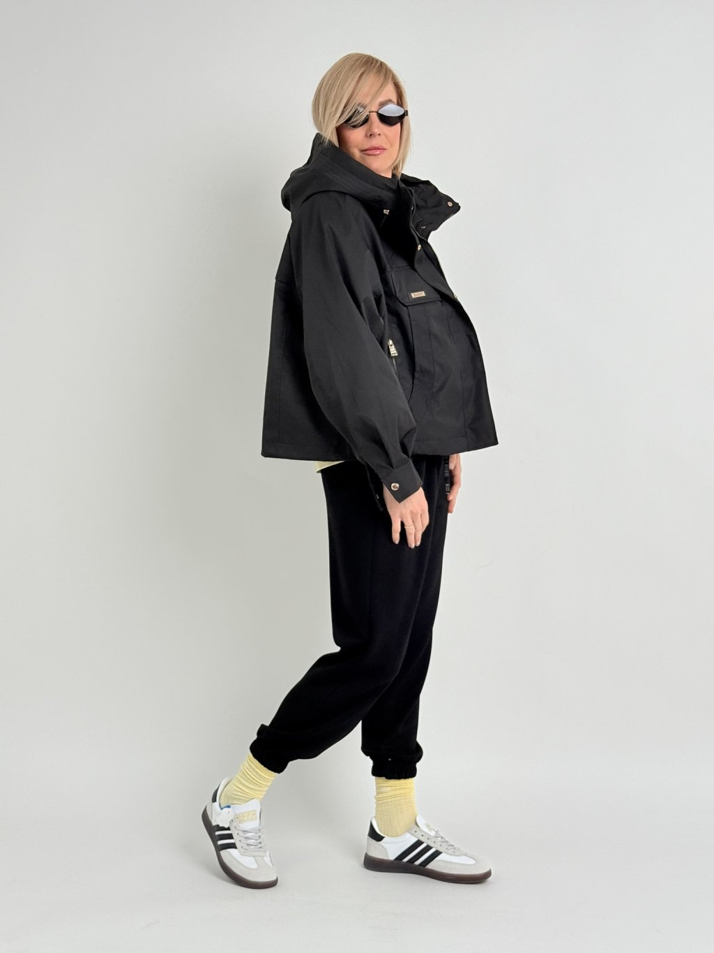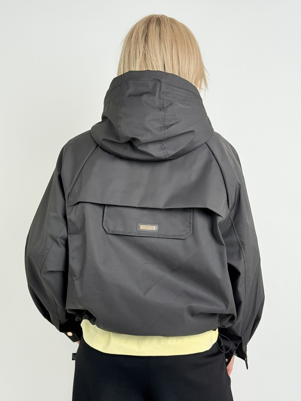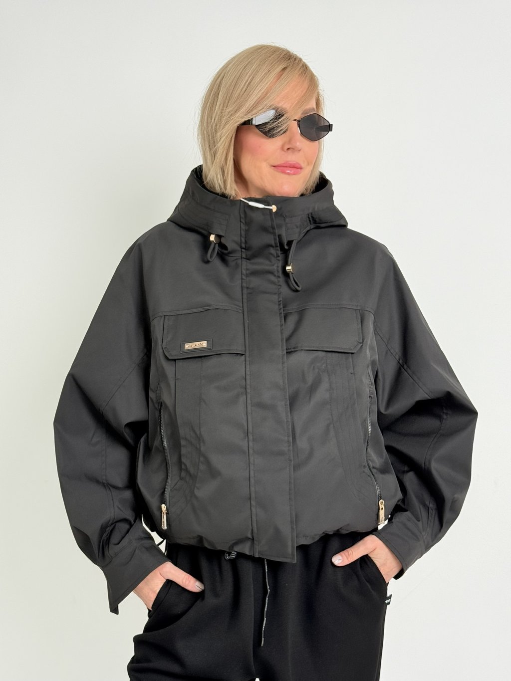 Kratší, volnější bundička  s kapucí, která vpředu přechází ve vysoký stoják, zapínání je na skrytý zip pod širší légou.. V dolní části je na stažení, rukáv se zapíná na patent.