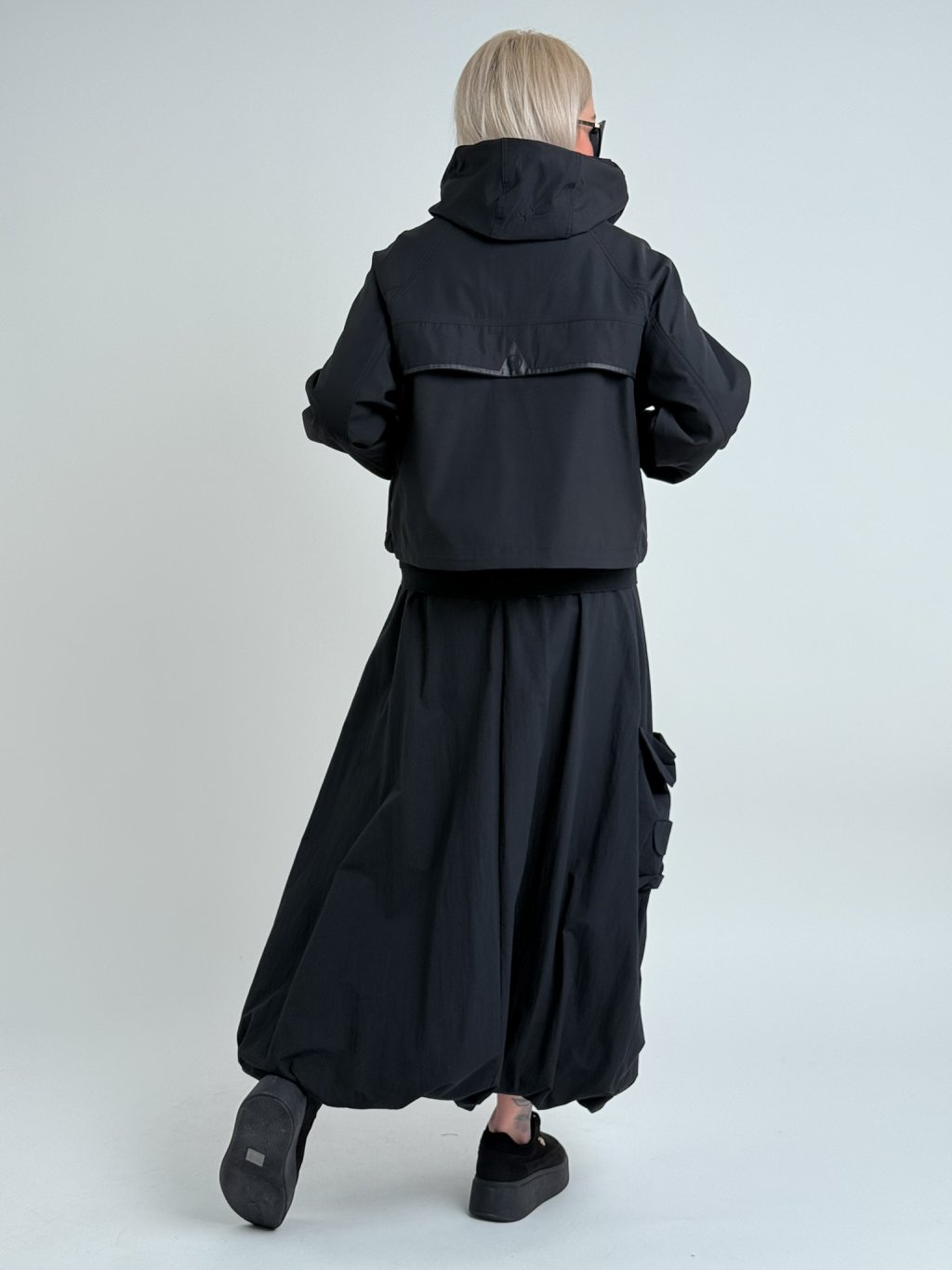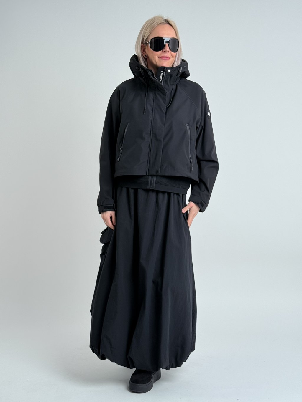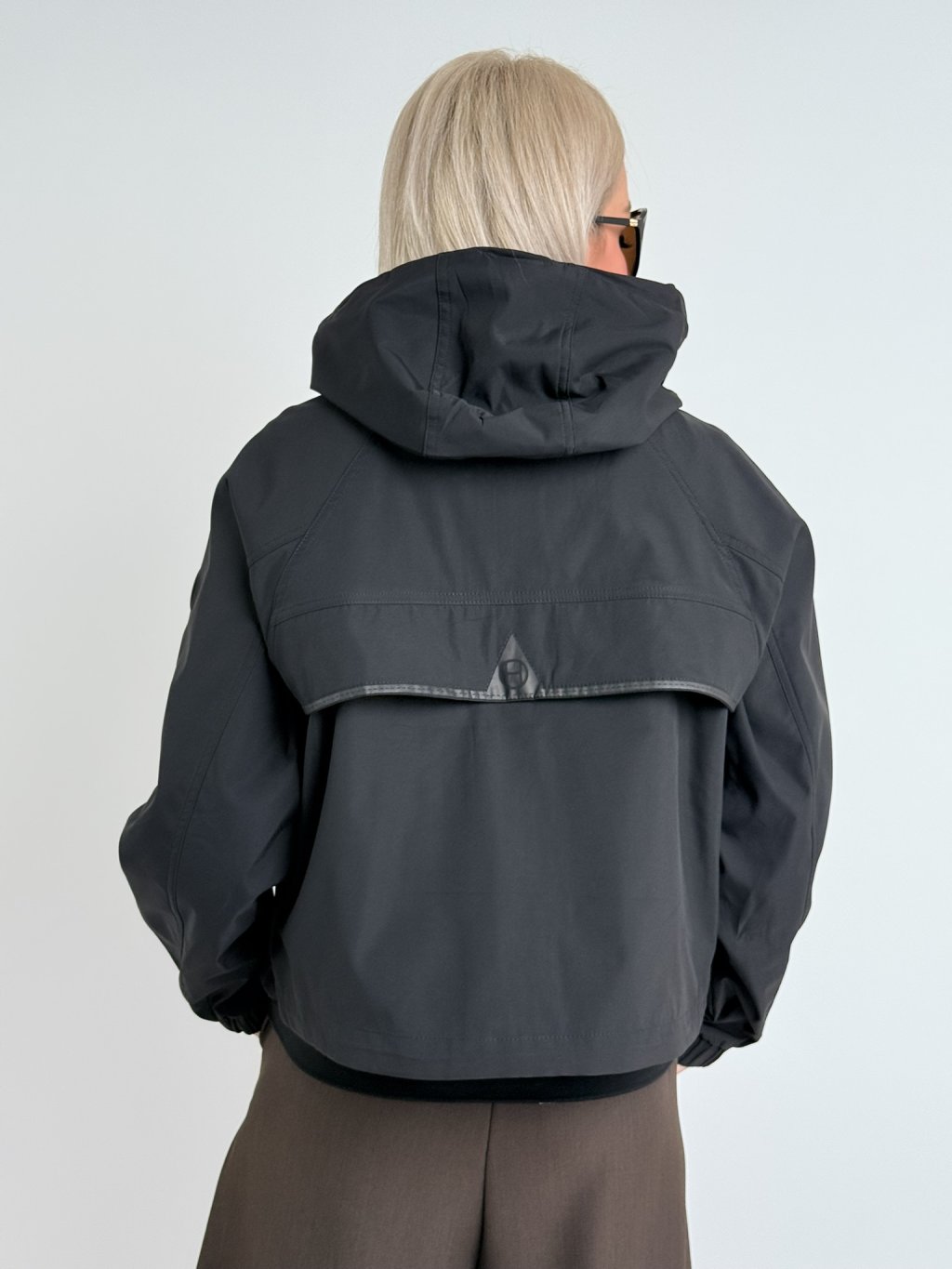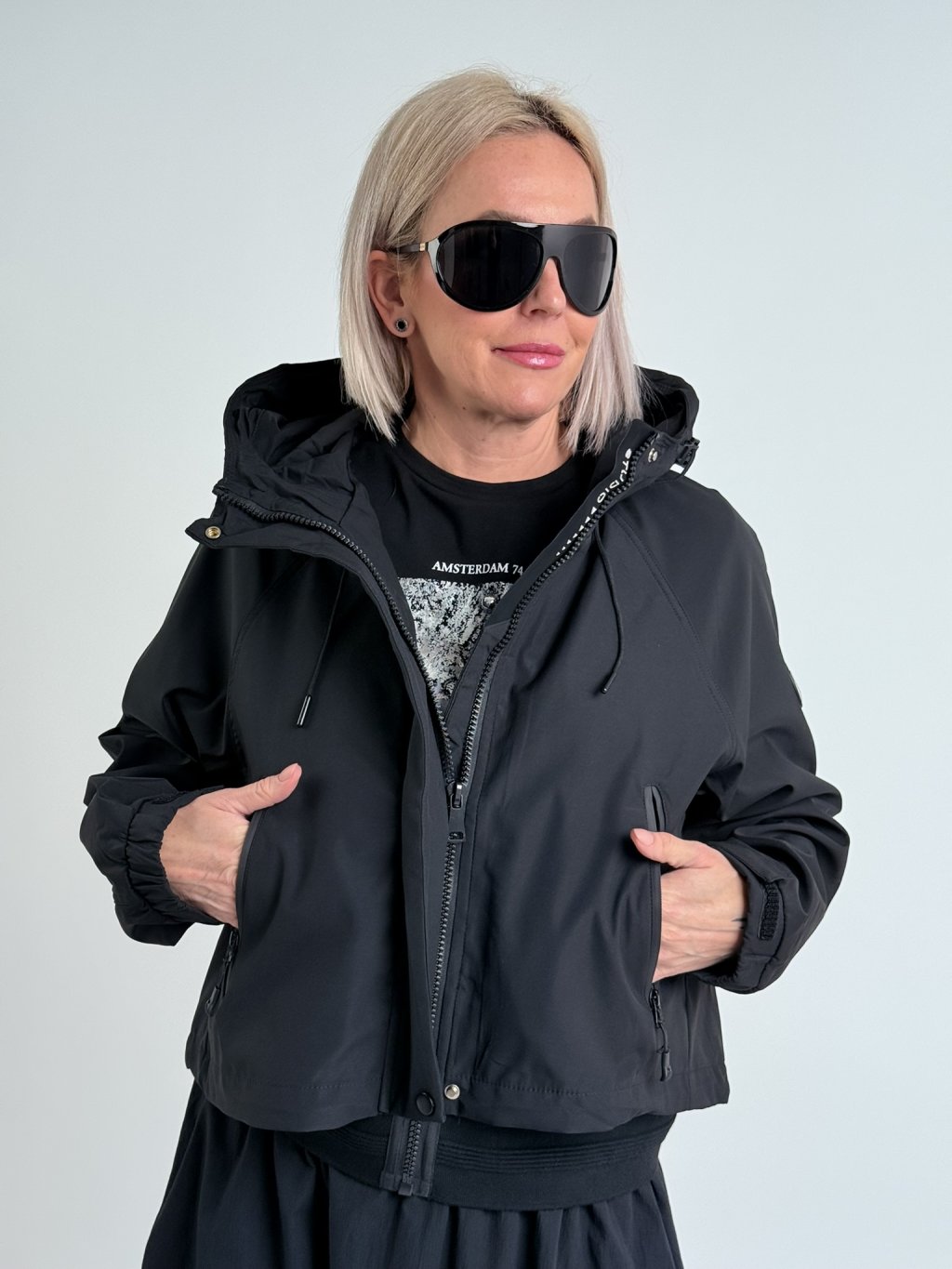 Šusťáková, nepromokavá bunda s raglánovým rukávem v dolní části se stažením na suchý zip. Bunda se zapíná na zip, který je krytý, na předním dílu jsou kapsy se zipy a stoják přechází do kapuci. V dolní části bundy je široký, volný náplet.