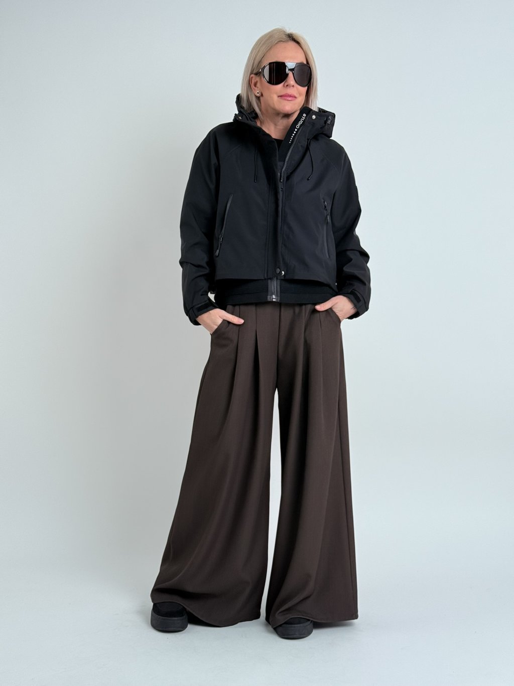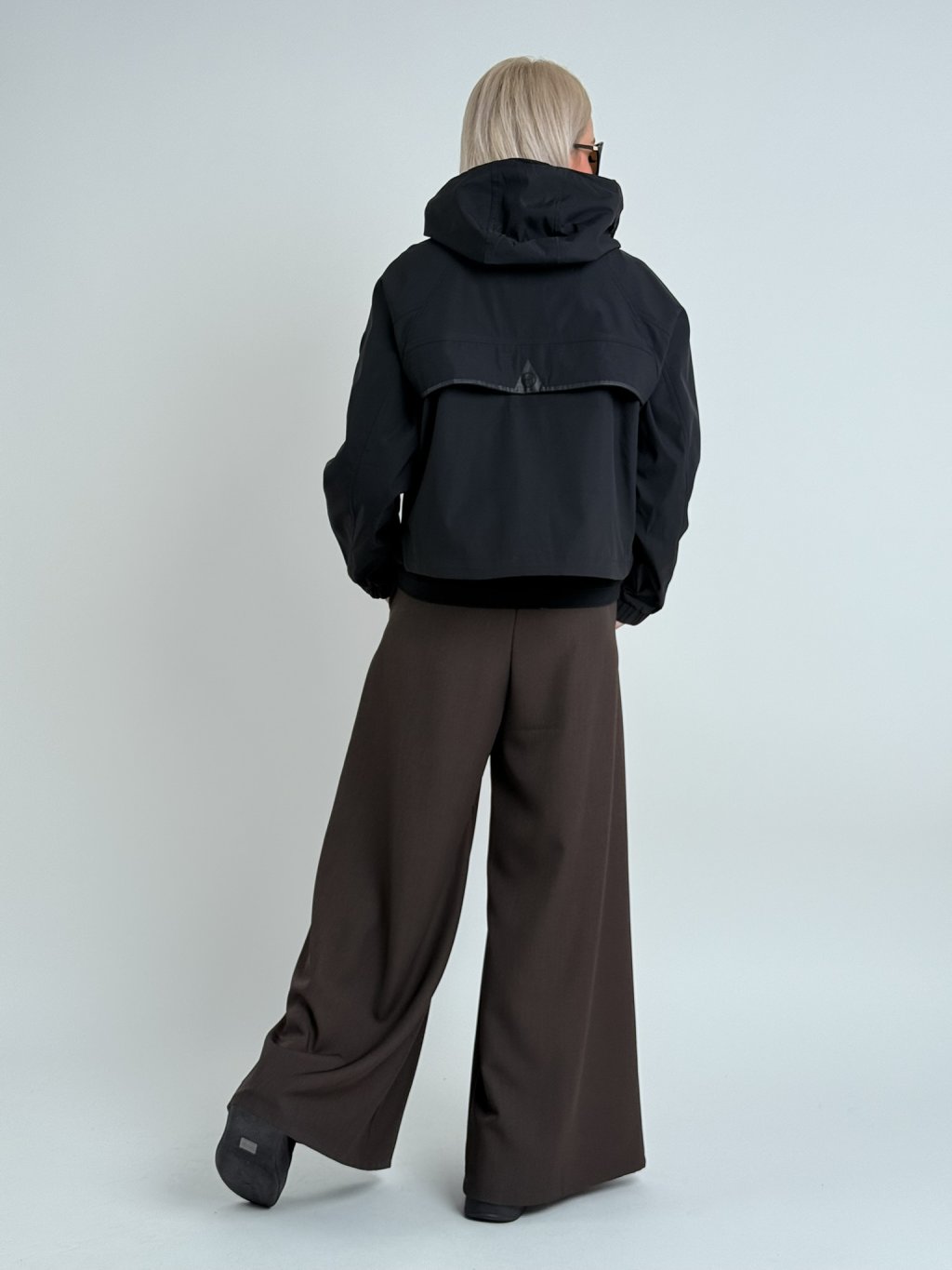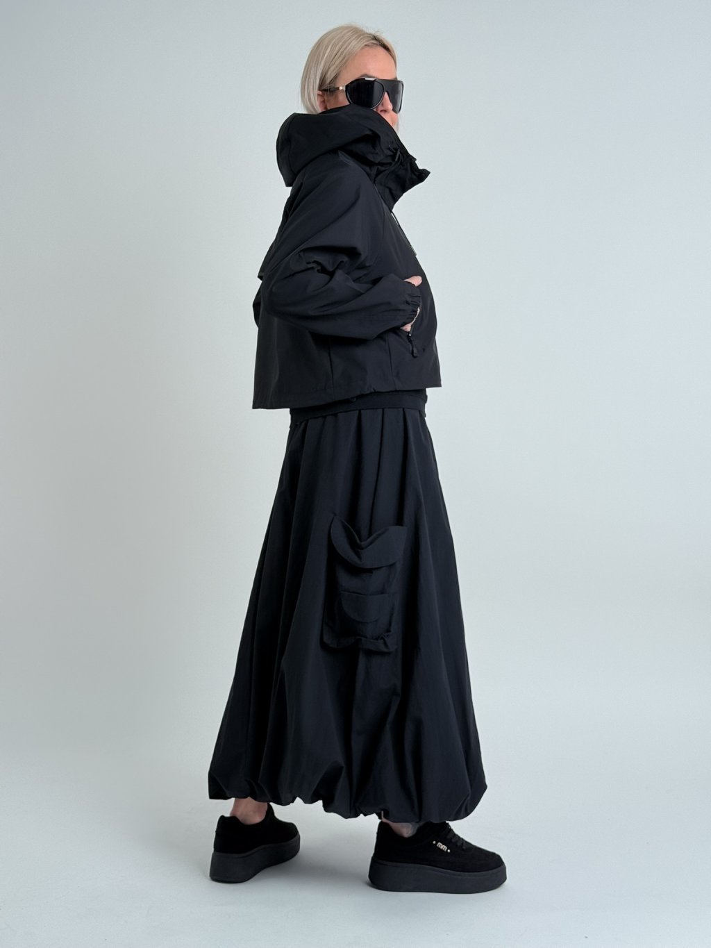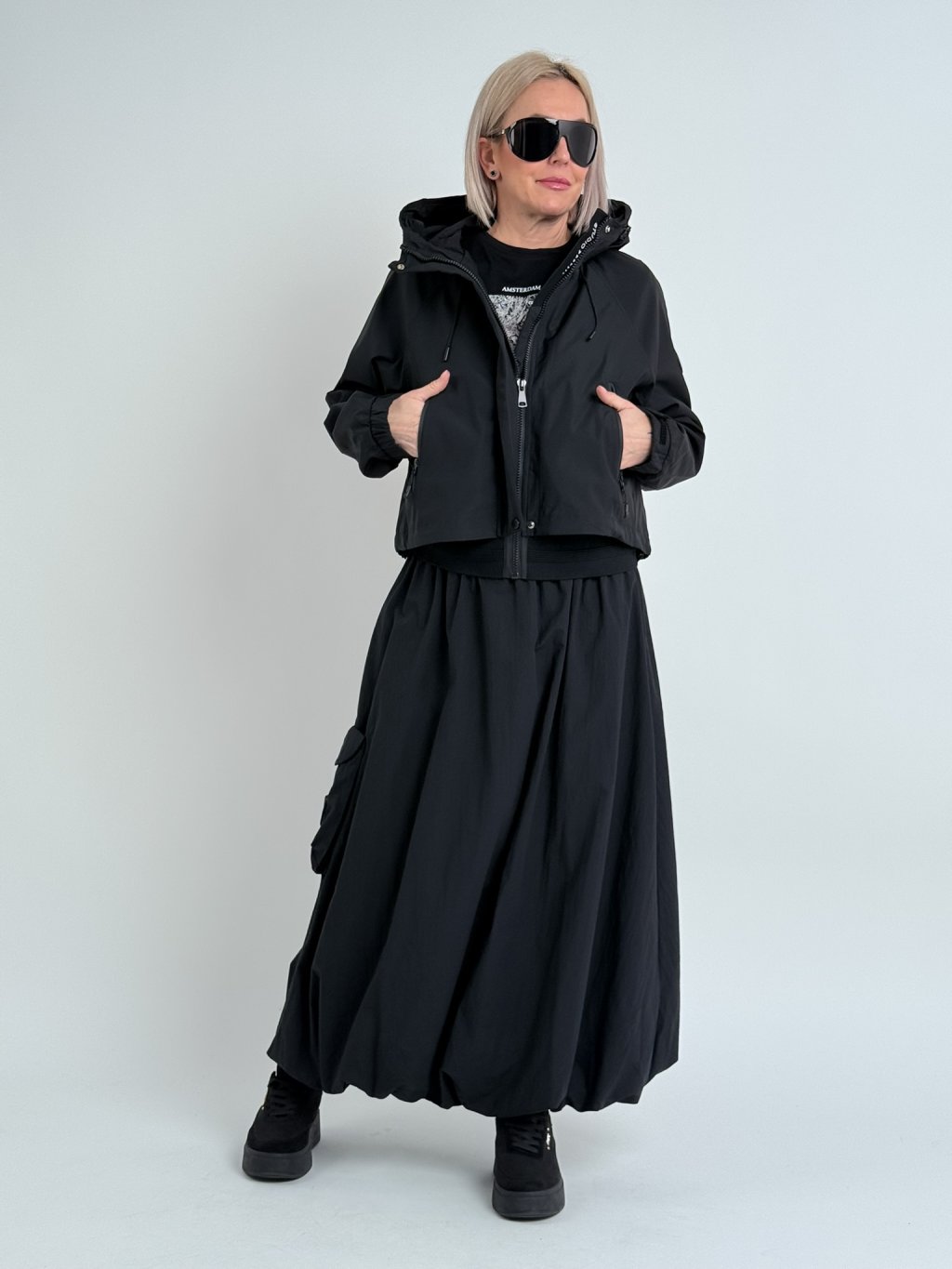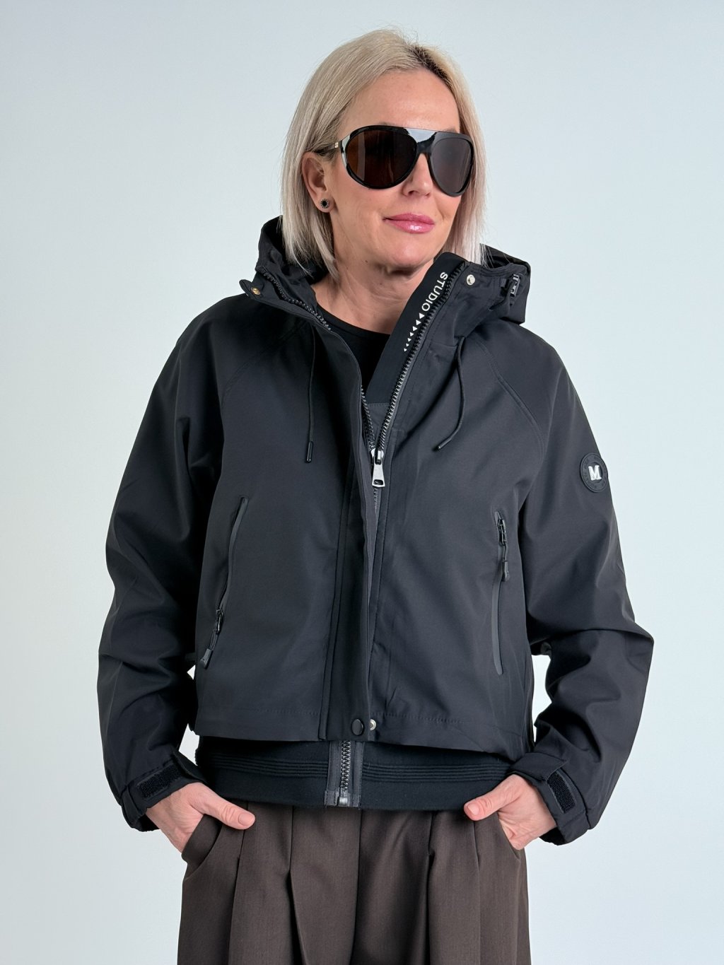 Šusťáková, nepromokavá bunda s raglánovým rukávem v dolní části se stažením na suchý zip. Bunda se zapíná na zip, který je krytý, na předním dílu jsou kapsy se zipy a stoják přechází do kapuci. V dolní části bundy je široký, volný náplet.