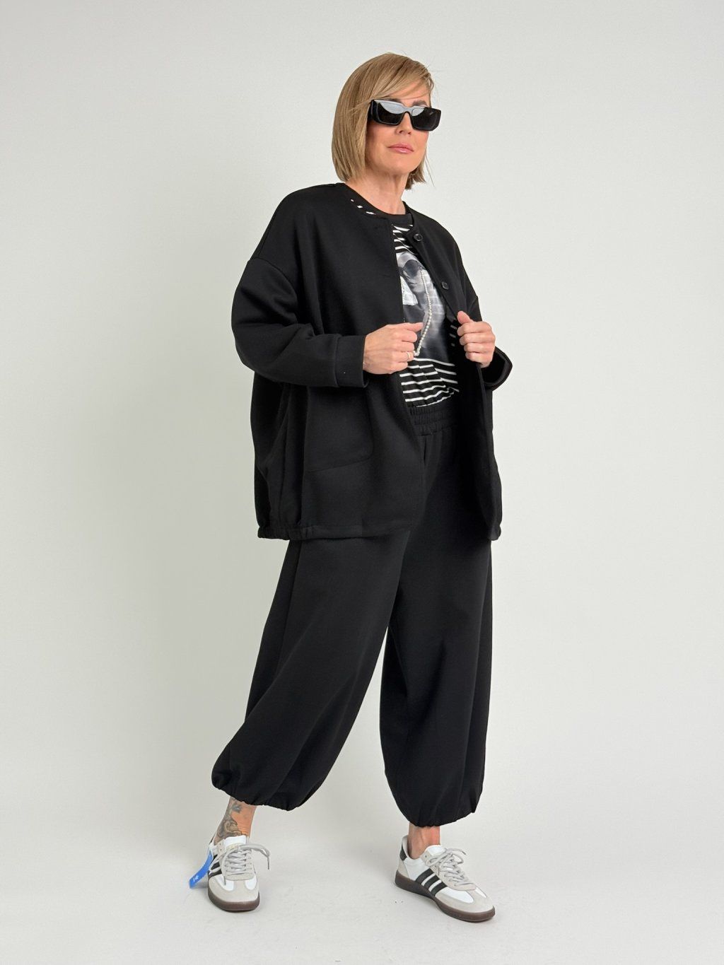 Super kabátek nebo bunda z pevnější teplákoviny, bez podšívky, s kulatým výstřihem, zapínáním na 3 knoflíky, po stranách do gumy.