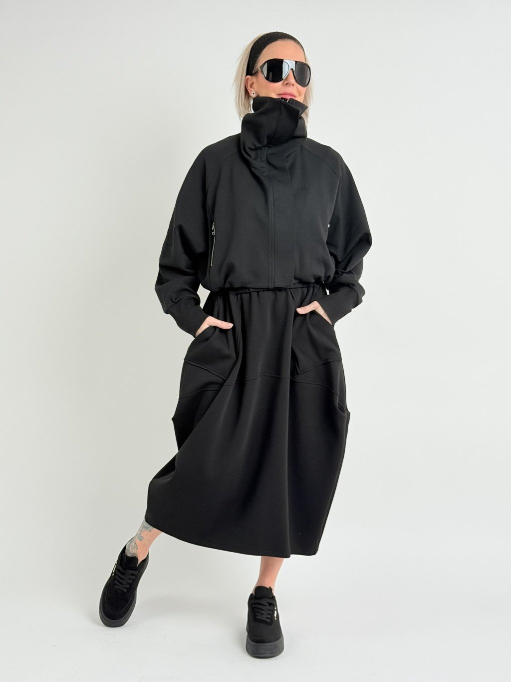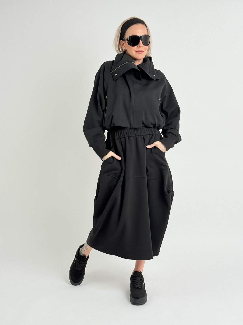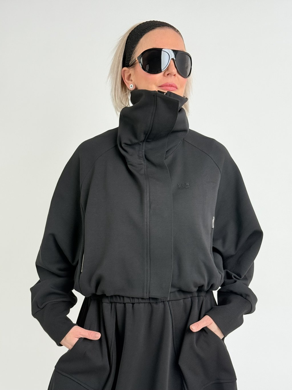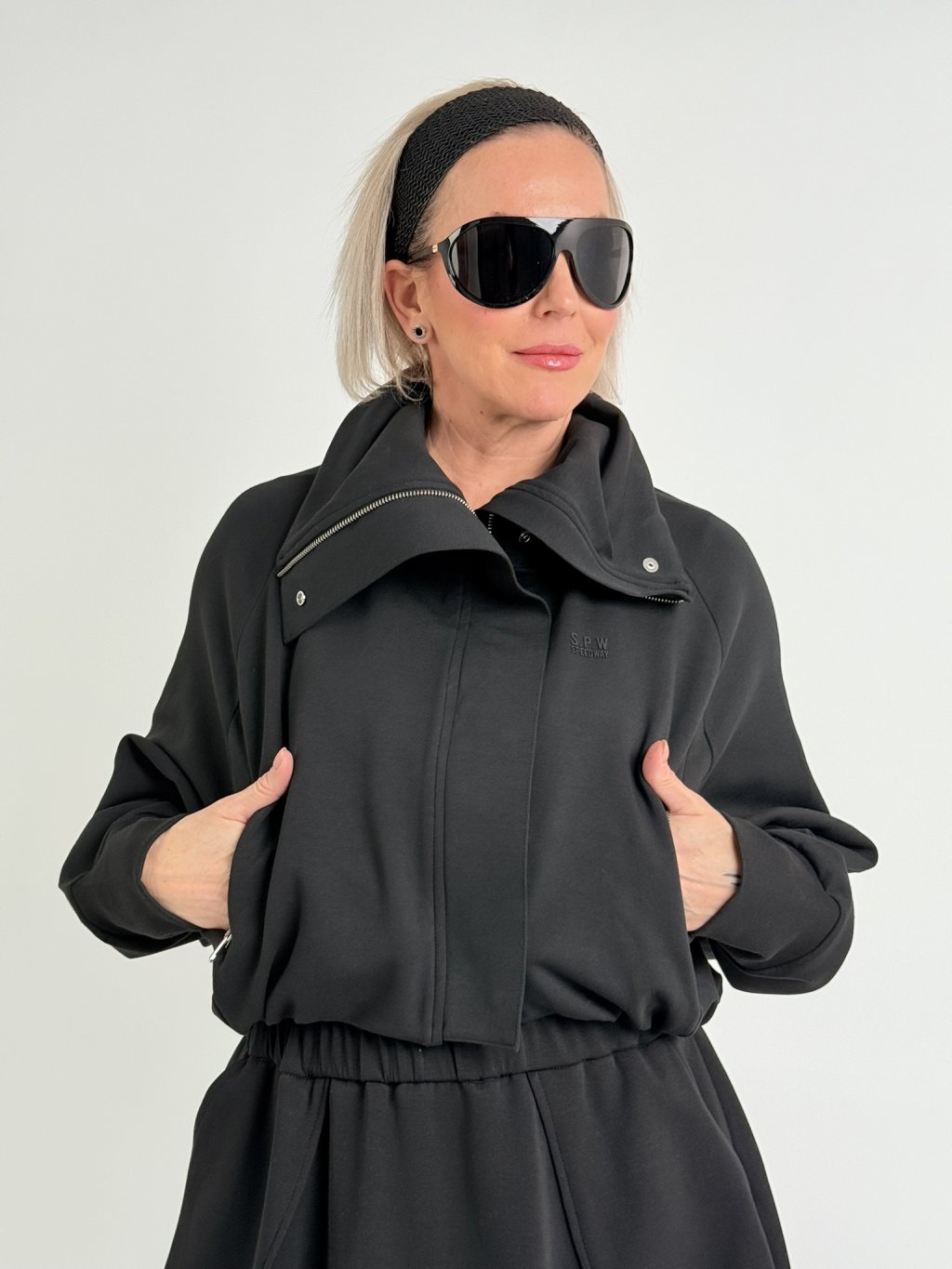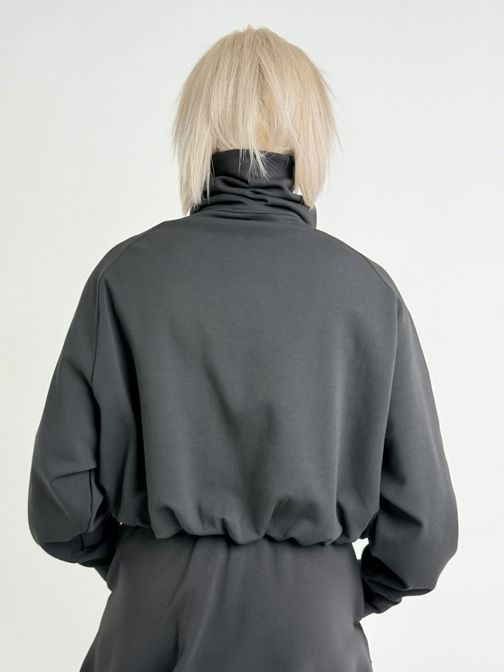 Mikinová bundička s podšívkou, vysokým stojákem, zapínáním na skrytý zip pod légou, v pase do gumy, s raglánovým rukávem.