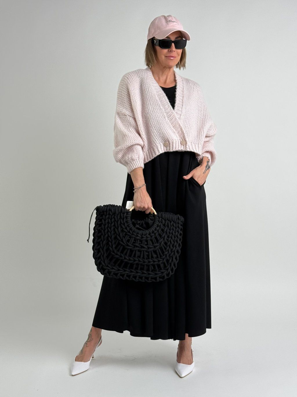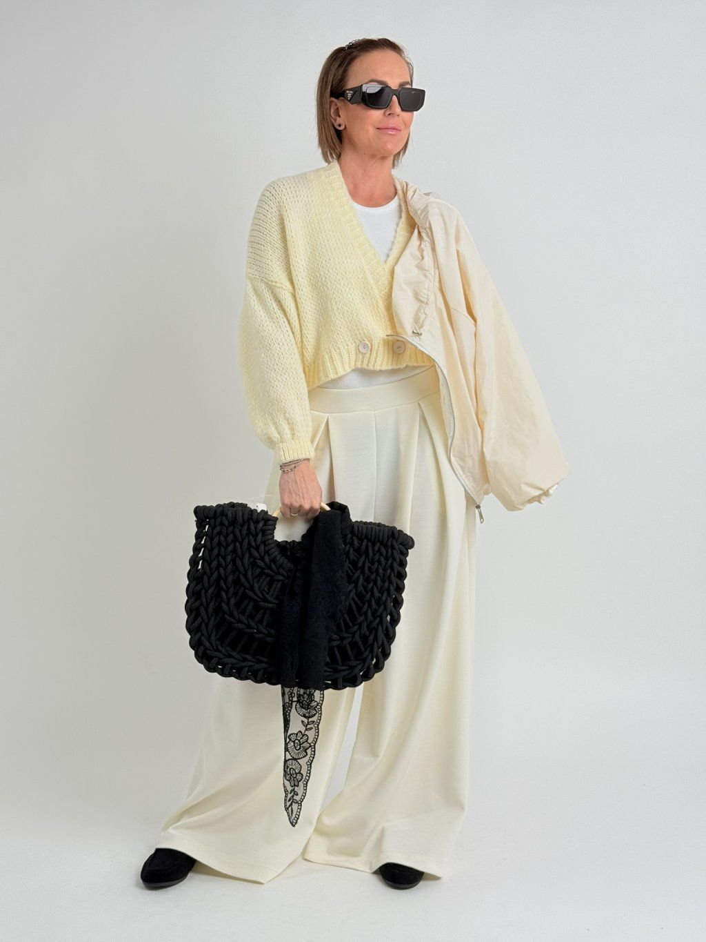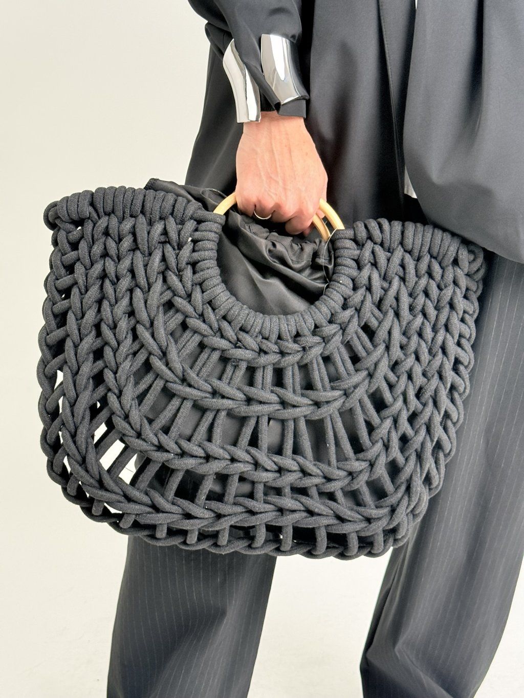 Nádherná, pletená kabela s dřevěnými uchy a se zatahovacím vakem uvnitř kabely.