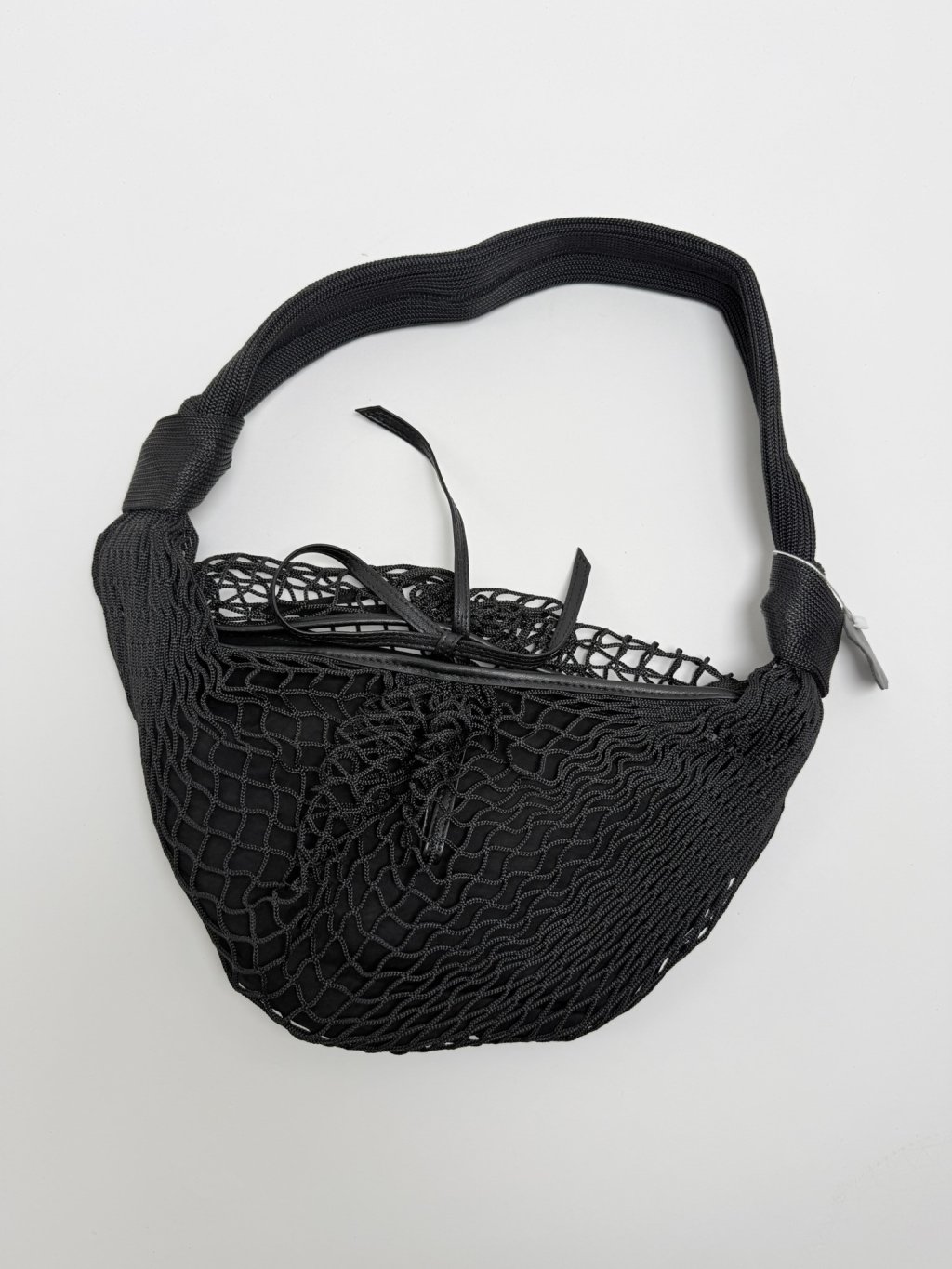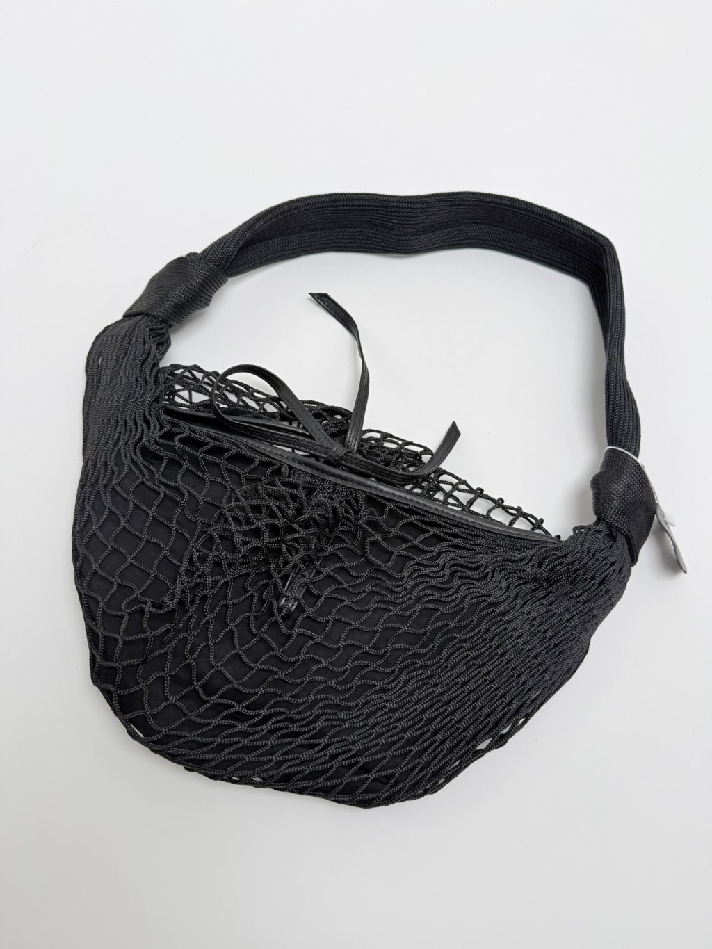 Menší kabelka s koženými detaily v kombinaci se síťovinou, uvnitř je černá taštička se zapínáním na zip, uvnitř s jednou kapsičkou bez zipu, jednou se zipem.