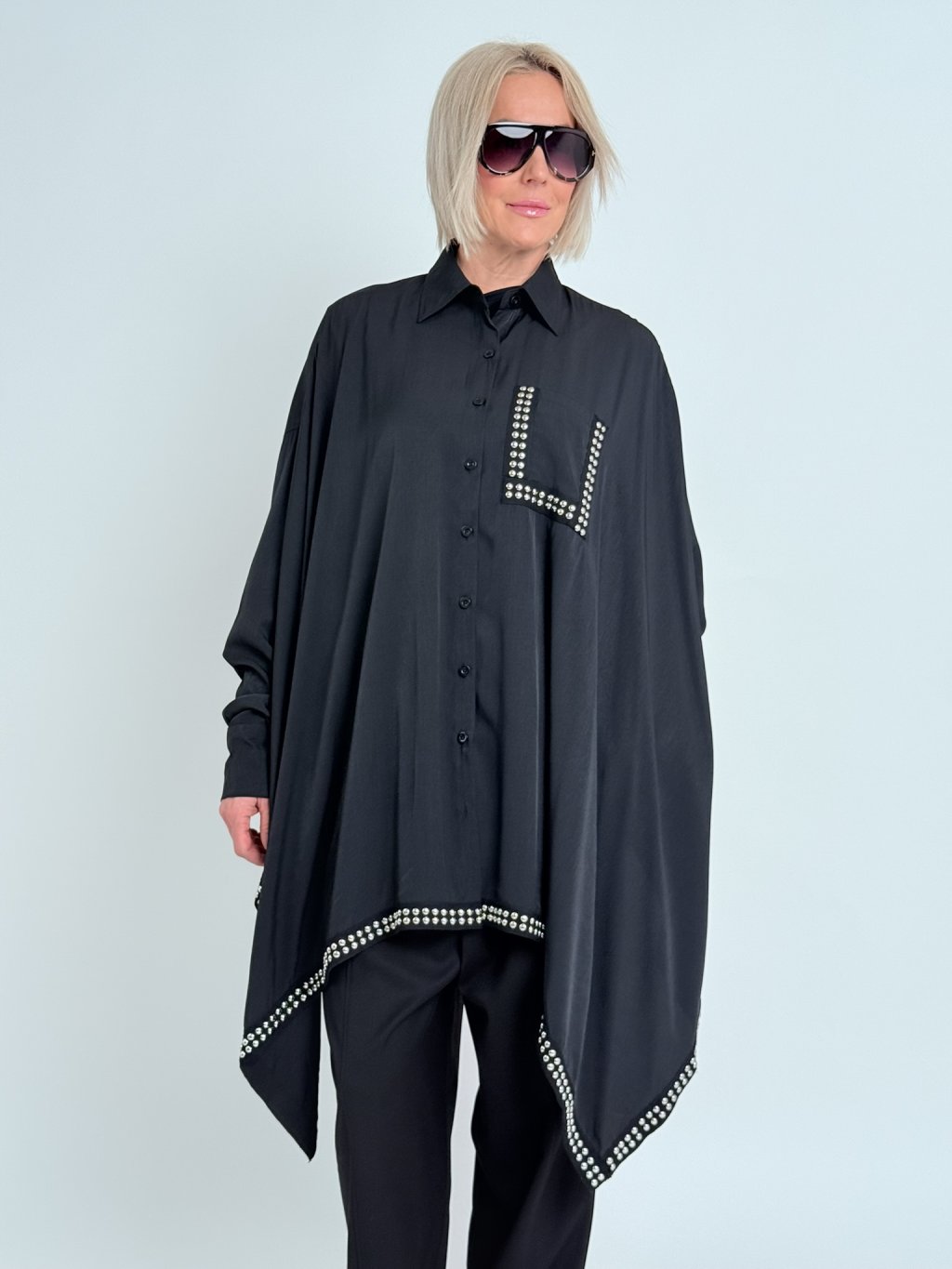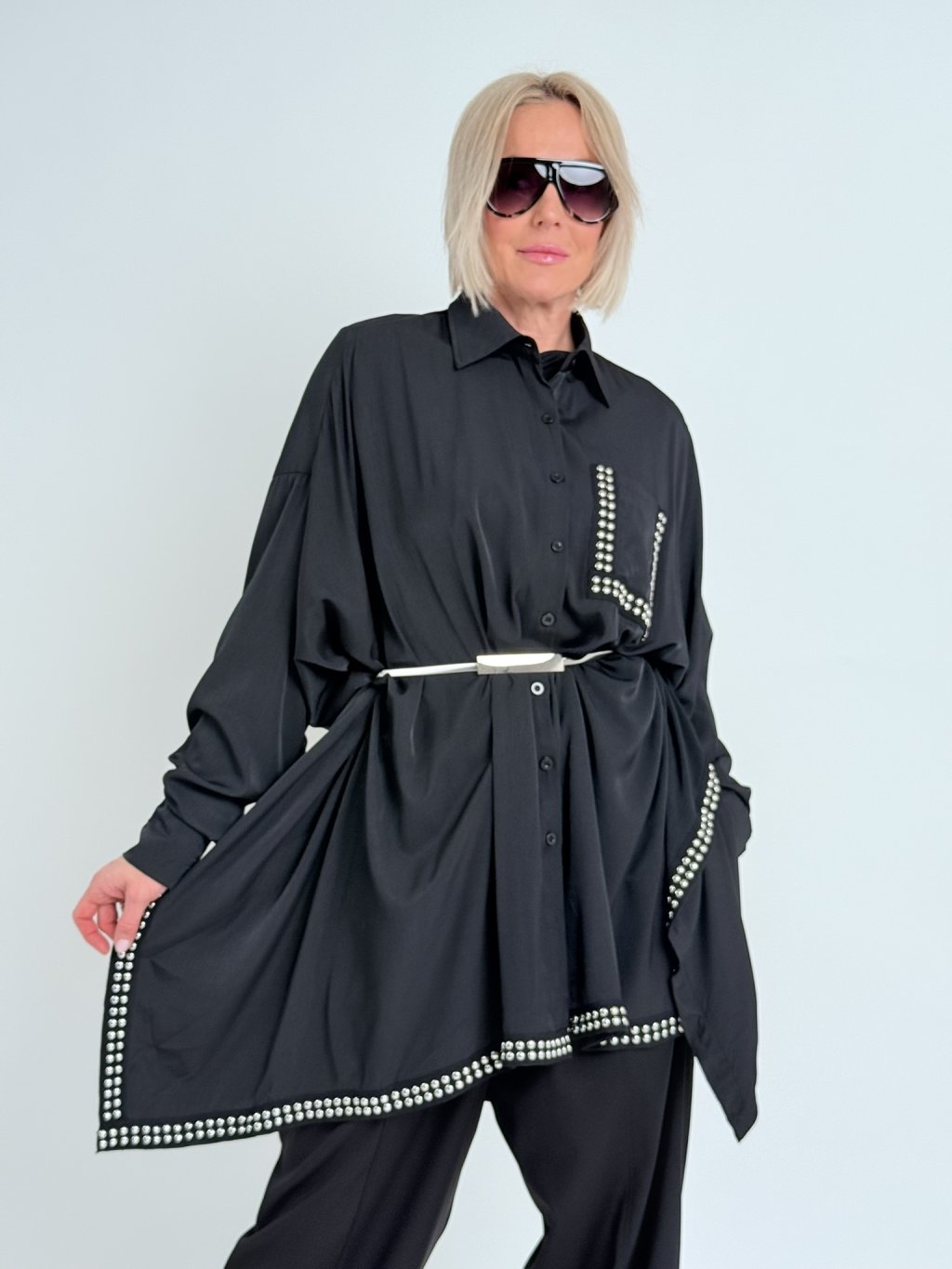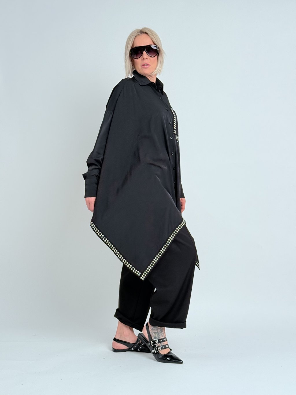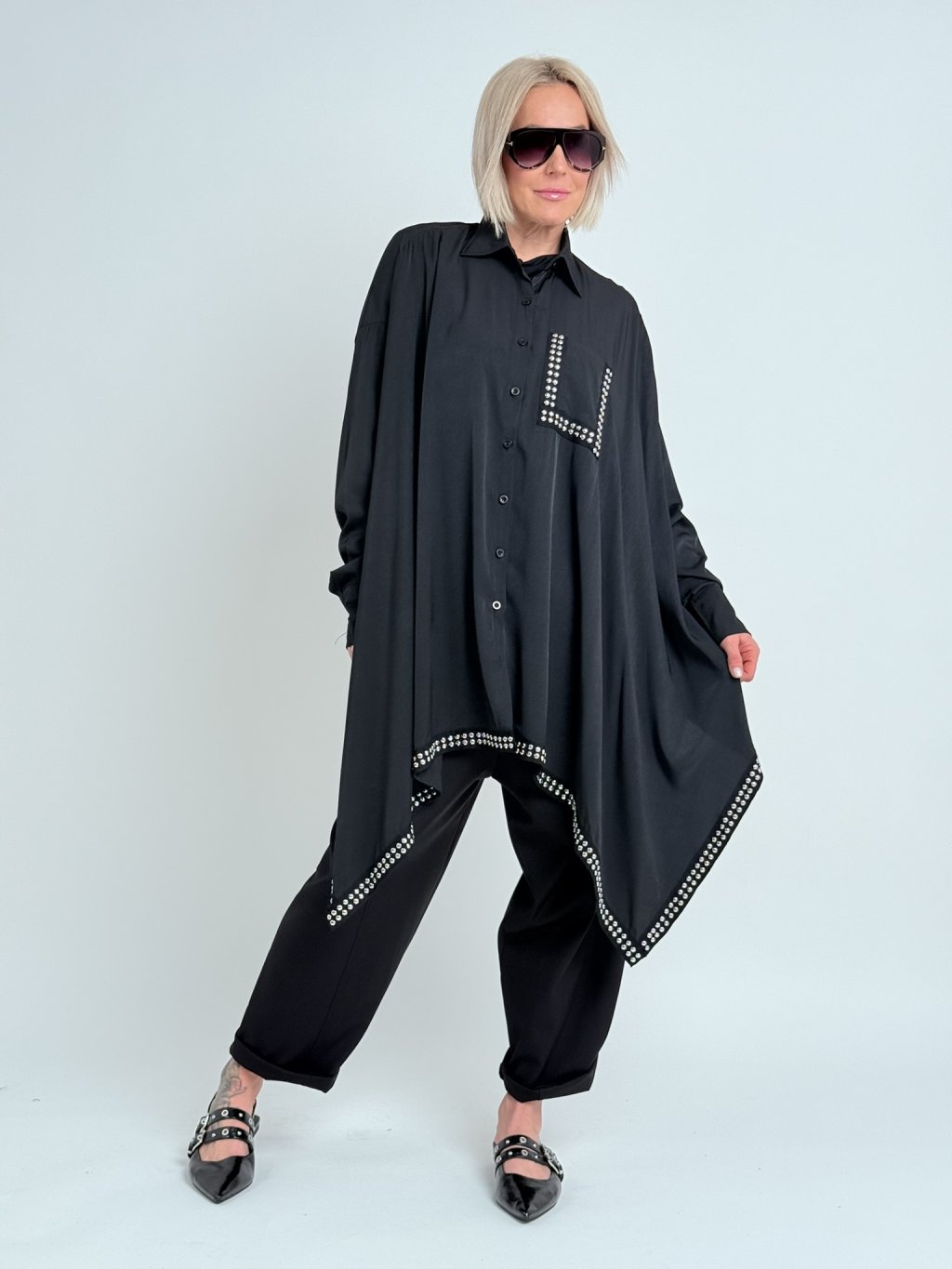 Dokonalá, oversize, asymetrická košile zdobená stříbrnými nýty..
