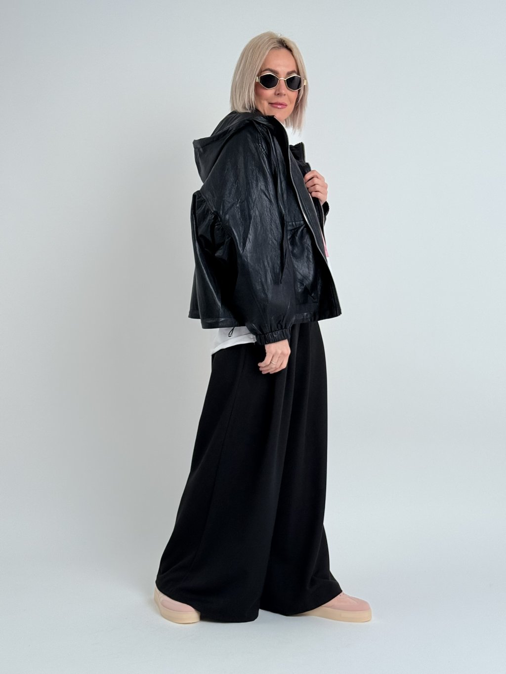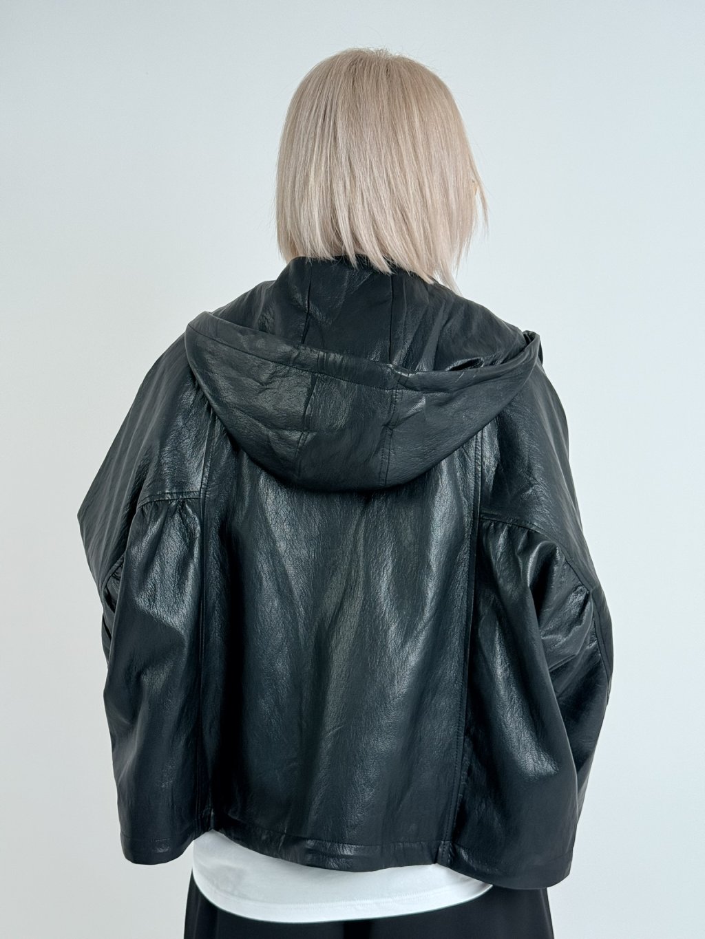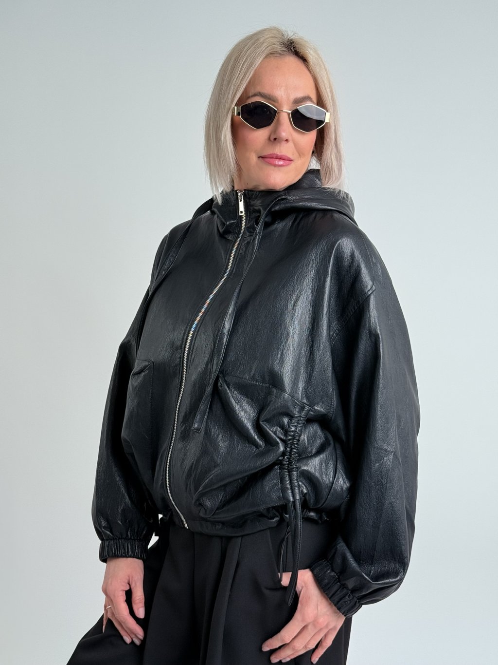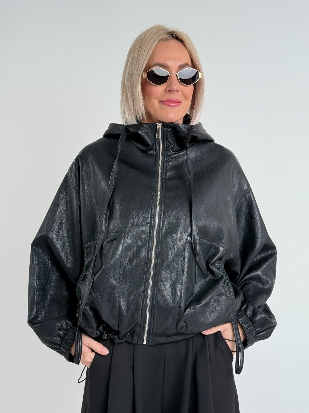 Super, oversize, koženková bunda s podšívkou a kapucí, se zapínáním na zip, v pase s možností stažení, na zádech lehce nařasená. Naprosto dokonalá.