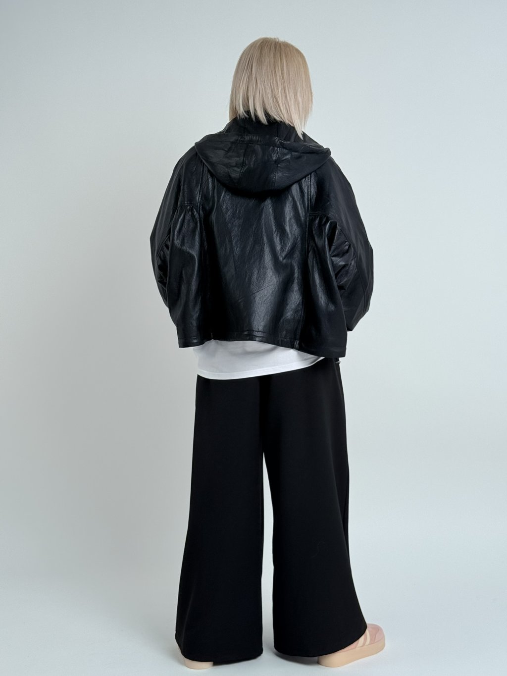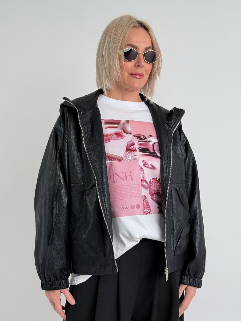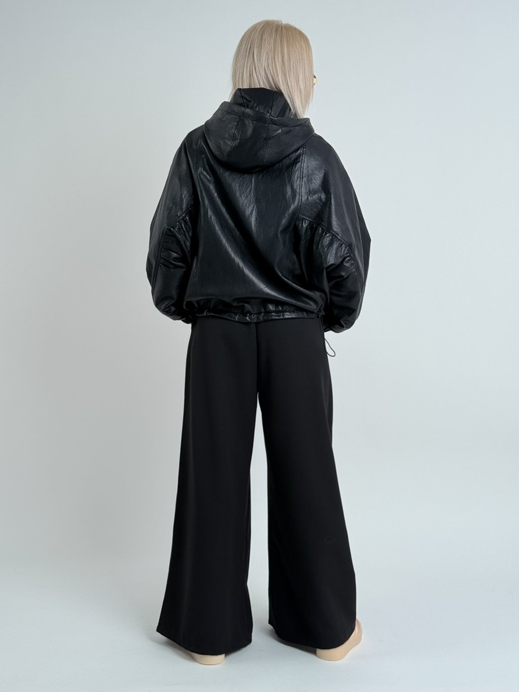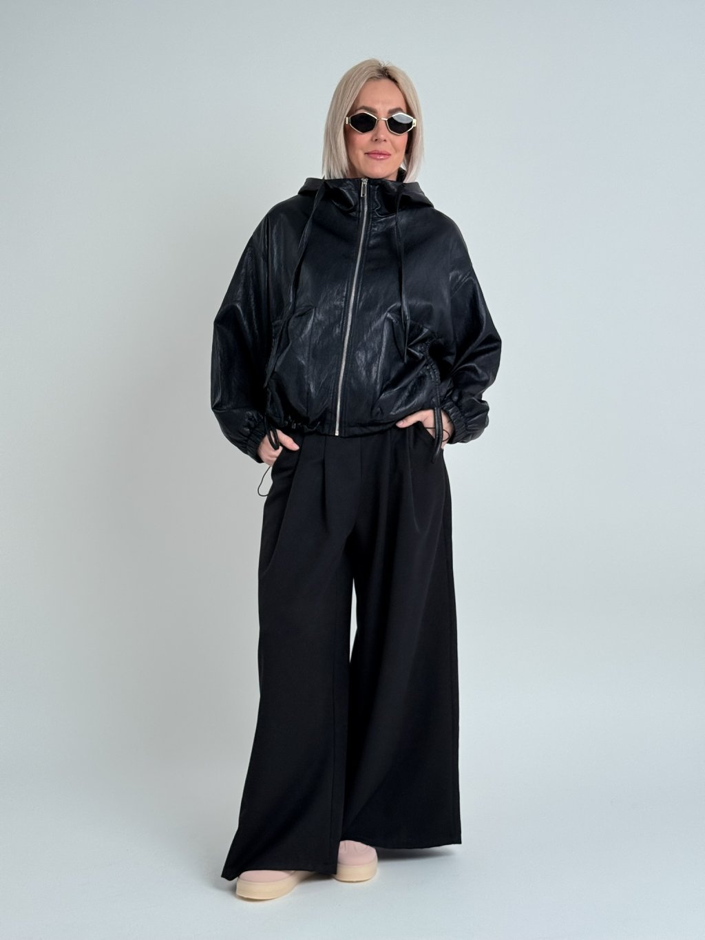 Super, oversize, koženková bunda s podšívkou a kapucí, se zapínáním na zip, v pase s možností stažení, na zádech lehce nařasená. Naprosto dokonalá.