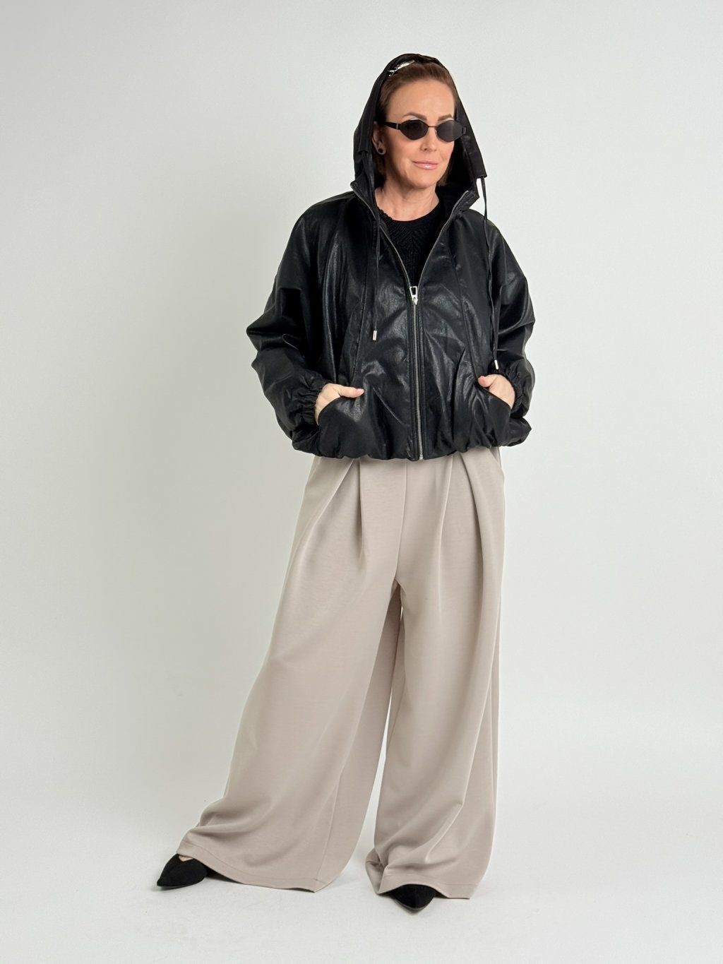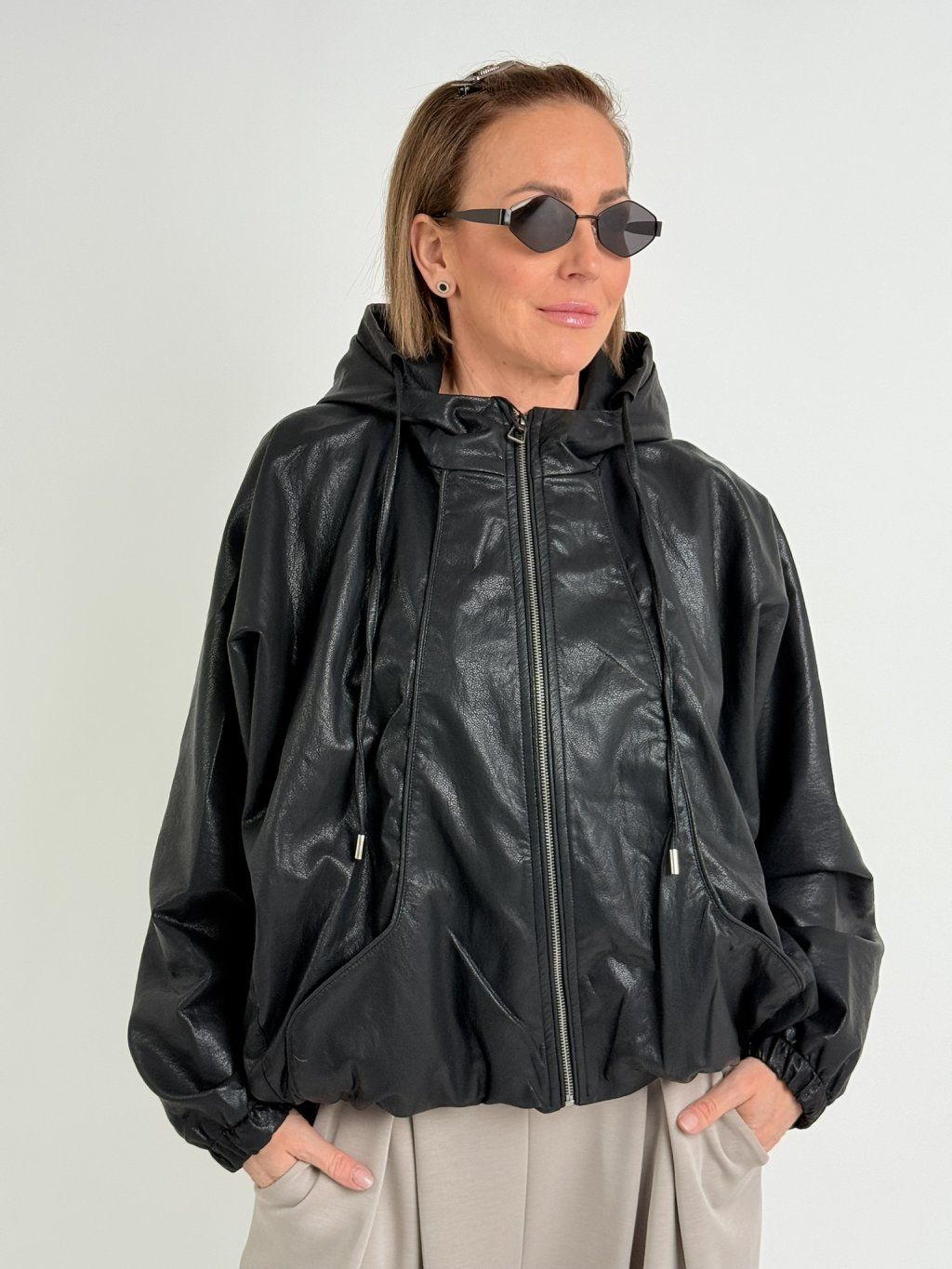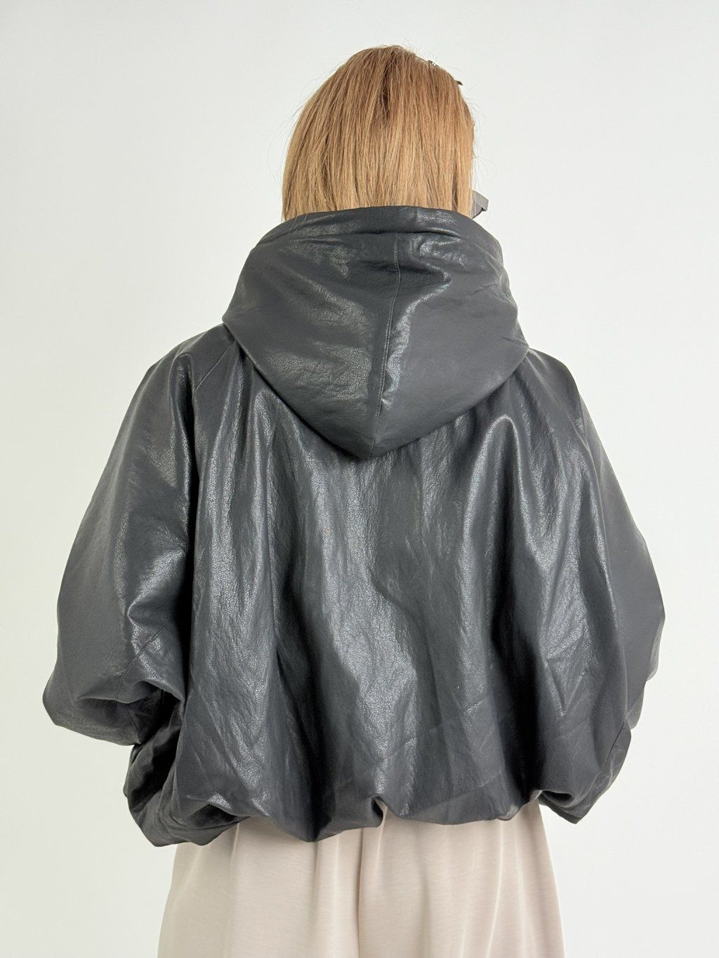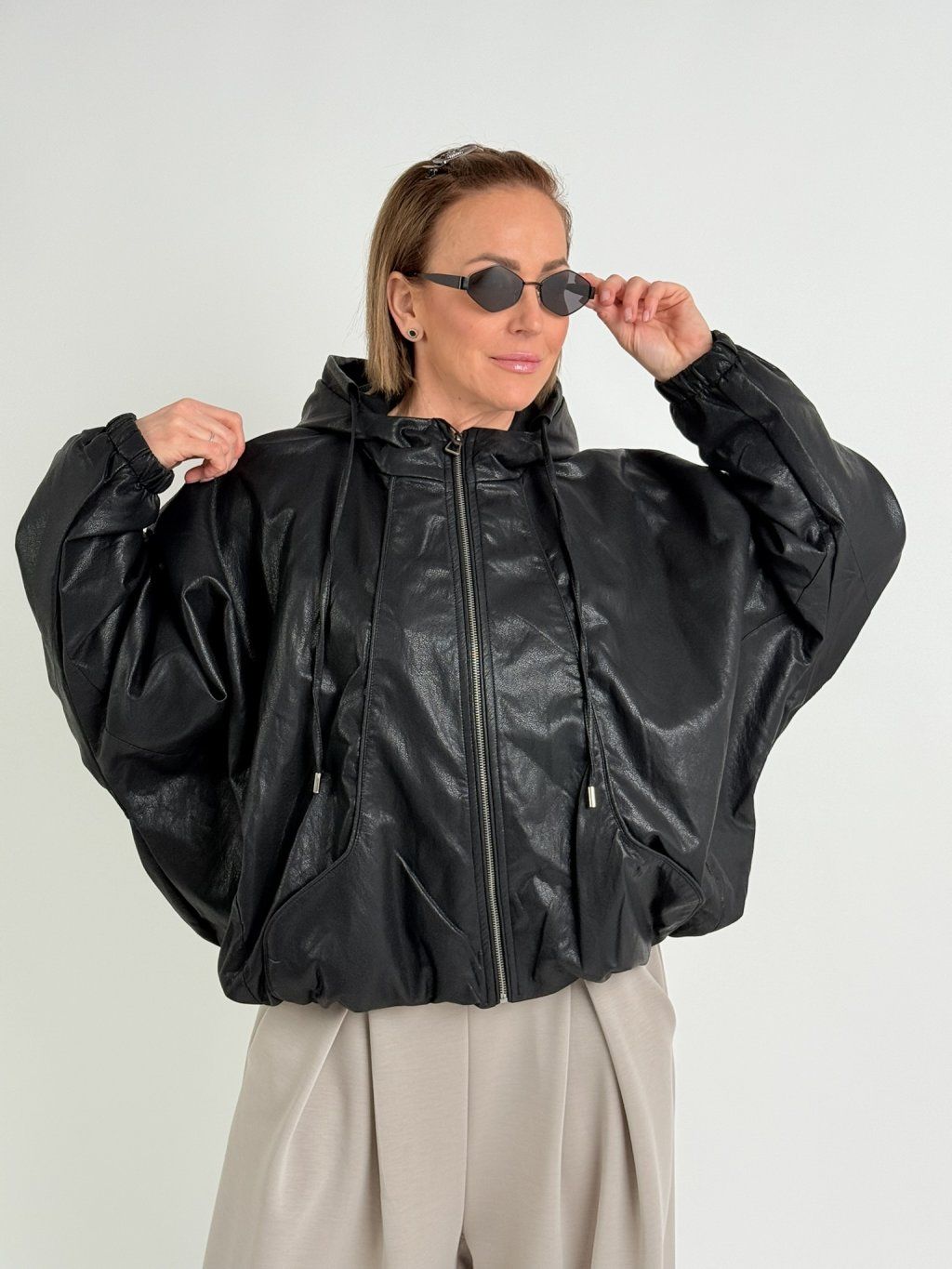 Super, oversize, koženková bunda s podšívkou a kapucí, se zapínáním na zip, v pase nařasená do gumy.