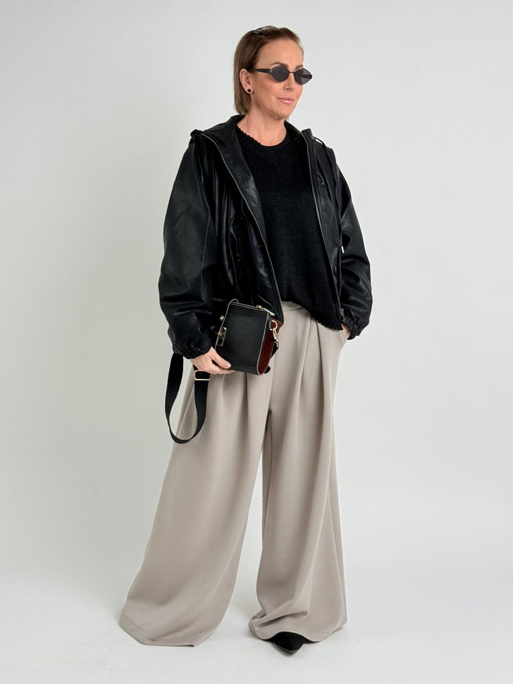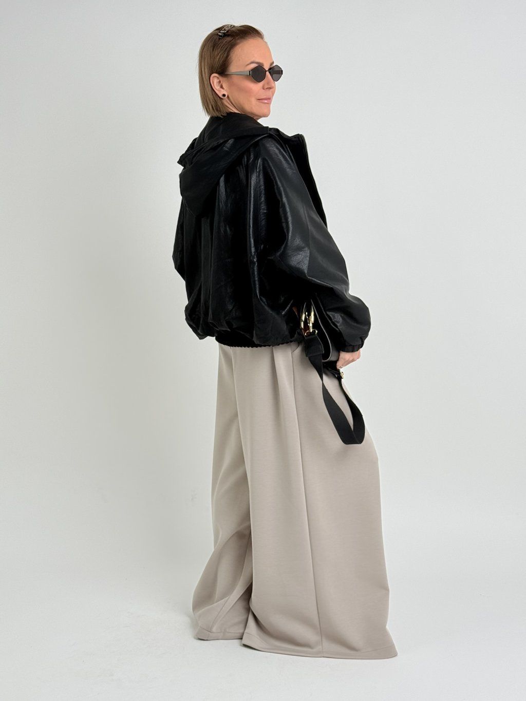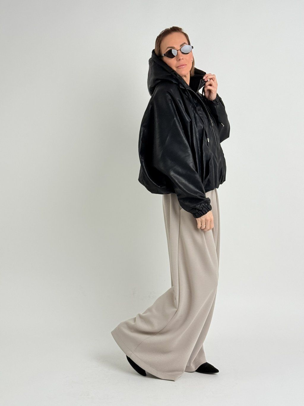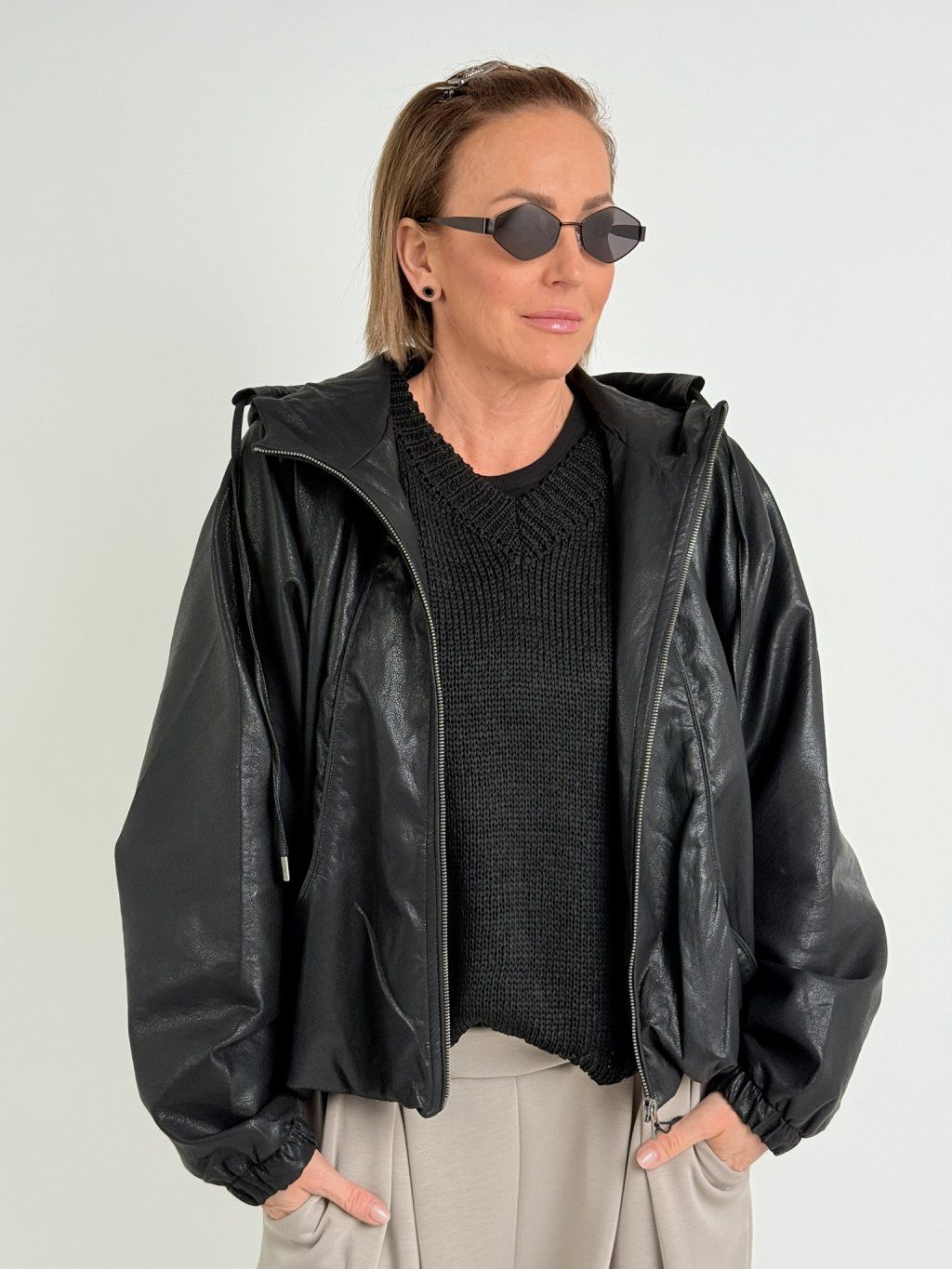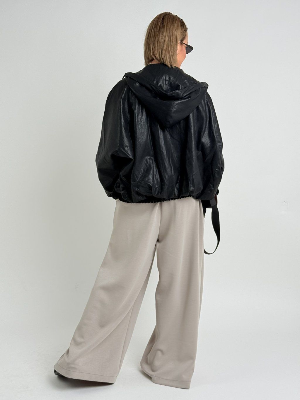 Super, oversize, koženková bunda s podšívkou a kapucí, se zapínáním na zip, v pase nařasená do gumy.