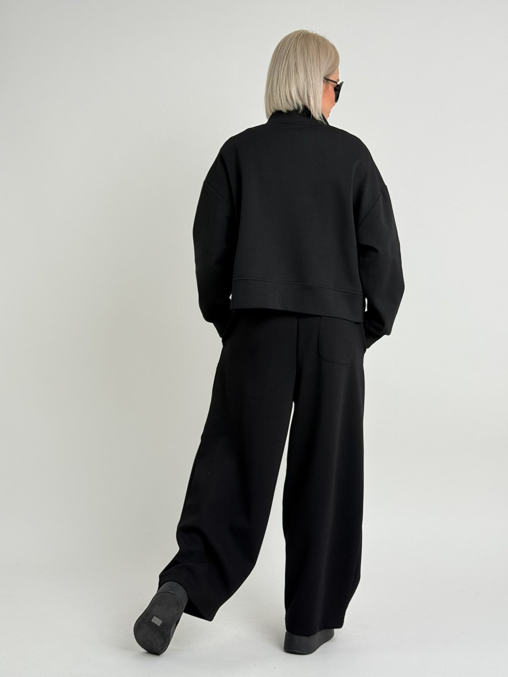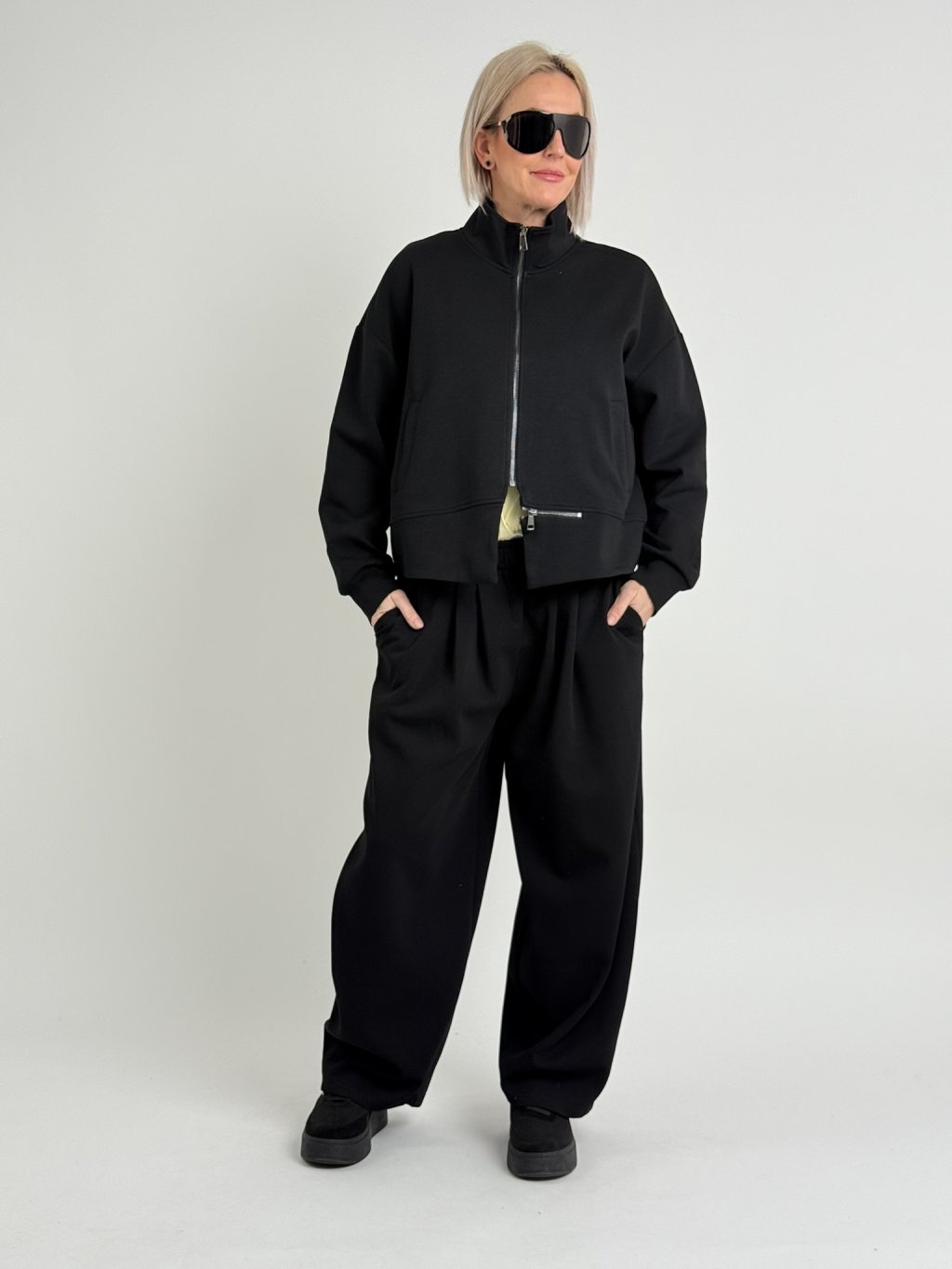 Volná, asymetrická mikina, v délce do pasu, se stojákem a zapínáním na zip, v dolní části je ještě podélný, ozdobný zip a kapsy.