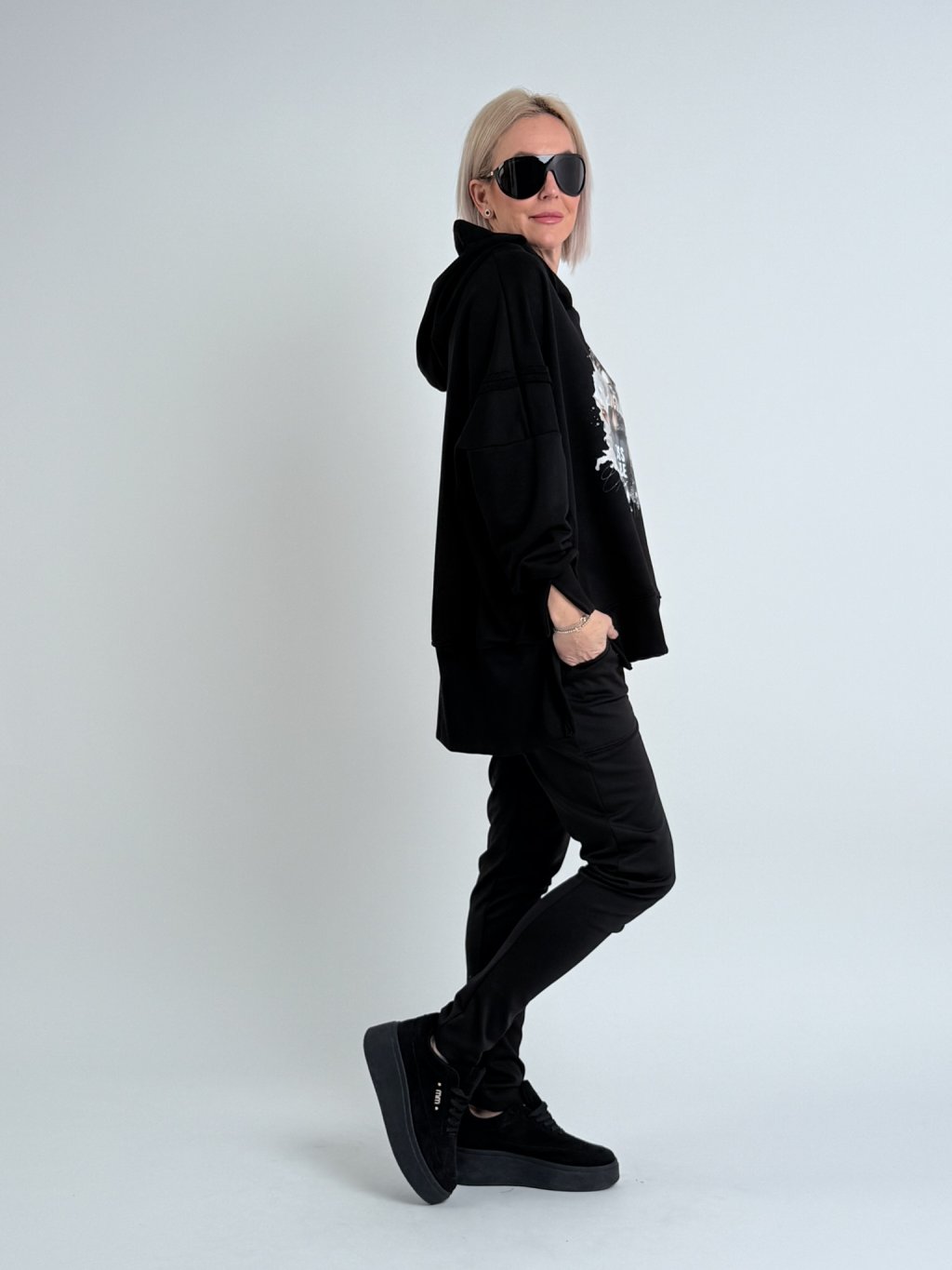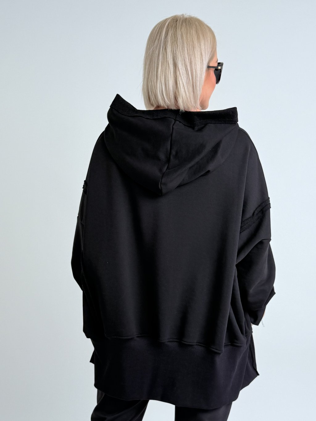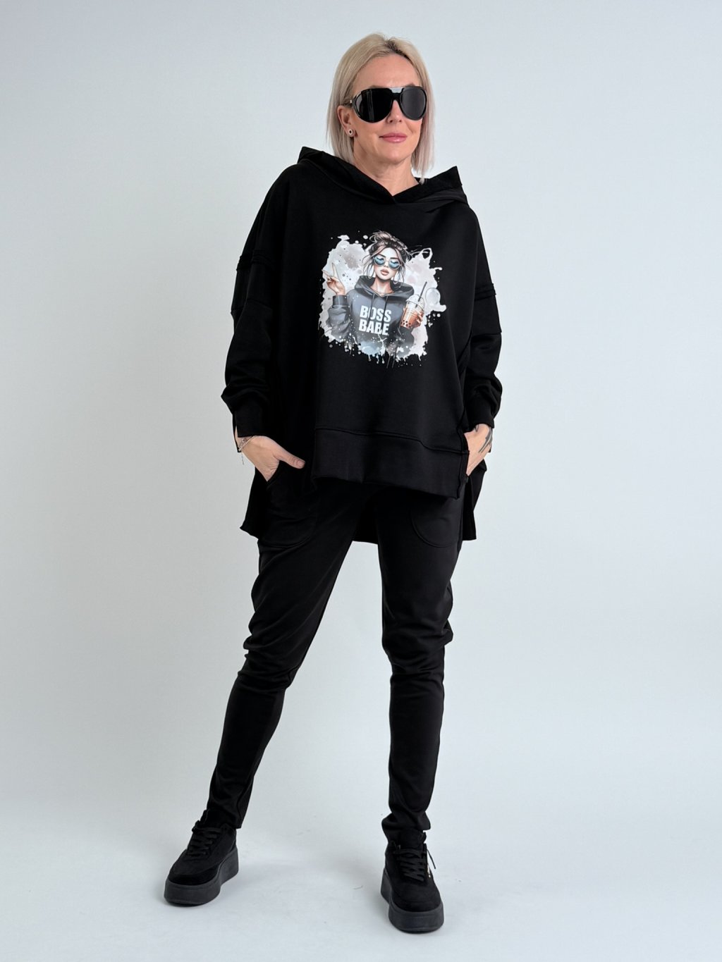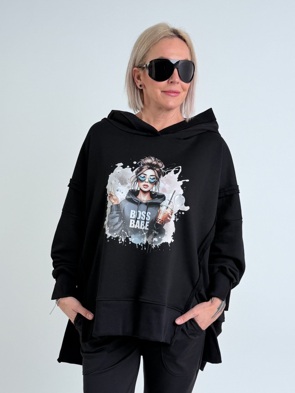 Oversize mikina s kapucí, náplety na rukávech a na dolním kraji mikiny, kde jsou také rozparky. Na předním dílu je pogumovaný obrázek.