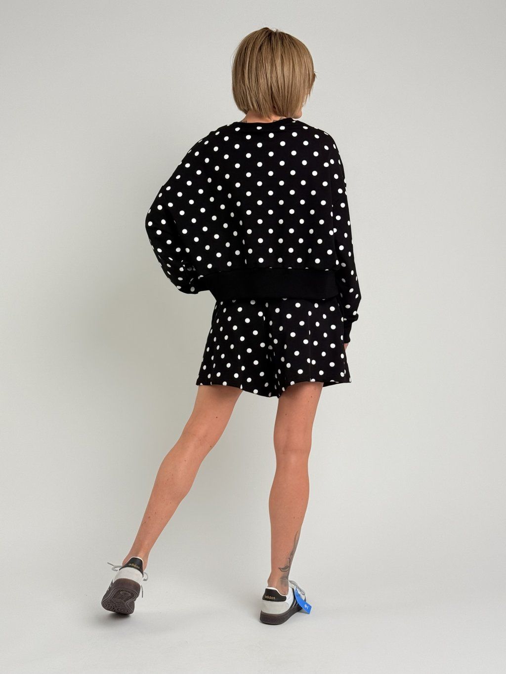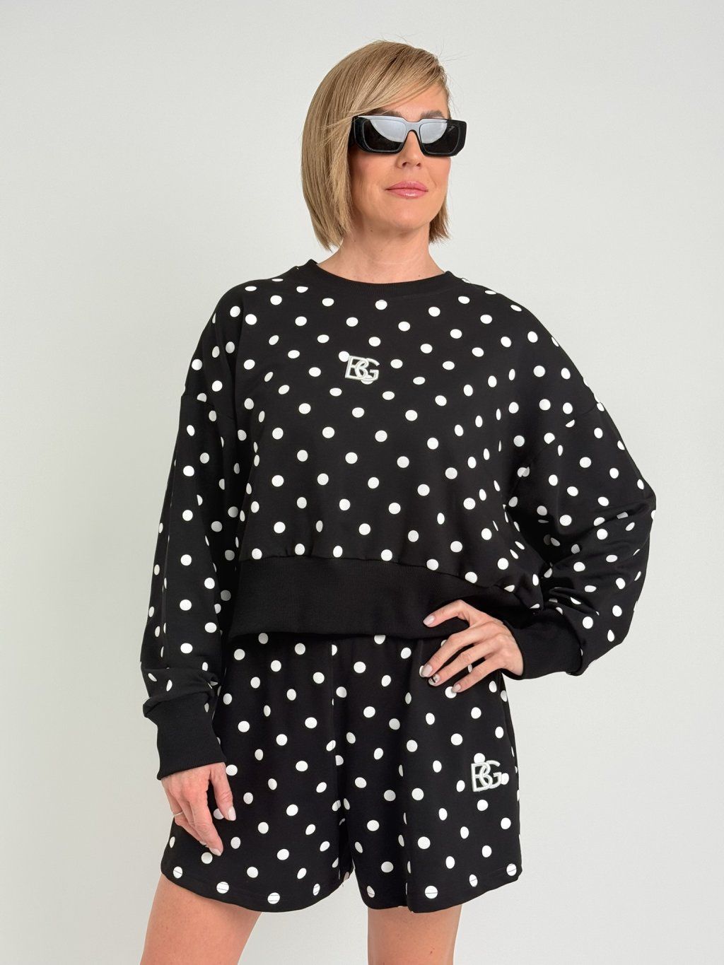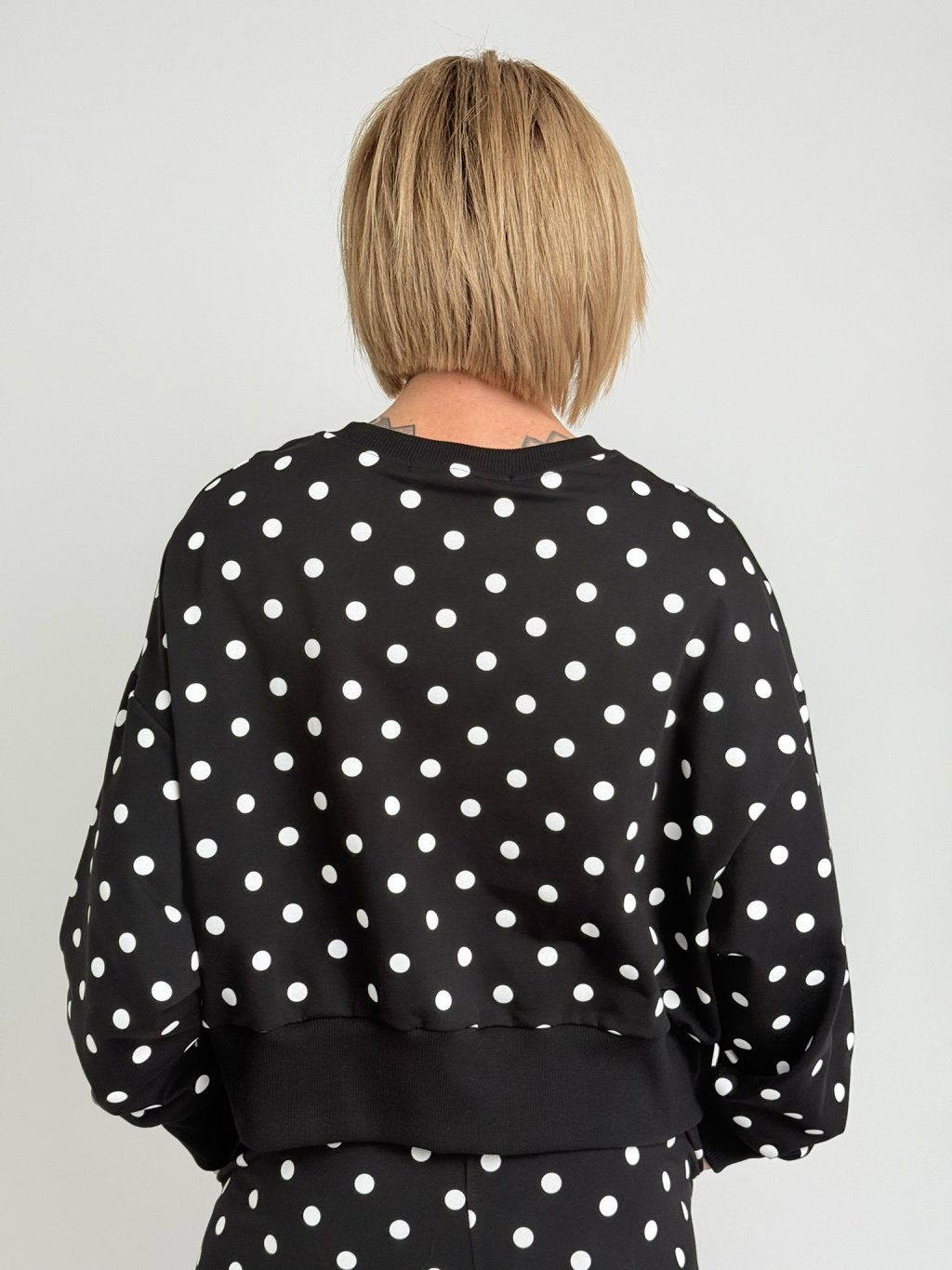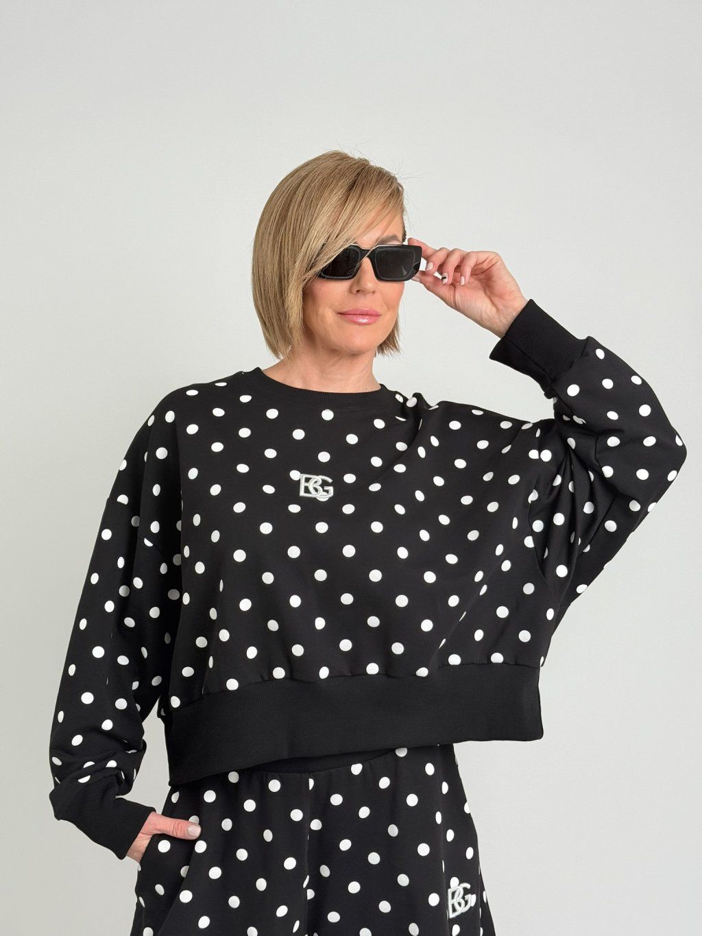 Oversize mikina s kapucí, náplety na rukávech a na dolním kraji mikiny, kde jsou také rozparky. Na předním dílu je pogumovaný obrázek.
