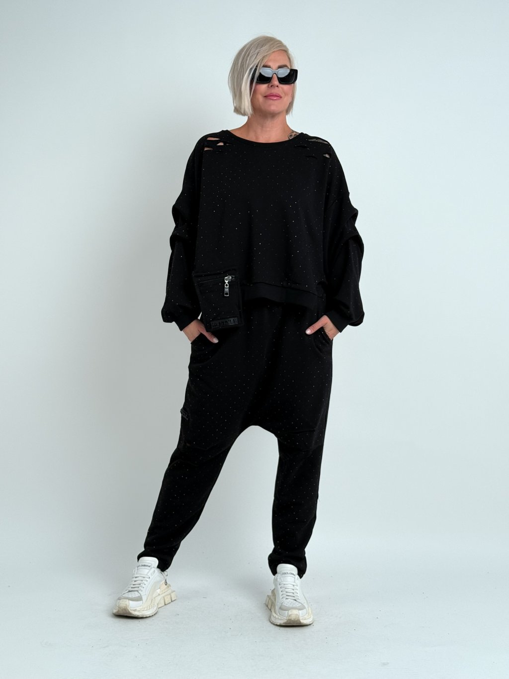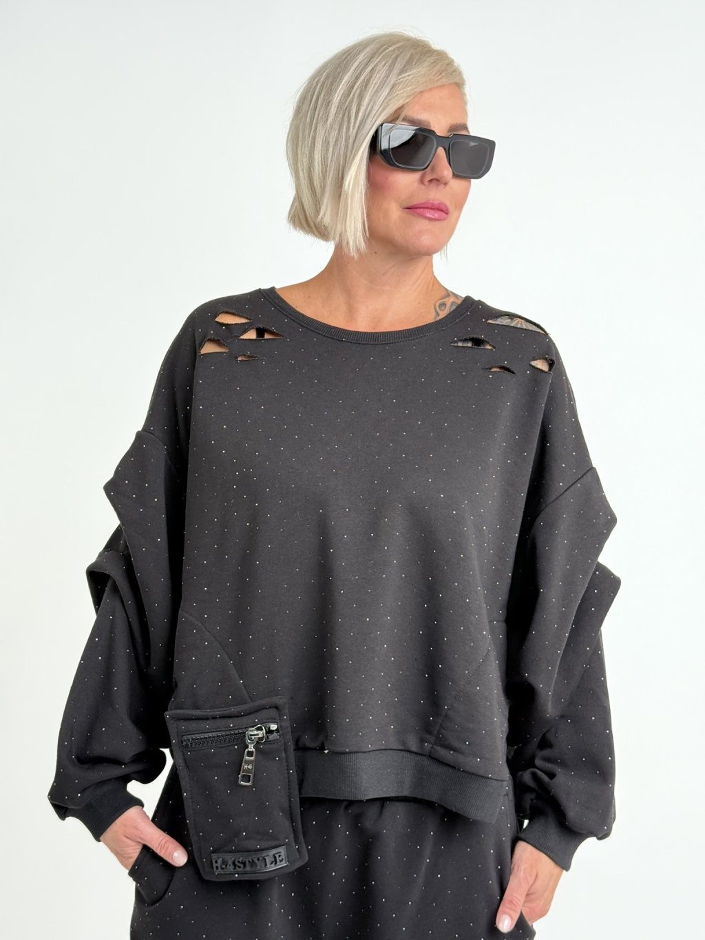 Super mikina s dlouhým rukávem, zajímavě řešeným dolním krajem, který zdobí kapsa se zipem. Celou mikinu zdobí průstřihy a drobné kamínky. MĚŘTE, TOPY ODPOVÍDAJÍ VĚTŠÍM VELIKOSTEM.