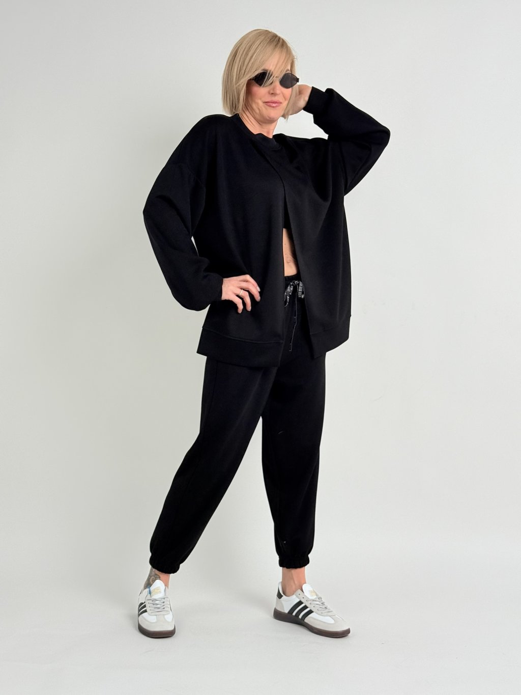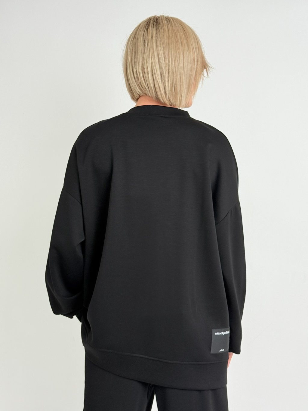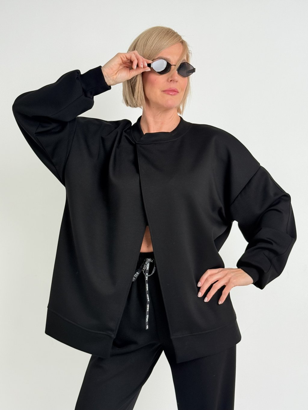Oversize mikina s rozevíratelným předním dílem, s náplety u krku a na koncích rukávů.