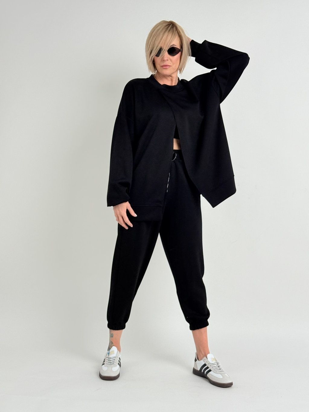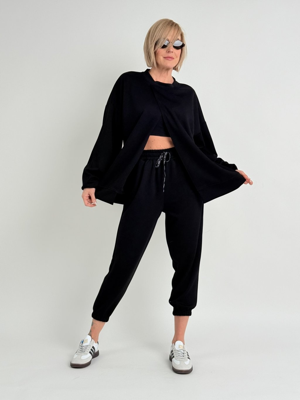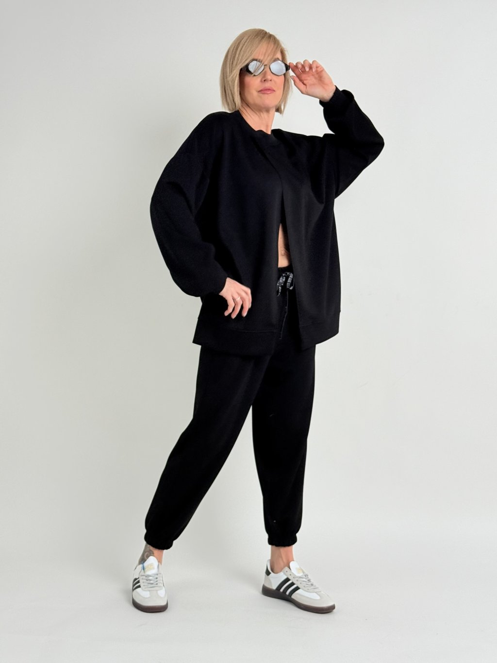 Oversize mikina s rozevíratelným předním dílem, s náplety u krku a na koncích rukávů.
