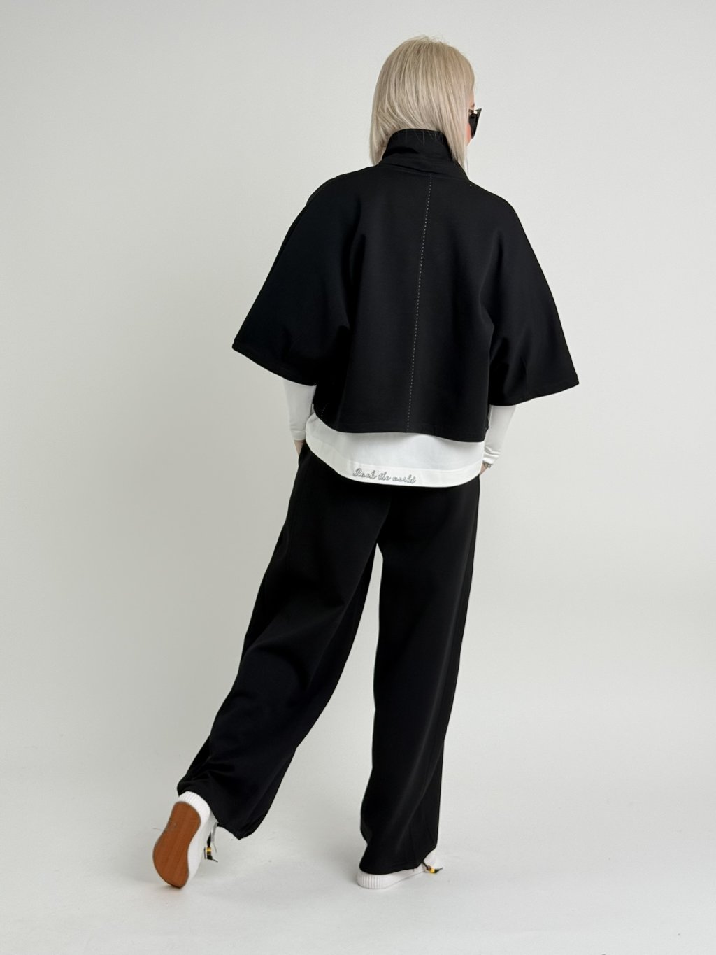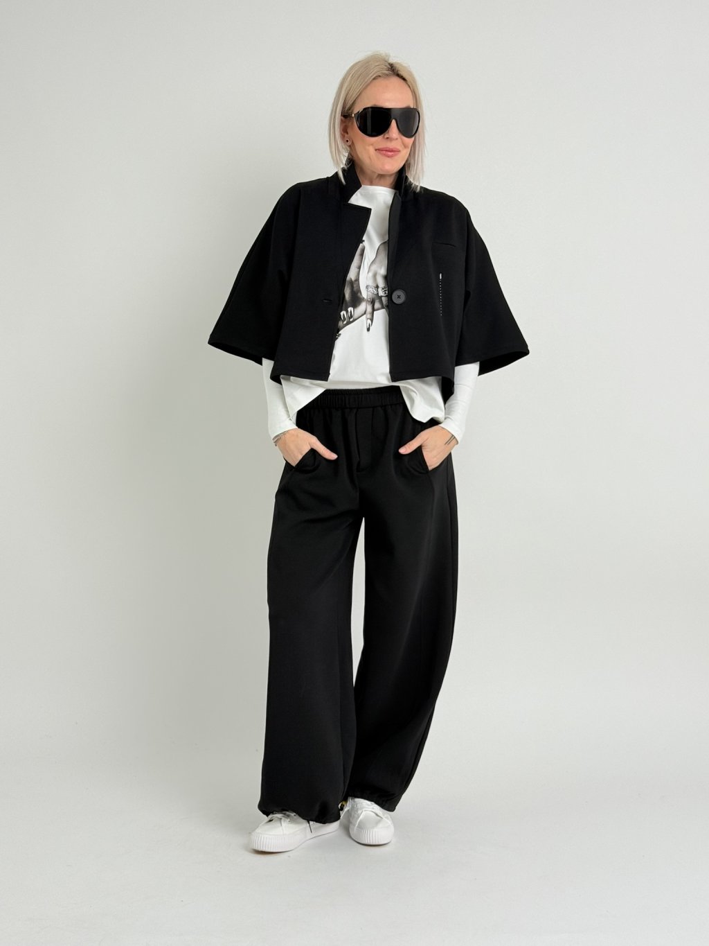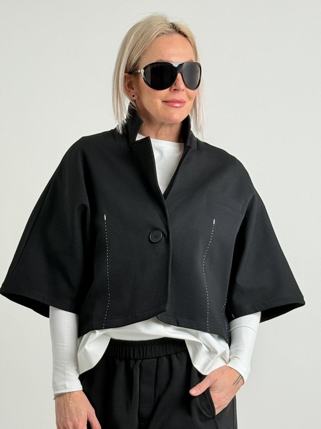Mikinový kabátek v oversize střihu, s klopami, se zapínáním na jeden knoflík a 3/4 , širokým rukávem.