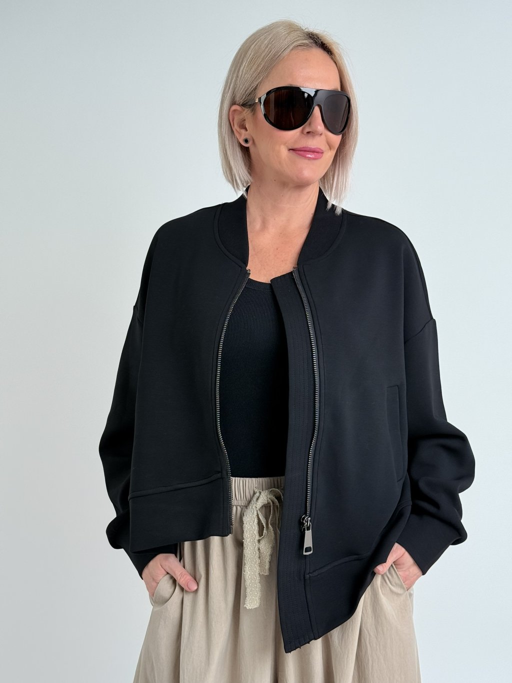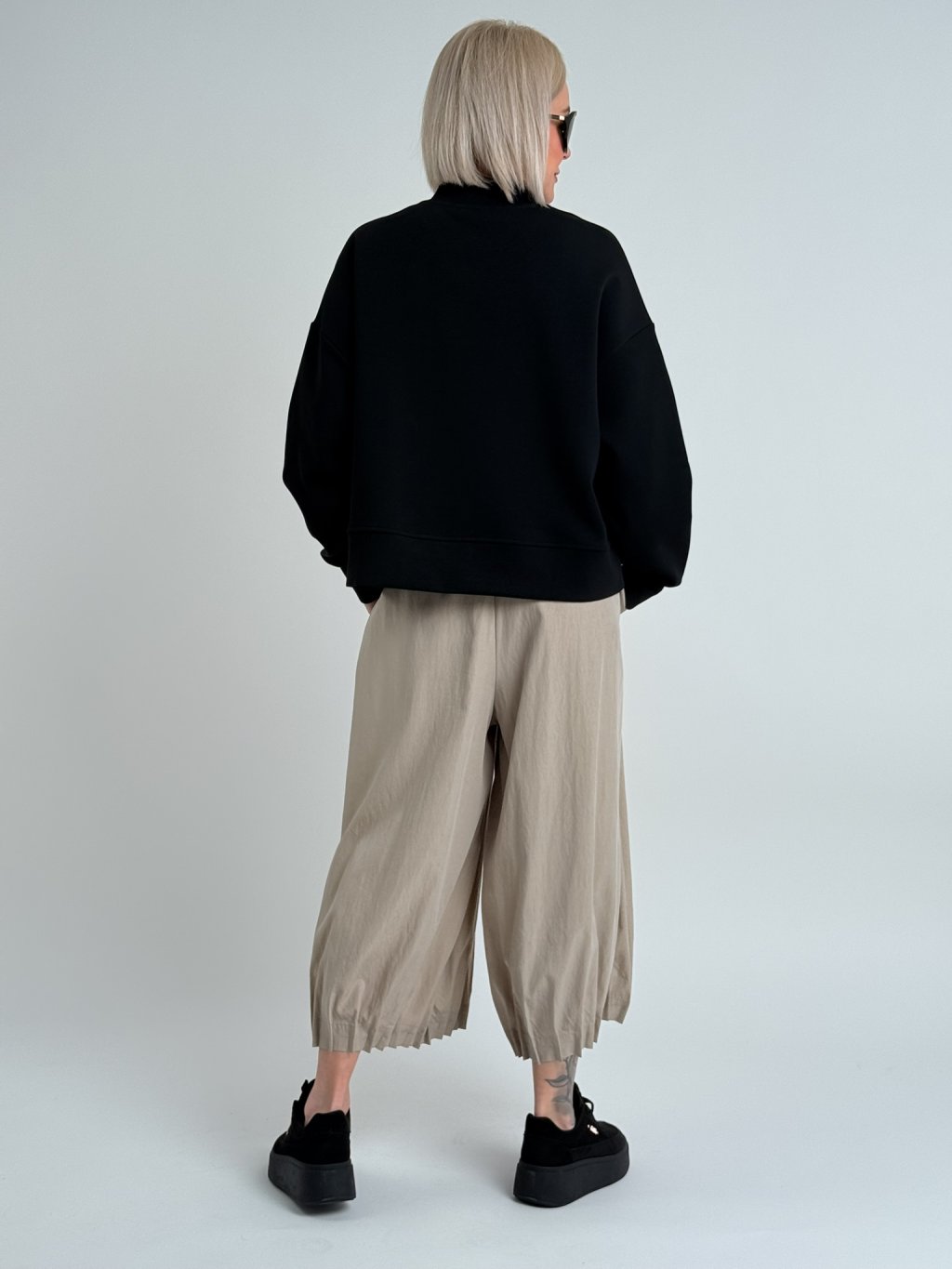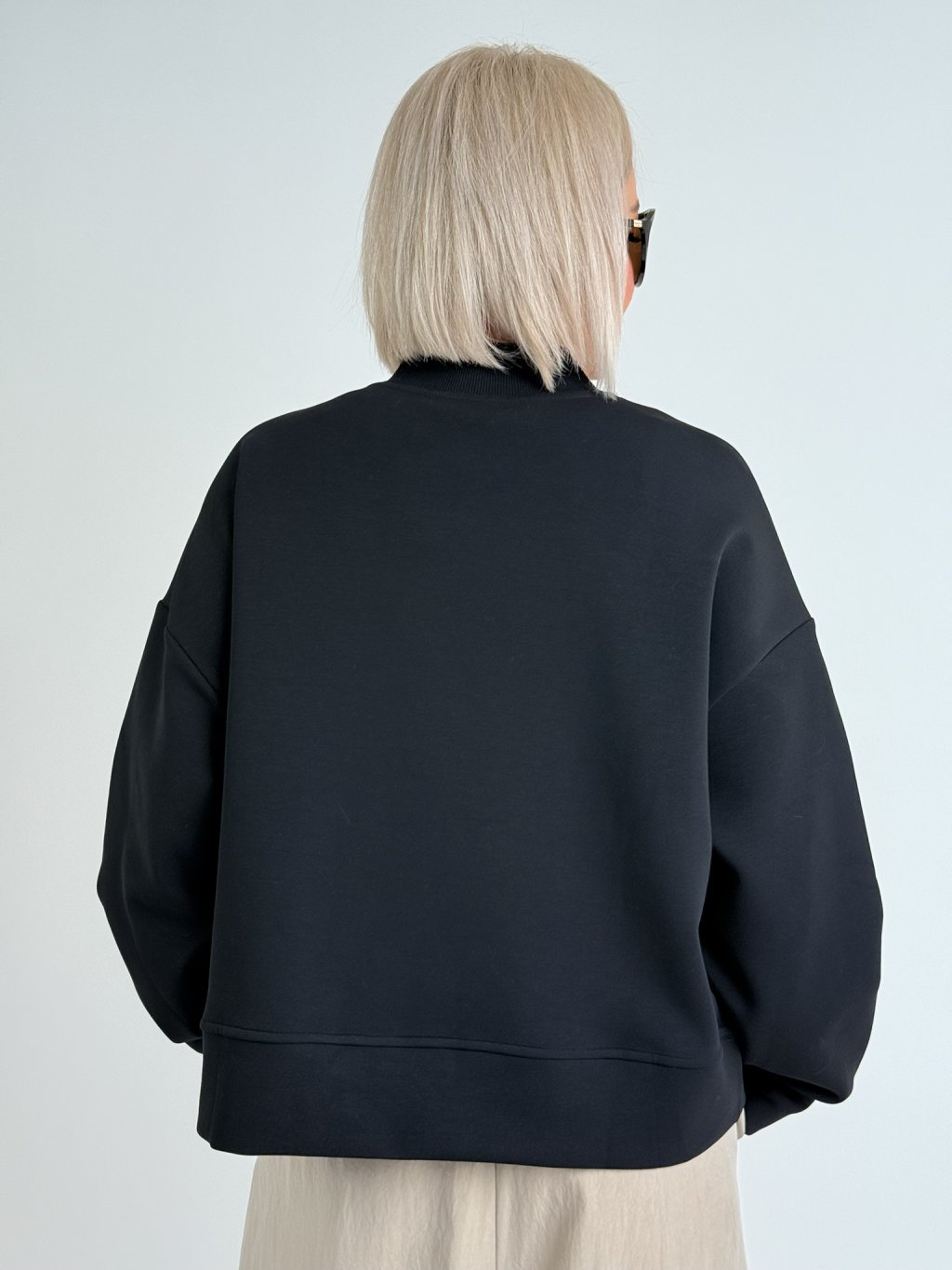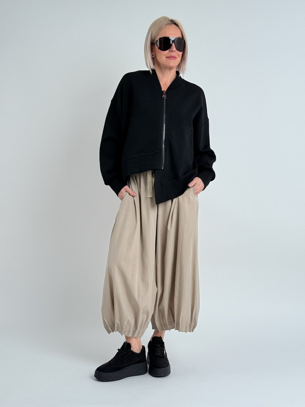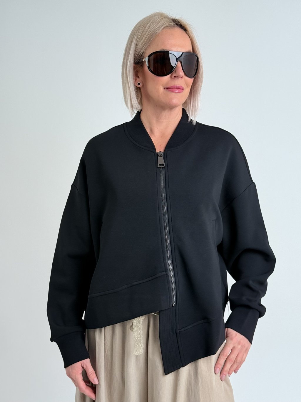 Volná, asymetrická mikina, s jedním delším cípem,  zapínáním na zip, s kapsami a nápletem u krku.