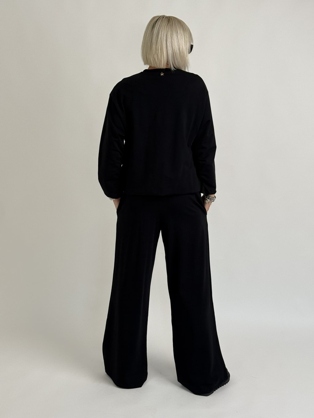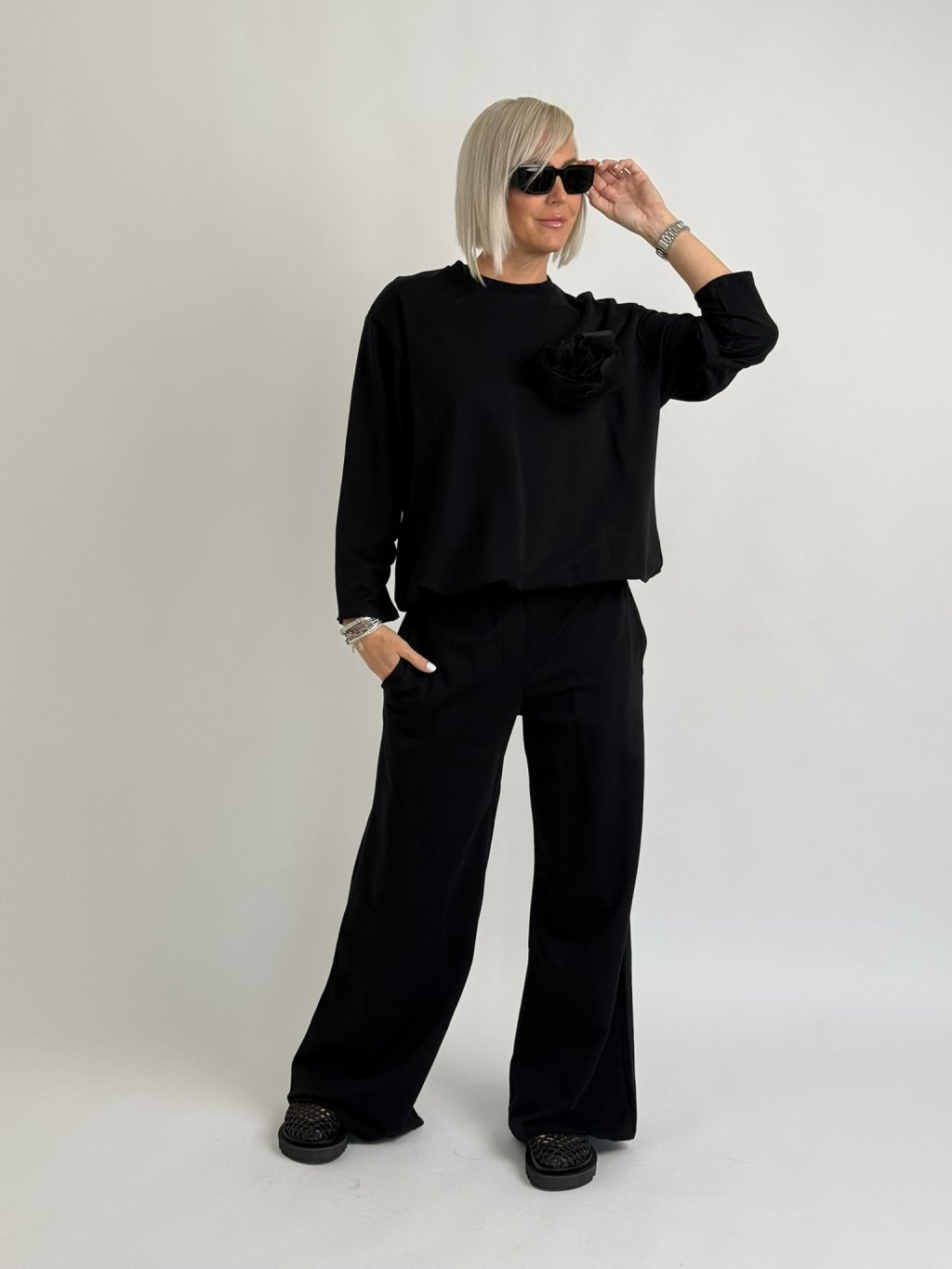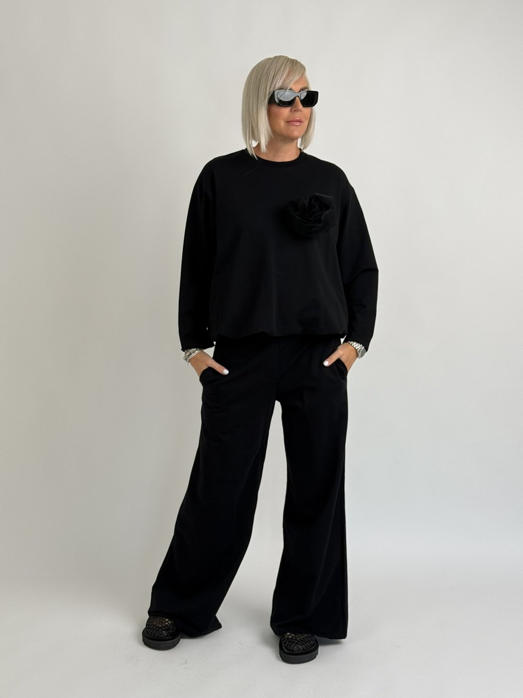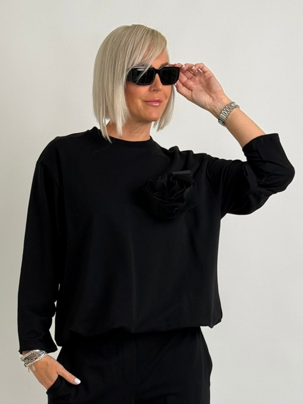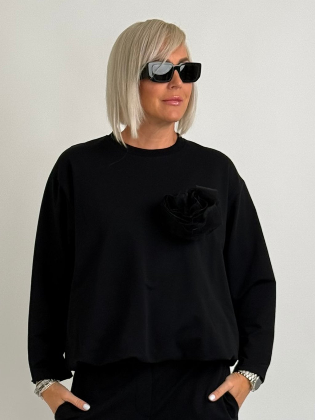 Super, oversize mikina s tylovou podšívkou, v dolním kraji do gumy, s odepínací aplikací květu na předním dílu a rukávy lehce staženými gumičkou.