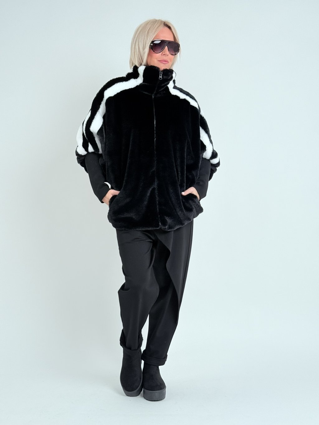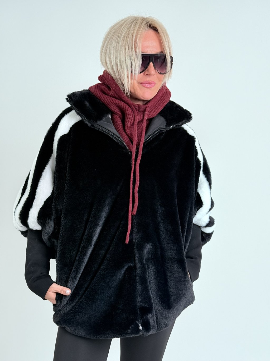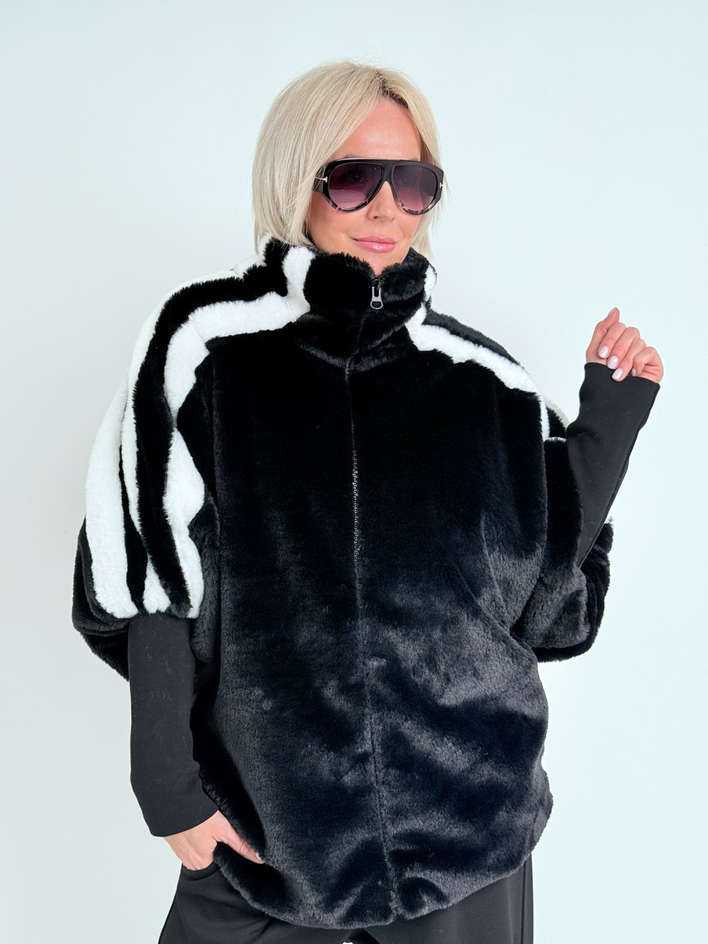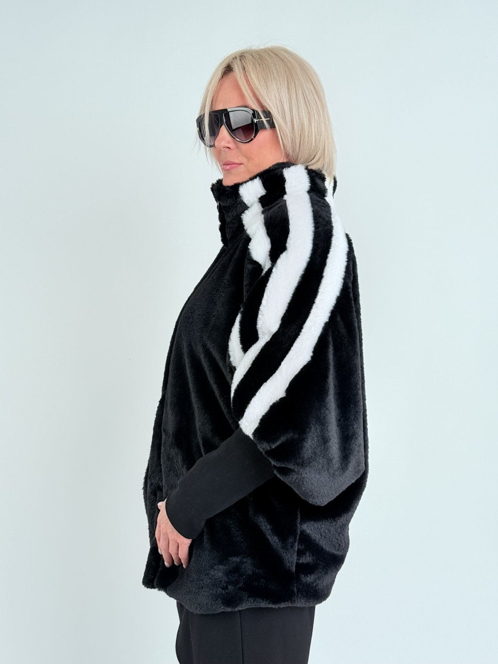 Super, oversize, plyšová bunda v netopýřím střihu, s podšívkou, se zapínáním na zip, vysokým stojákem a bílými pruhy na rukávech, zakončenými vysokým nápletem.