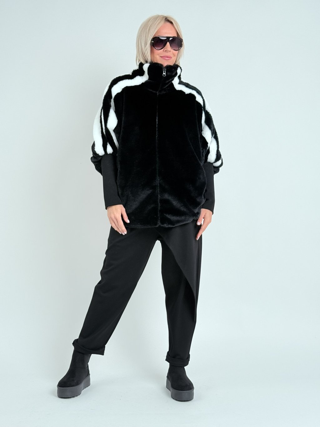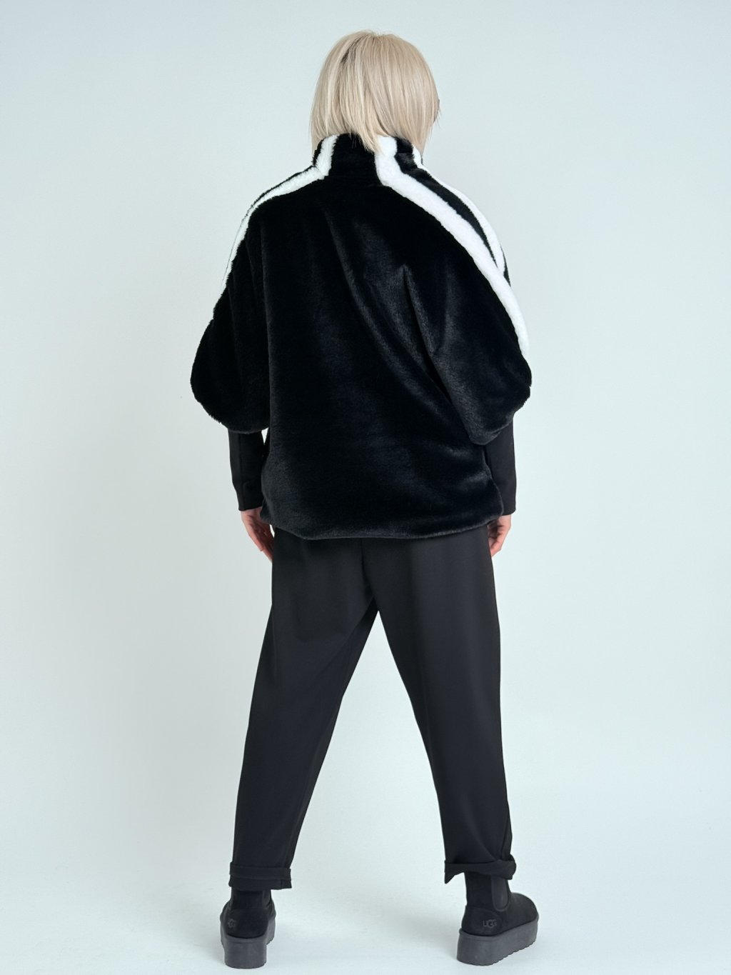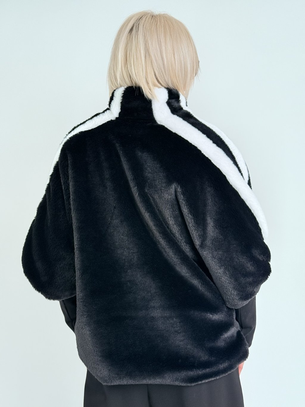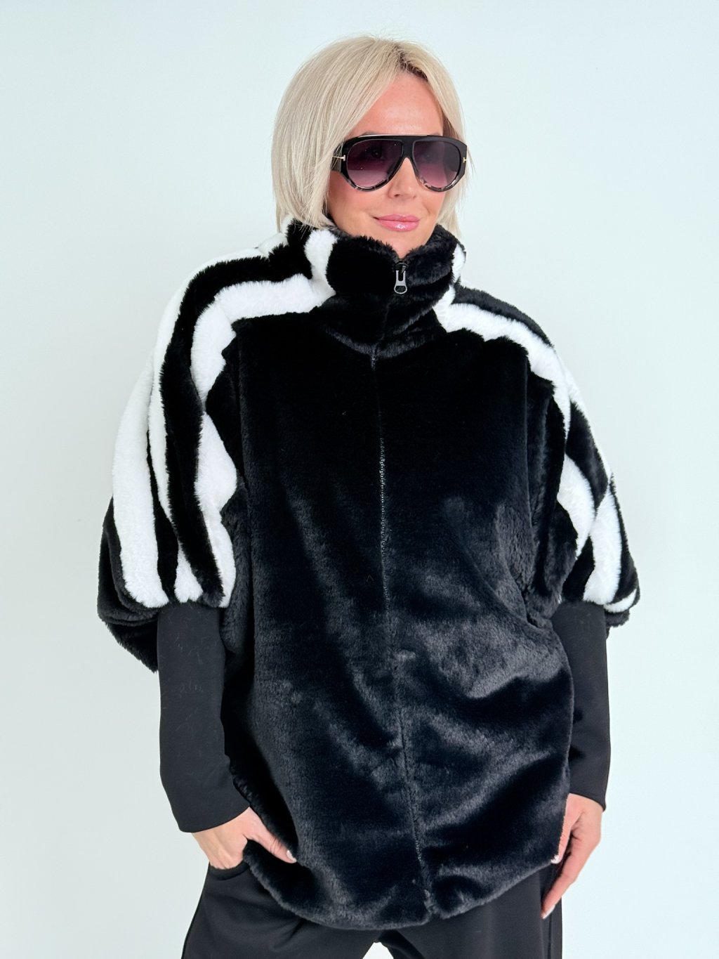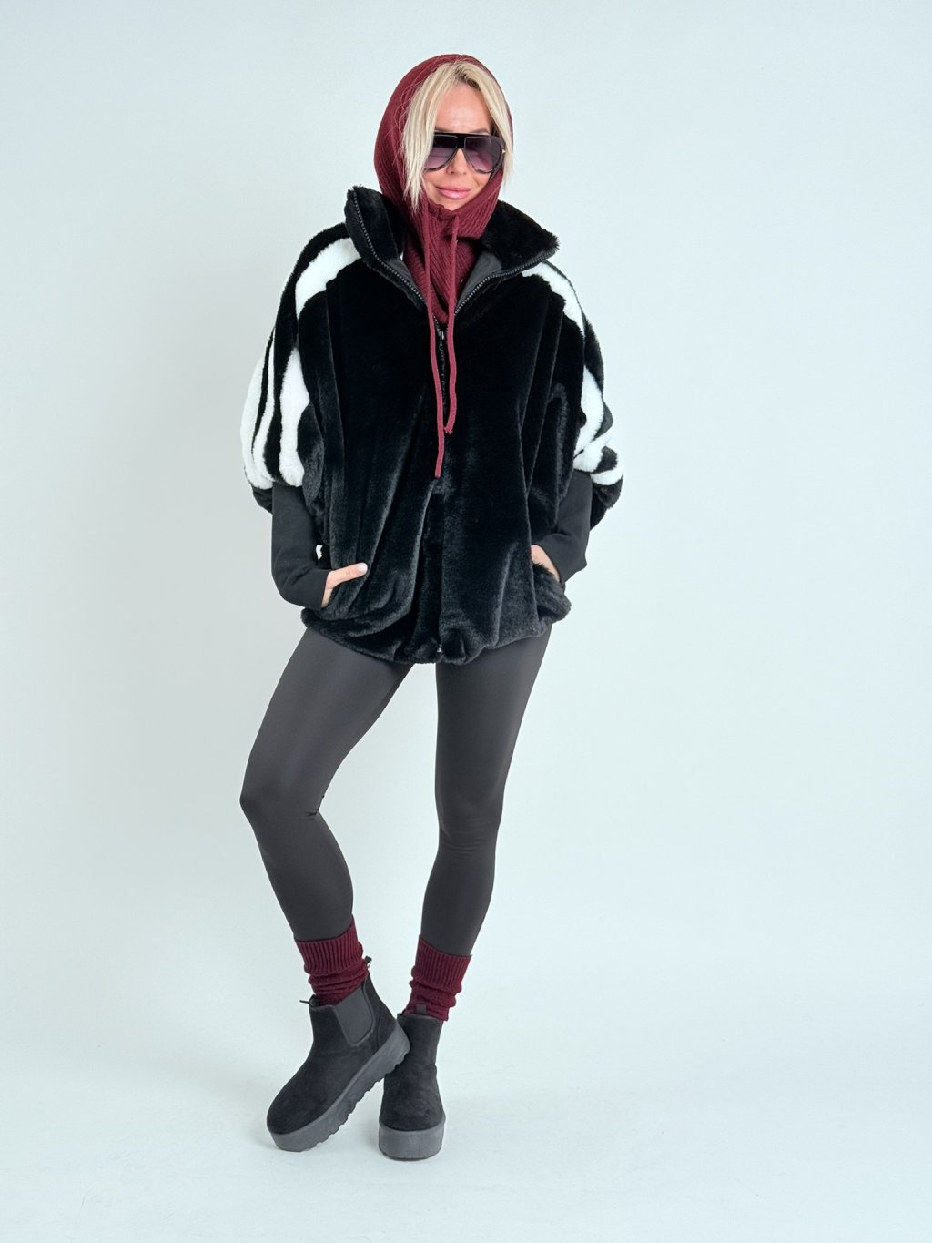 Super, oversize, plyšová bunda v netopýřím střihu, s podšívkou, se zapínáním na zip, vysokým stojákem a bílými pruhy na rukávech, zakončenými vysokým nápletem.