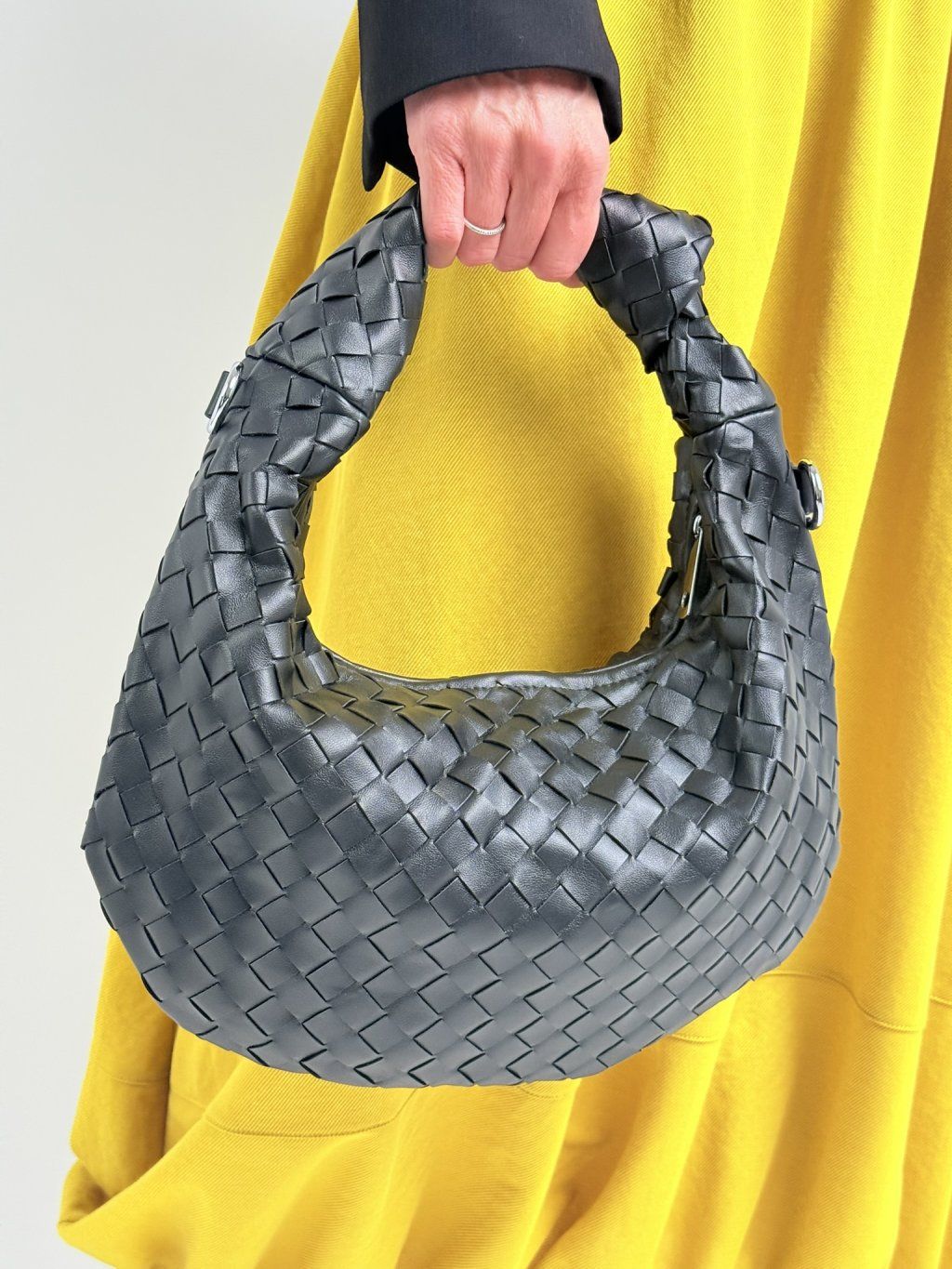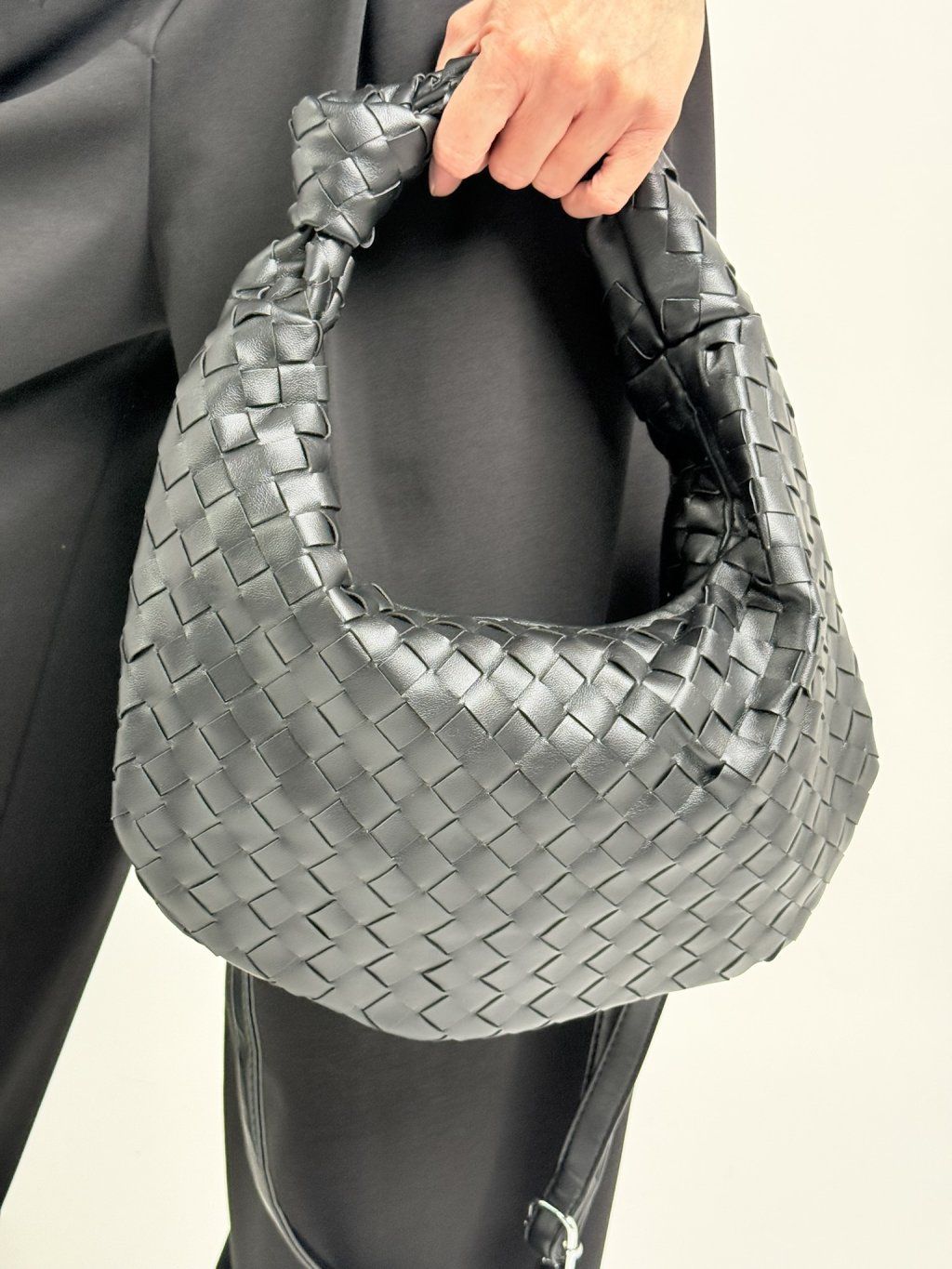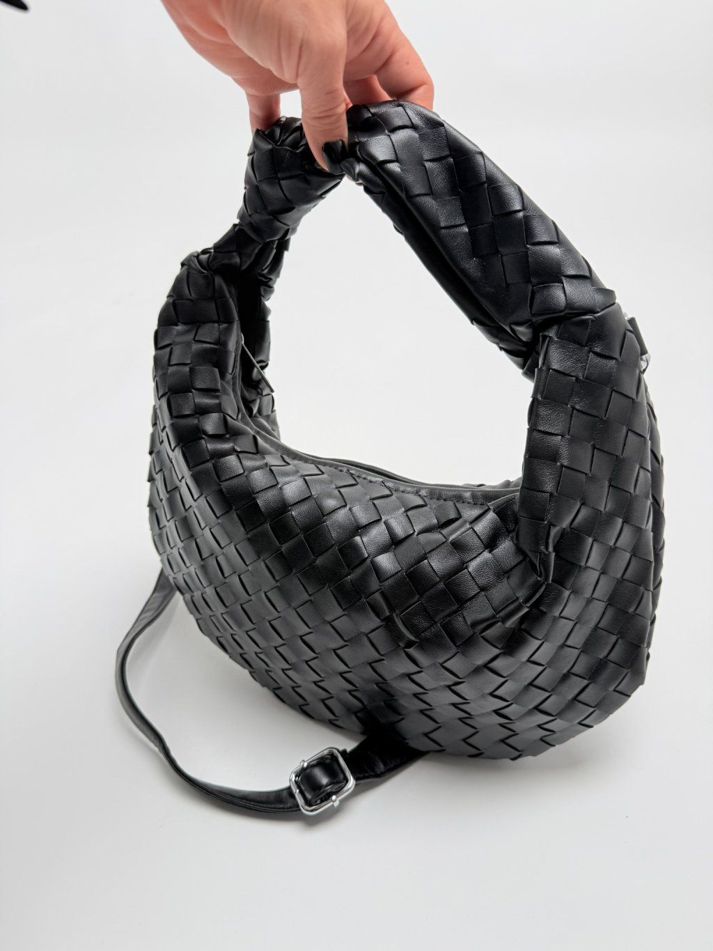 Proplétaná kabelka ve tvaru ledvinky, se zapínáním na zip, s kratším uchem a dlouhým popruhem, díky kterému lze kabelku nosit jako crossbody.
