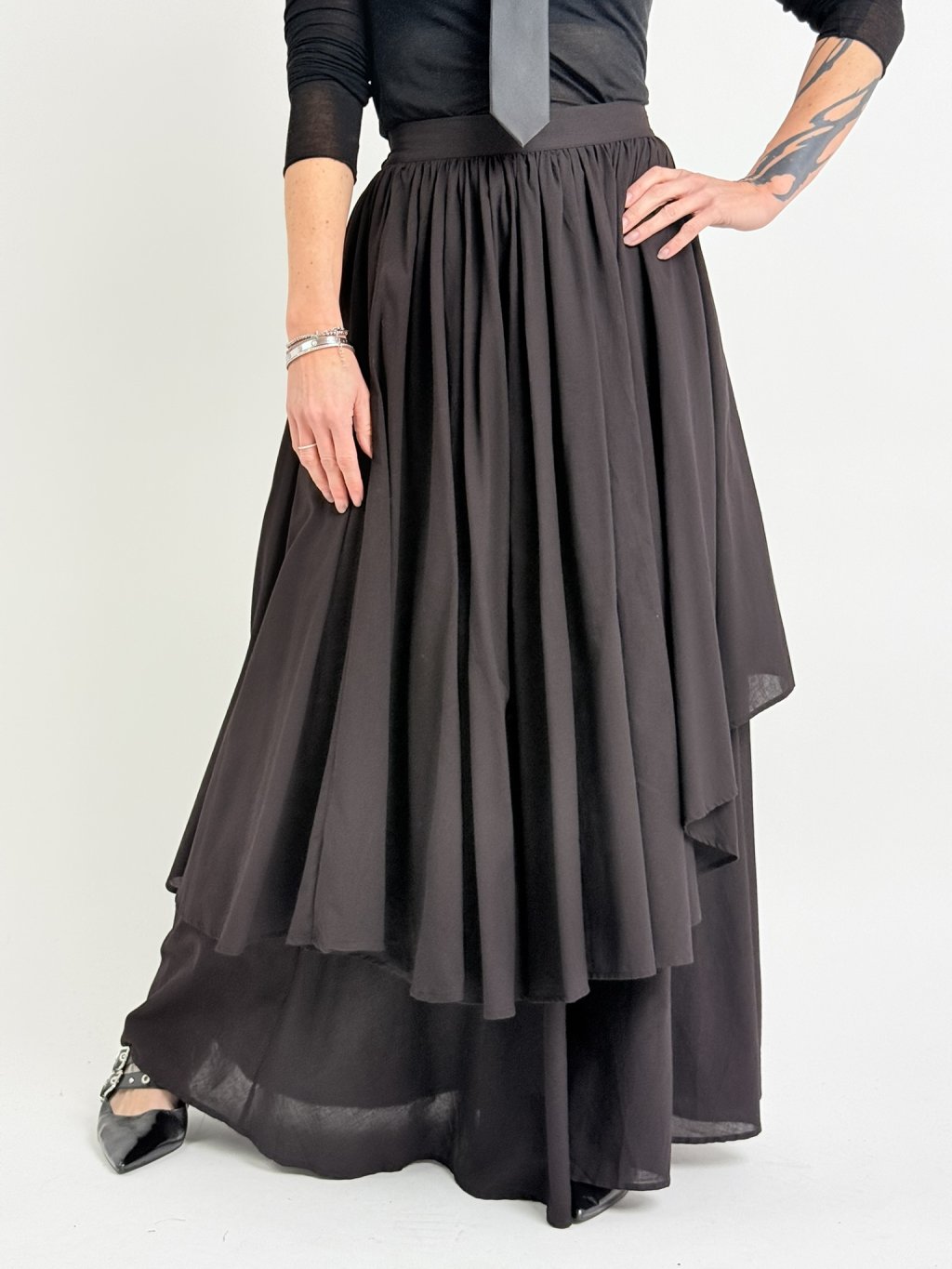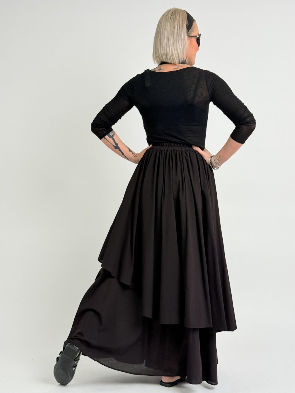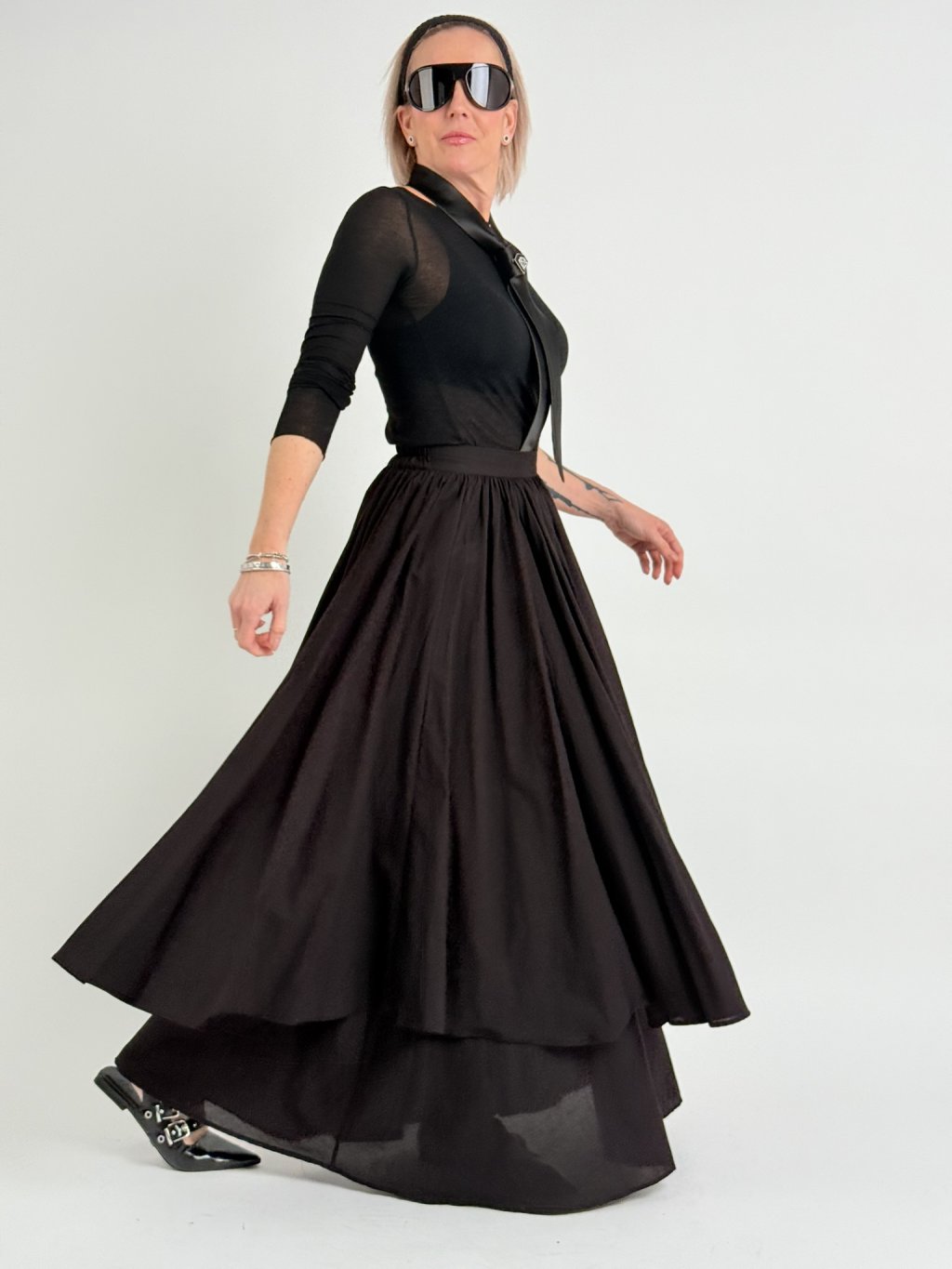 Dlouhá,  kolová, lehká, dvojitá sukně se spodní sukní delší, vrchní kratší, v zadní části pasu do gumy, se zipem.